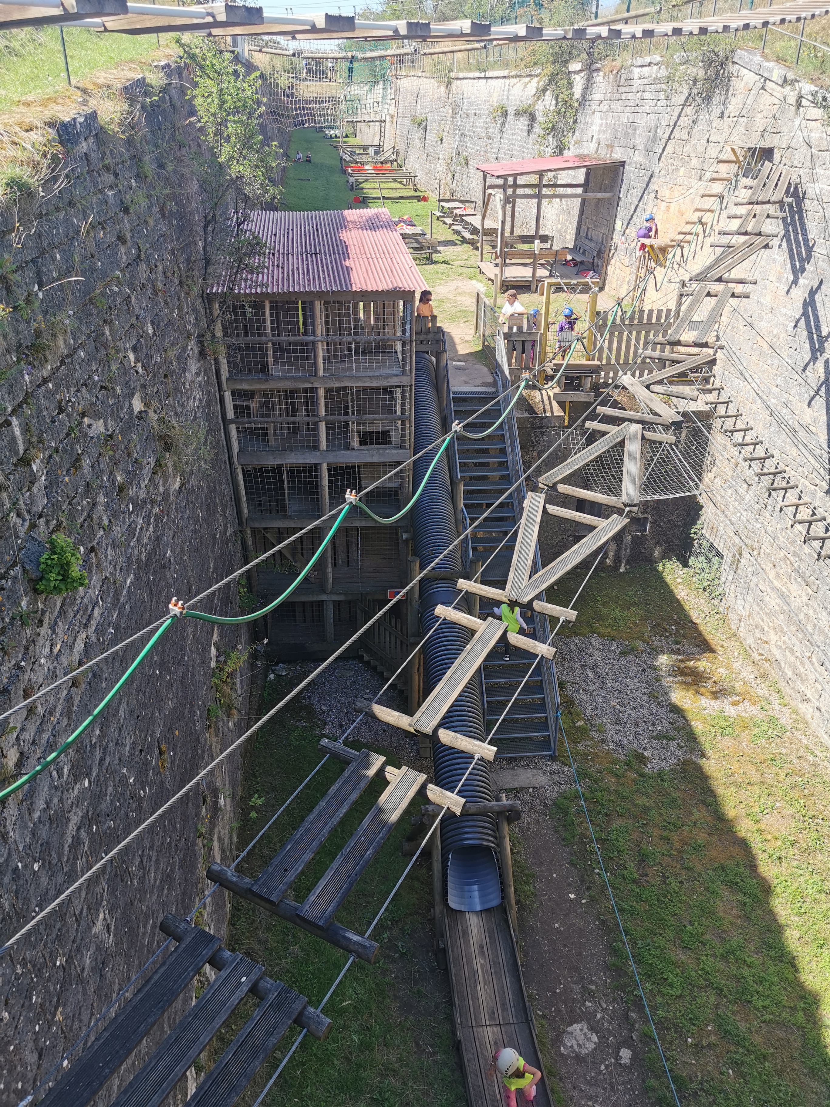 Ce lieu s'apparente aux parcs d'accrobranche, sauf que les parcours se font entre les remparts du fort. Il y a des niveaux différents selon les ages : 3-6, 6-12 et + de 12. Je n'ai testé que le parcours des plus petits, avec ma fille de 2 ans et demi, mais qui était a priori assez grande en hauteur. Pour les 3-6, ils peuvent, en plus des 3 départs, accéder à une sorte d'aire de jeux où il leur faudra garder le casque : grand tunnel toboggan, et grande tour à gravir/escalader pour remonter sur le toboggan (attention, dans cette tour, les adultes n'arrivent pas à rentrer, et les enfants trop petits en taille peuvent être coincés s'ils n'ont pas une motricité suffisamment développée). Le fort dispose de toilettes, mais pas d'eau potable sur place : pensez impérativement à apporter de l'eau en été, car les parcours n'étant pas dans les arbres, il y a peu de chances d'avoir de l'ombre ! Une autre facette du fort (certainement ce qui est appelé Fort Event) permet d'organiser des événements, pour les entreprises, les enterrements de vie de garçon/jeune fille, et les anniversaires. Ils peuvent mettre à disposition des salles pour faire des présentations / conférences. Des activités sont possibles à l'intérieur du fort, qui s'apparente, du coup, plus à Fort Boyard. C'est aussi le plan B en cas d'intempéries.