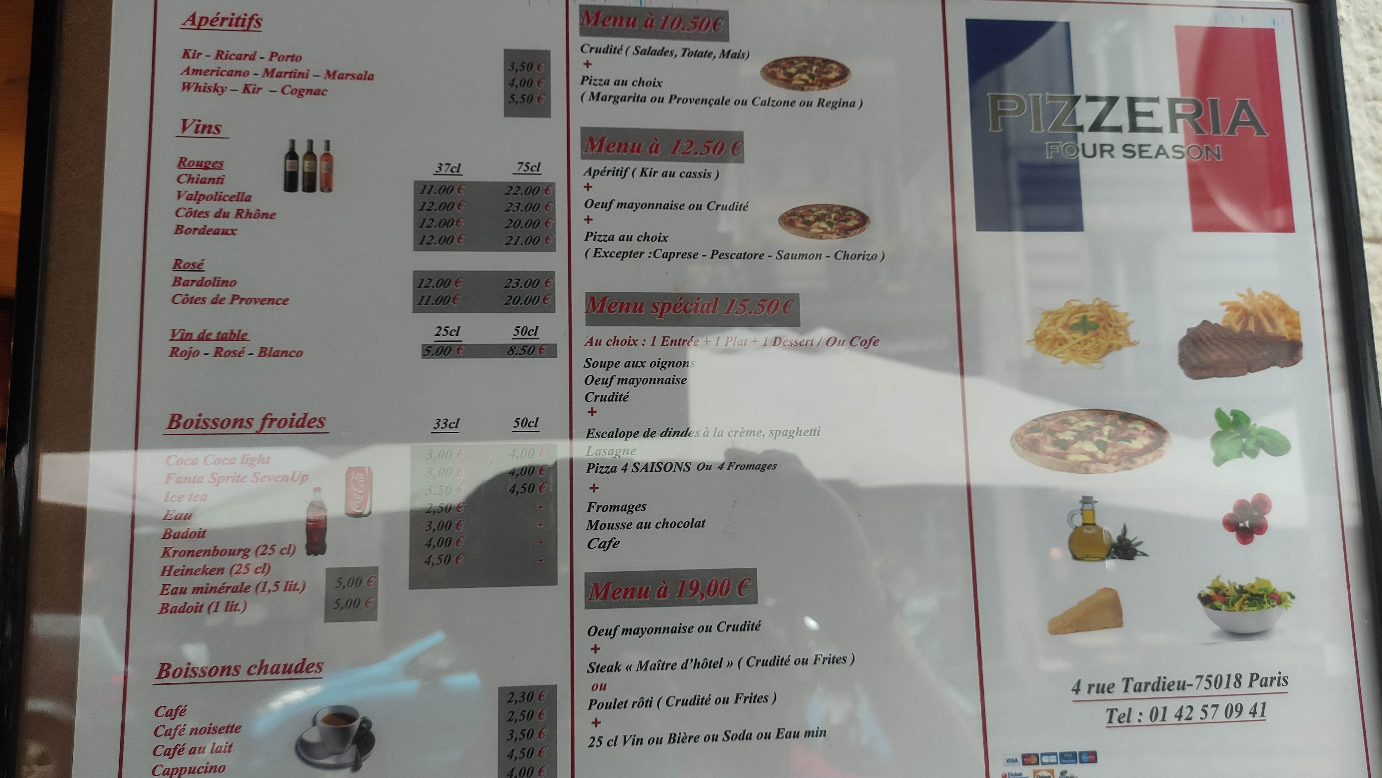 Restaurant italien à côté de la basilique du sacré coeur !!!! Nous cherchions un endroit où manger et tout nous semblait excessivement cher (même en sachant que nous étions à Paris) jusqu'à ce que nous trouvions ce petit restaurant super cosy !!! A part le prix, c'était complet, cela nous a déjà donné un très bon signal et rien qu'en ouvrant la porte le garçon nous a répondu en espagnol ! :) Quantité, qualité-prix de 10 ! Photo ci-jointe du menu à 15€ comprenant entrée+pizza+dessert !!! Le personnel était super sympa et attentionné donc je n'avais aucun doute sur le fait que nous pourrions écrire cette critique pour que les gens le sachent car cela vaut le coup si vous êtes à Montmartre ❤