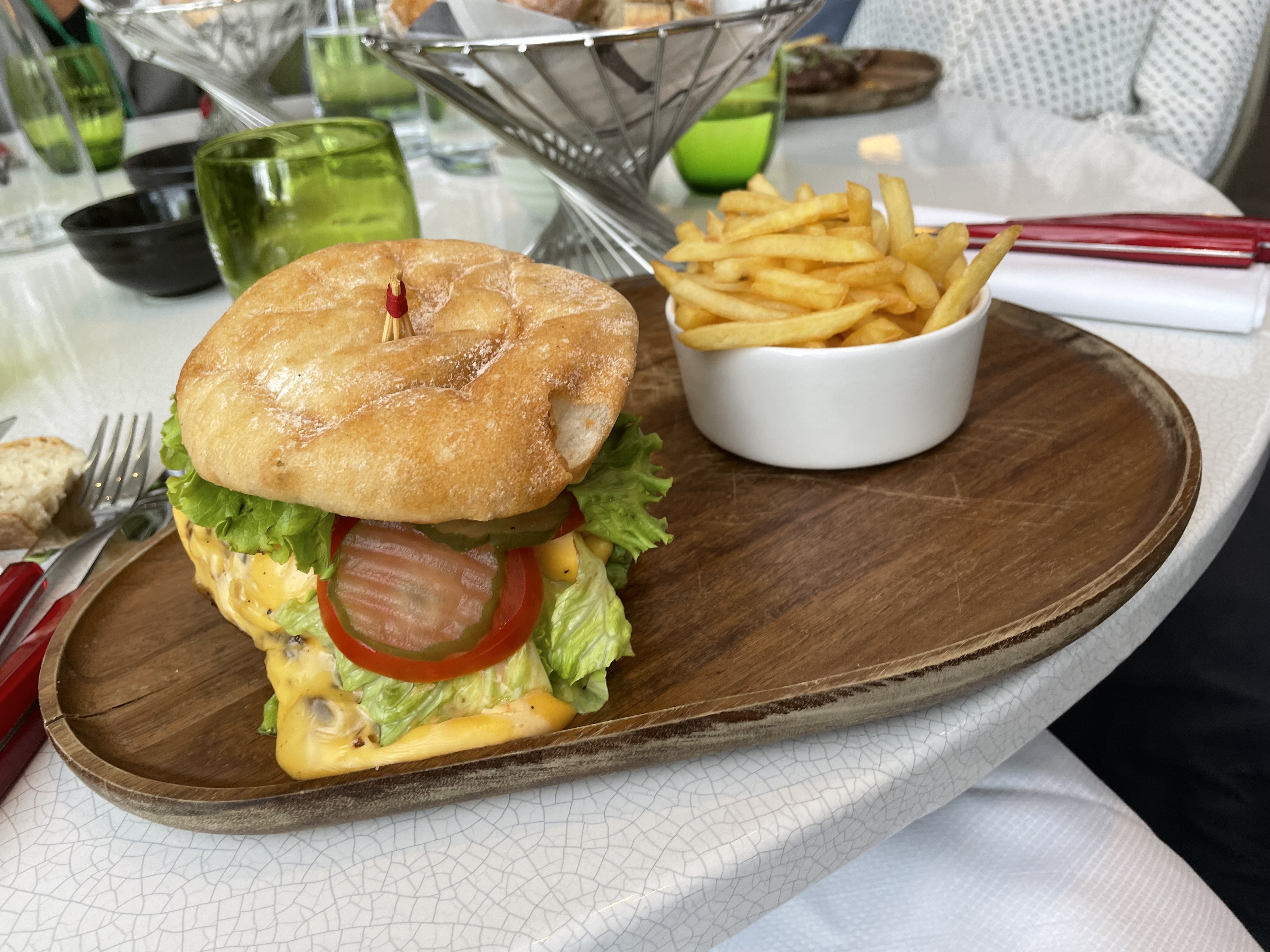Nous y sommes allés pour la vue incroyable sans même regarder la carte avant, l’intérieur est vraiment bien décoré et aéré. Bon accueil et bonne ambiance avec un fond de musique. Le choix des plats est quand même restreint. Mon copain et moi avions prit un gaspacho de tomates en entrée( 9€) et le frame burger en plat, (26€) c’était délicieux ! Les prix assez élevés mais bon c’est pour la vue Le serveur aux cheveux noirs (je n’ai pas son prénom désolée) était très professionnel et a l’écoute. Je vous recommande ce restaurant