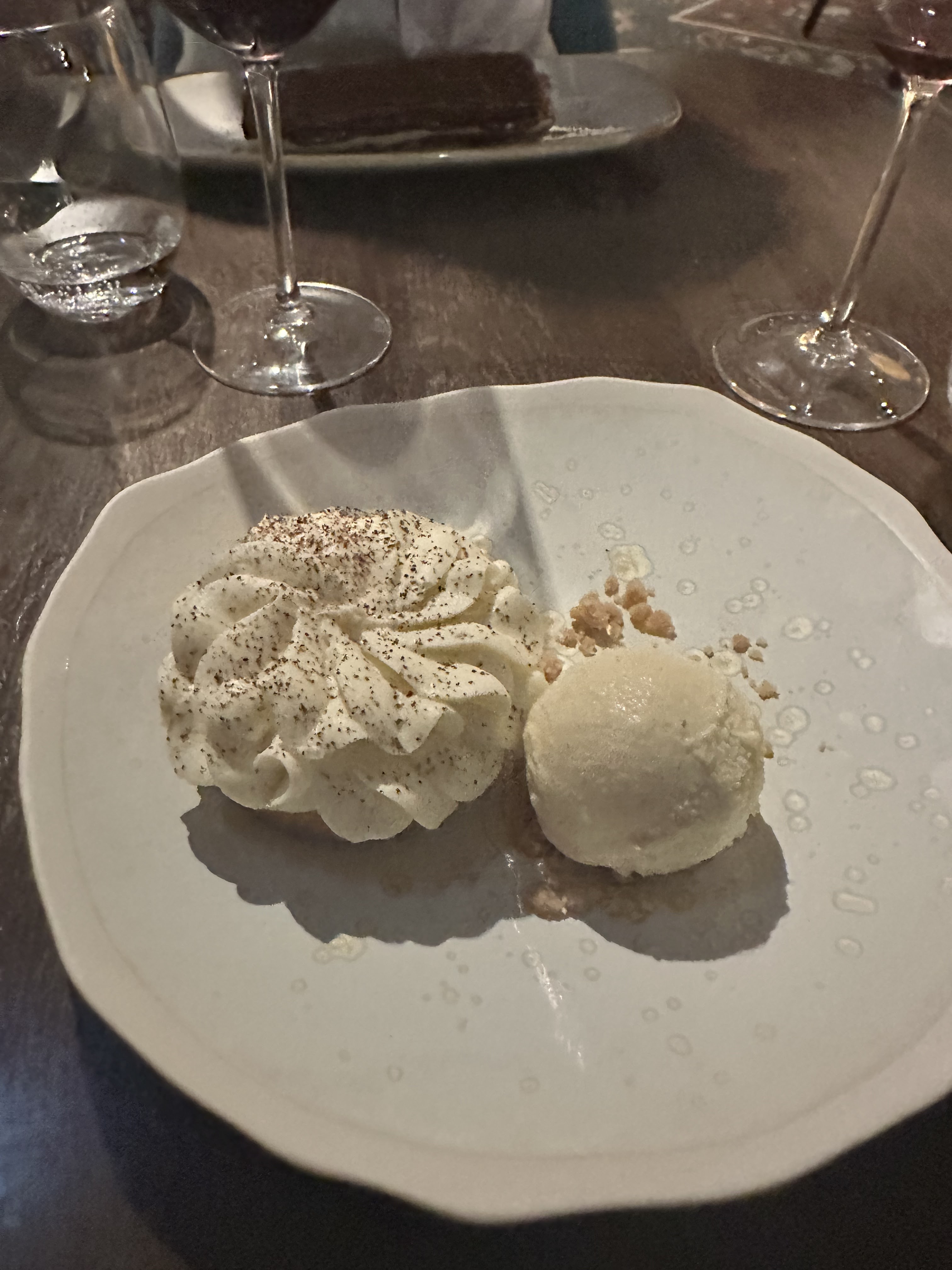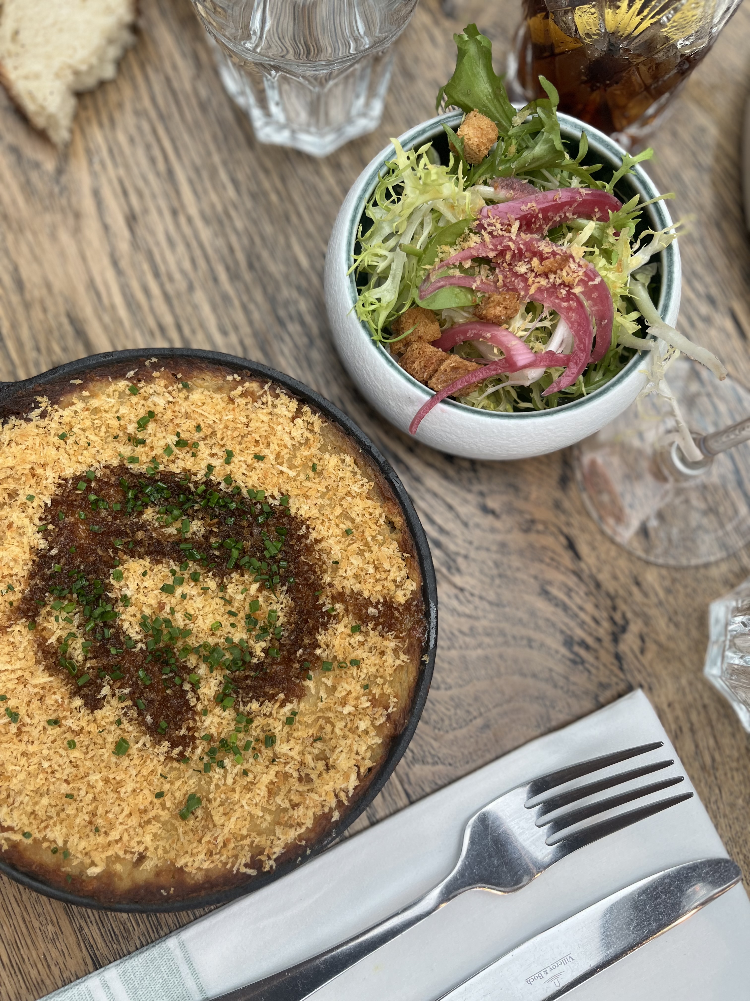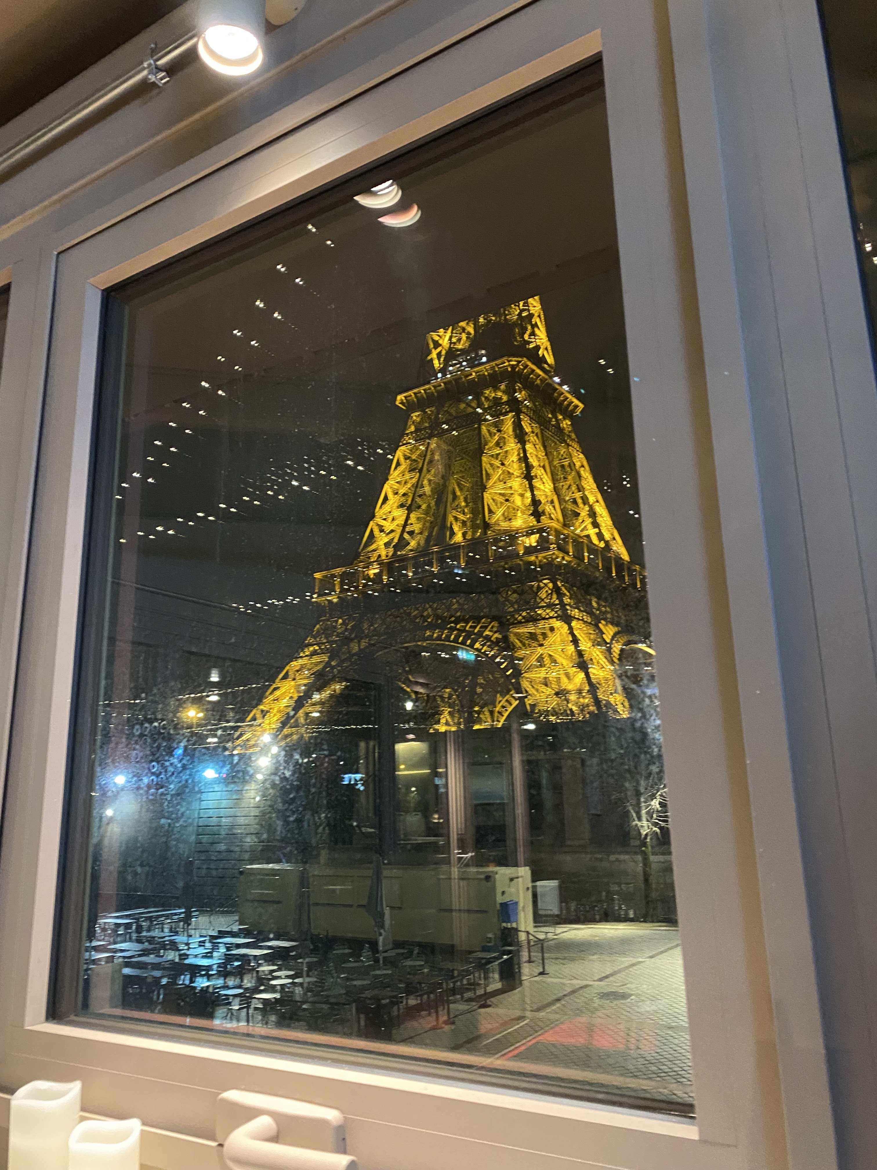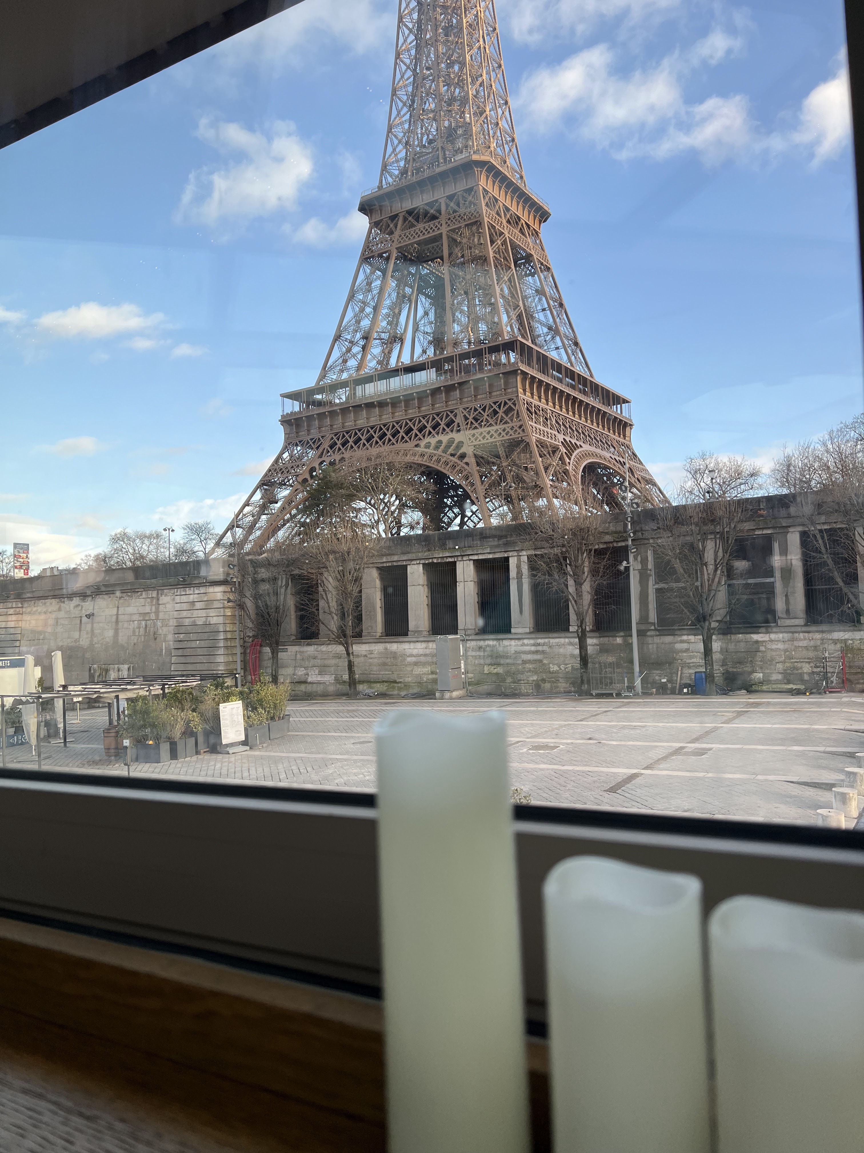 La nourriture était vraiment bonne, nous avons tous les deux mangé le poisson du jour qui était des coquilles Saint-Jacques. Même si nous n’avions pas de vue sur Eiffel, l’ambiance était très sympa. Le Viognier était impeccable et la femme qui nous a servi était vraiment gentille et serviable.