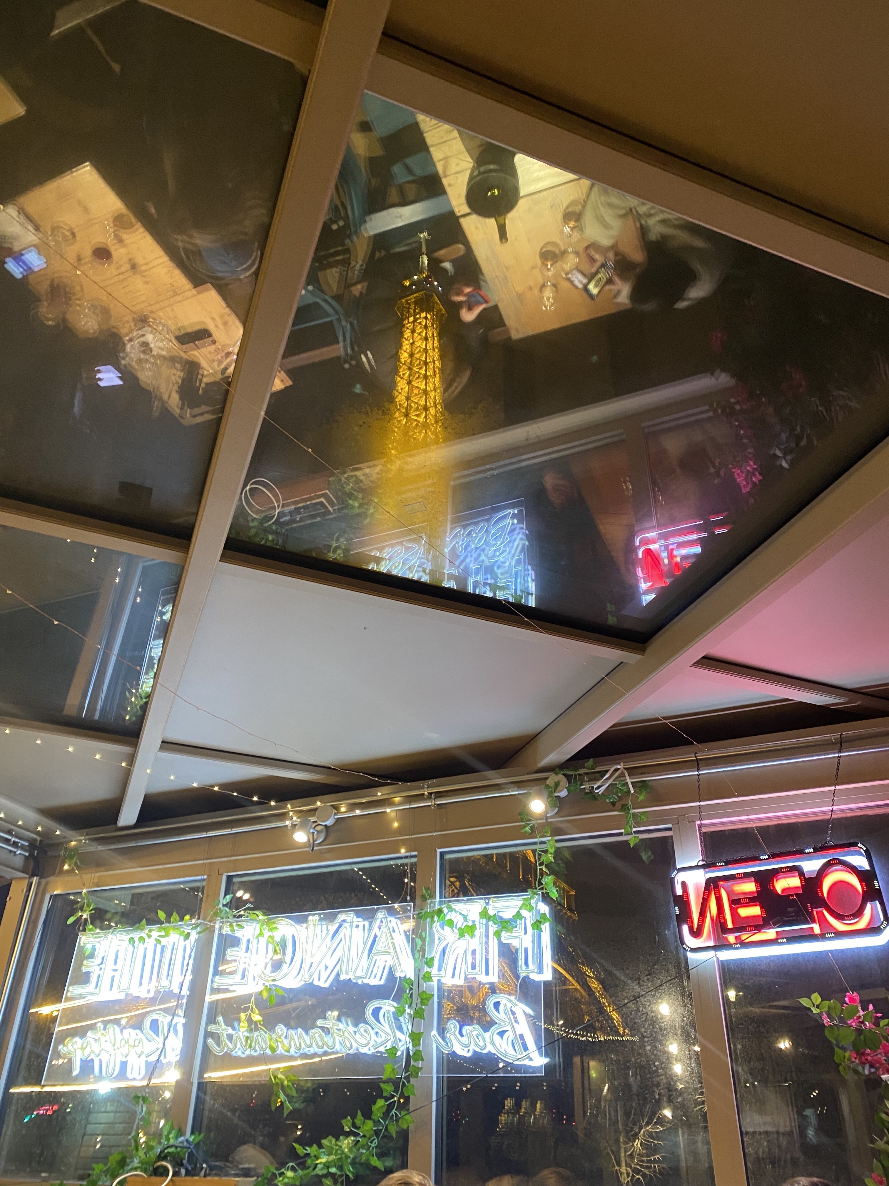 Je vais commencer à dire à tous ceux qui vont à Paris de manger ici. C'est vrai qu'il faut réserver à l'avance (nous avions réservé environ une semaine avant), mais nous avons passé un merveilleux moment. Le service était très bon : attentif, rapide et patient lorsque nous avons demandé de l'aide pour prendre des photos, allant même jusqu'à proposer si nous souhaitions prendre des photos avec des arrière-plans différents. La serveuse blonde était très gentille ! La nourriture était également savoureuse et valait son prix. Nous avons commandé une assiette de 6 huîtres et leur canard signature à partager, et c'était succulent avec une généreuse portion de frites (entre 4 personnes, nous étions complètement rassasiés). L'intérieur était joliment décoré et parfaitement chaleureux. De plus, vous bénéficiez d'une vue sur Eiffel depuis l'intérieur du restaurant.