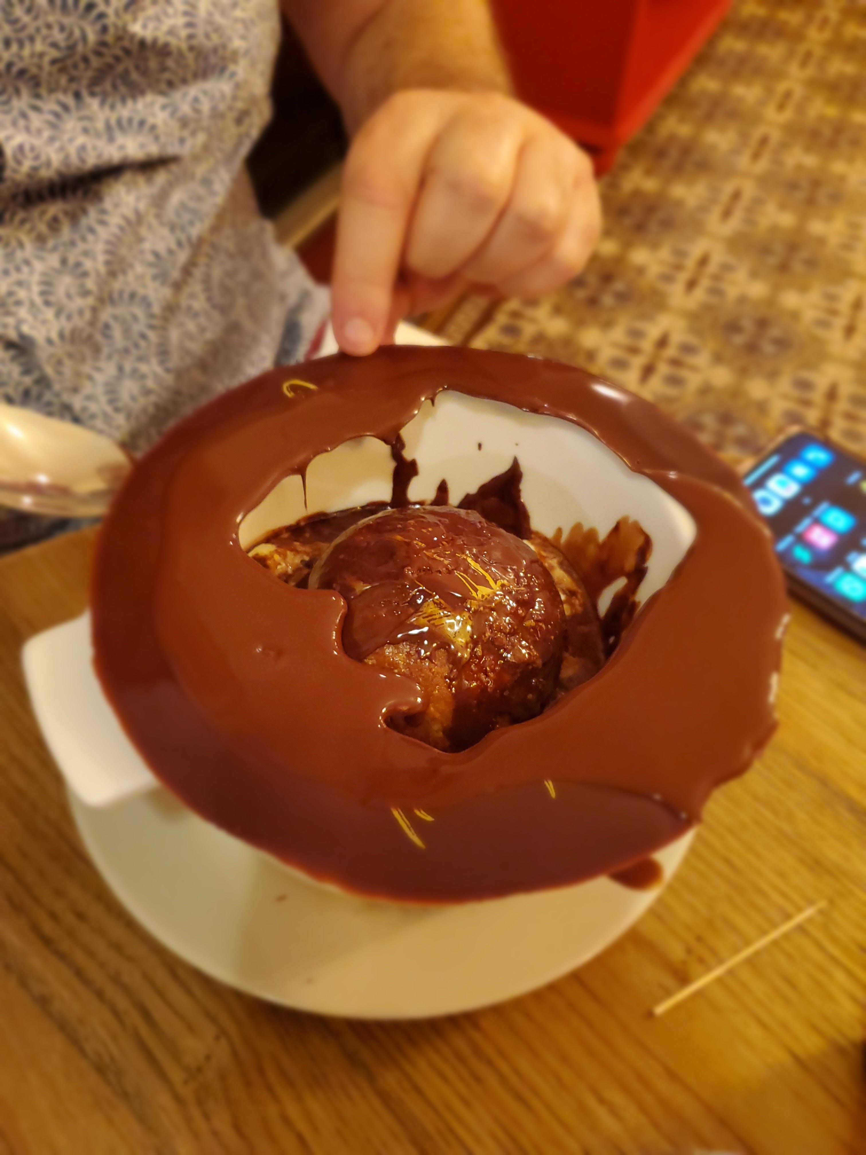 Nourriture incroyable. Tout a été bien pensé et préparé avec soin. J'ai eu les joues de bœuf et j'ai aussi goûté le poulpe mais elles étaient divines. Tout était délicieux. Les profiteroles étaient impressionnantes mais peut-être que le chocolat était trop et trop riche, il fallait plus de glace et de crème. Très bon service. Bel emplacement.