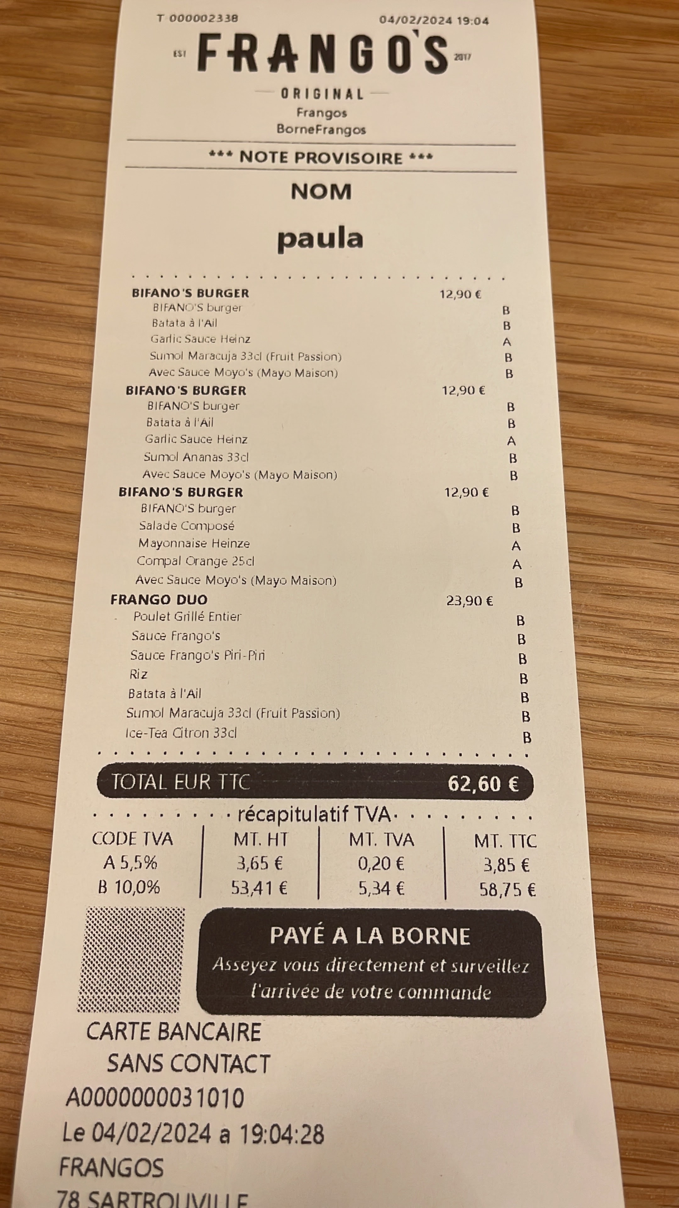 Commande en click & collect prête à l'heure, super pratique. Burger et batatas délicieux, je reviendrai sans aucun doute la carte regorge de merveilles. Hâte de voir pousser des Frango's sur tout le territoire !
