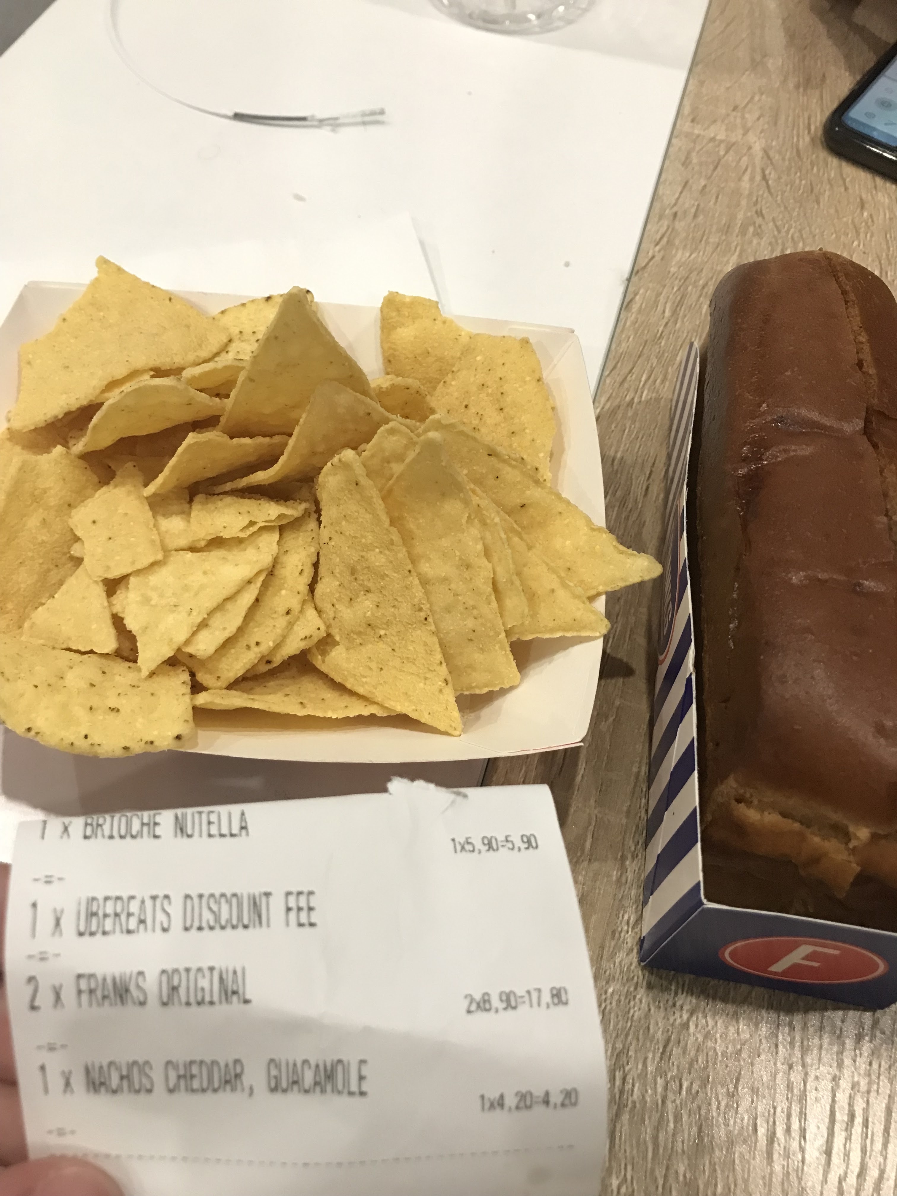 Bon. Juste pour dire qu’en plus d’être très mauvais (saucisse pire que knacki, vraiment) et oublie du guacamole dans les nachos (5€ les nachos pourtant) et oublie d’un hot dog sur les 2 commandés (heureusement que c’était une offre Uber Eats). Une arnaque