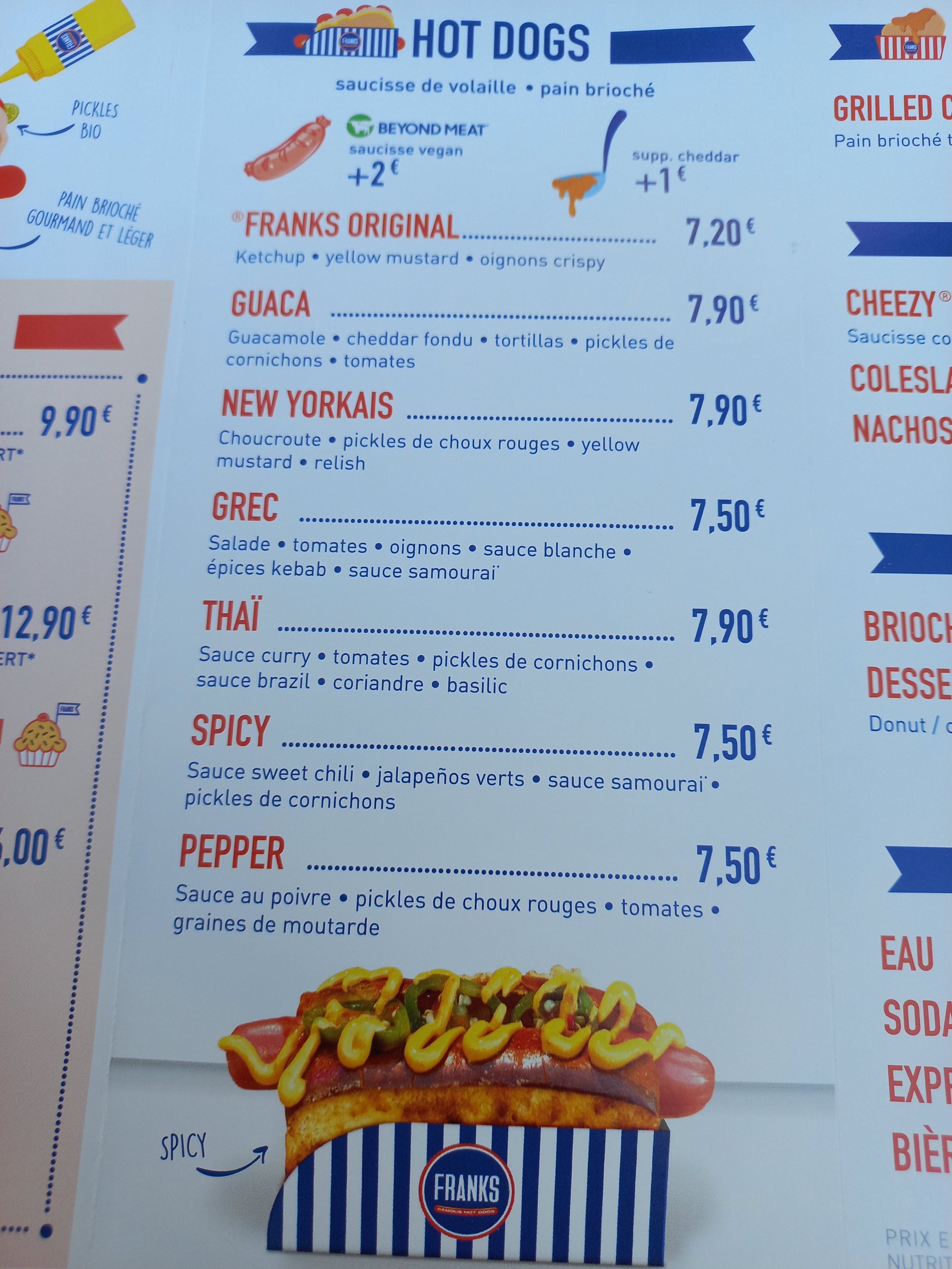 Très déçue de cette expérience, je ne recommande pas du tout. Tout d’abord, sachez que si vous prenez une formule à 12€ (hot dog/side/boisson) vous paierez plus cher qu’en prenant chaque article à la carte dans le cas où, comme nous, vous prenez un hot dog Classic, des nachos et de l’eau. D’ailleurs, on ne vous le précise pas à la caisse, on s’en est malheureusement rendu compte après coup. Au delà de ça, le cheddar est horrible, il s’agit d’une sauce ou bien de cheddar en spray, mais ce n’était clairement pas du fromage AOP comme indiqué sur votre site internet. Enfin, le pain : une éponge pleine de beurre. Je n’ai jamais vu de beurre dans un hot-dog, je n’ai même pas pu le finir tellement le pain était imbibé, sans parler du gras laissé sur les doigts et du goût de beurre qui ne part pas. C’est dommage car le pain aurait été bon sans tout ce beurre, et la saucisse était bonne. Autre point négatif : le prix. C’est très cher pour ce que c’est d’autant plus que le point de vente est en banlieue. Même Kraft, qui a mon sens est le meilleur hot dog que j’ai gouté en France, pratique des tarifs moins chers pour des produits de meilleure qualité (17€ pour deux menus contre 25,80€ chez Franks.)