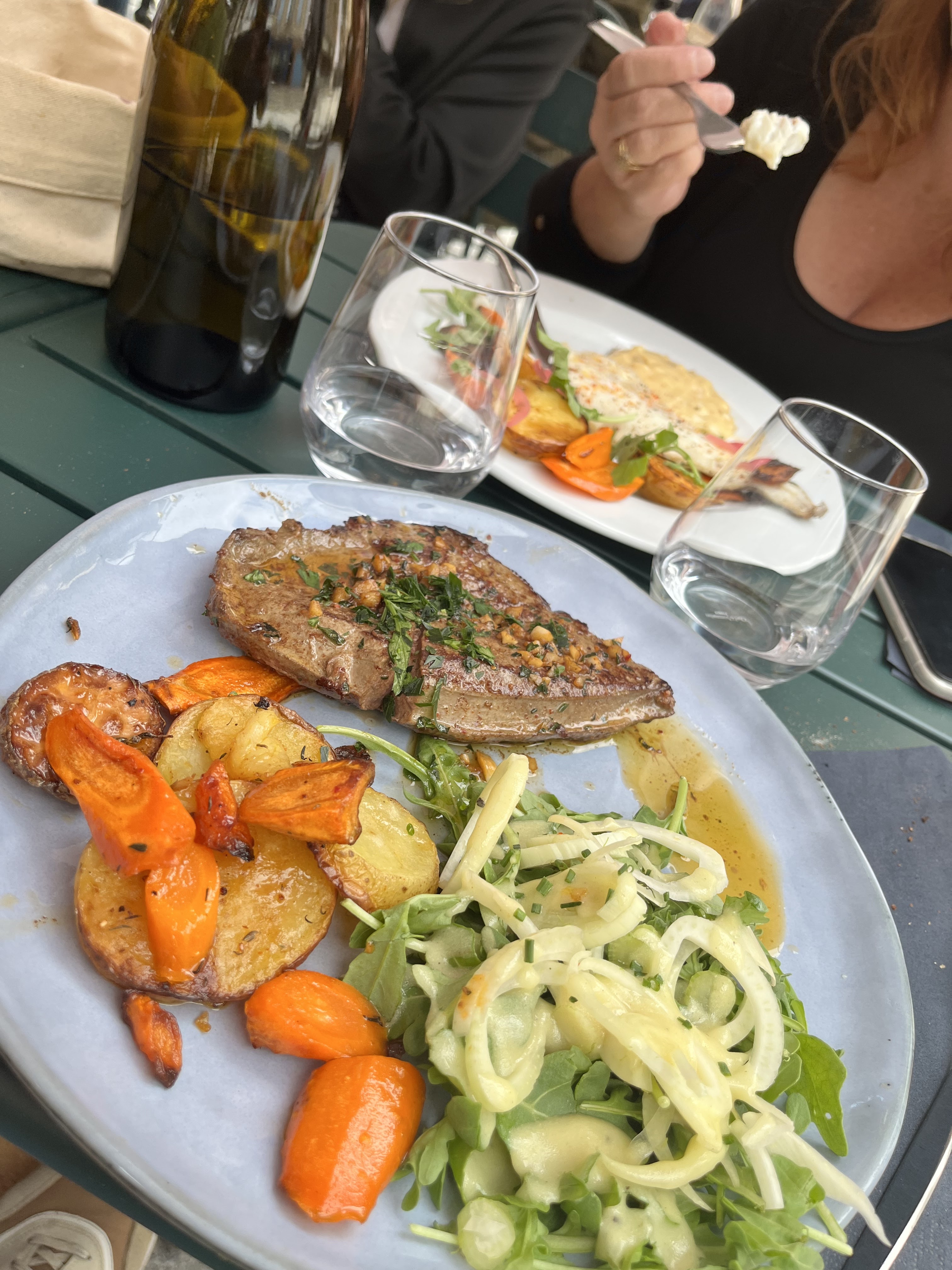 Concernant le service du soir 3 options a la carte, une non disponible a 19h. Donc il nous restait la côte de boeuf ou l'assiette de fromage. Franchement déçu par l'assiette de fromage (produit qualitatif mais pas de quantité). Très bon vin par ailleurs ! Et ambiance de la place très chouette !