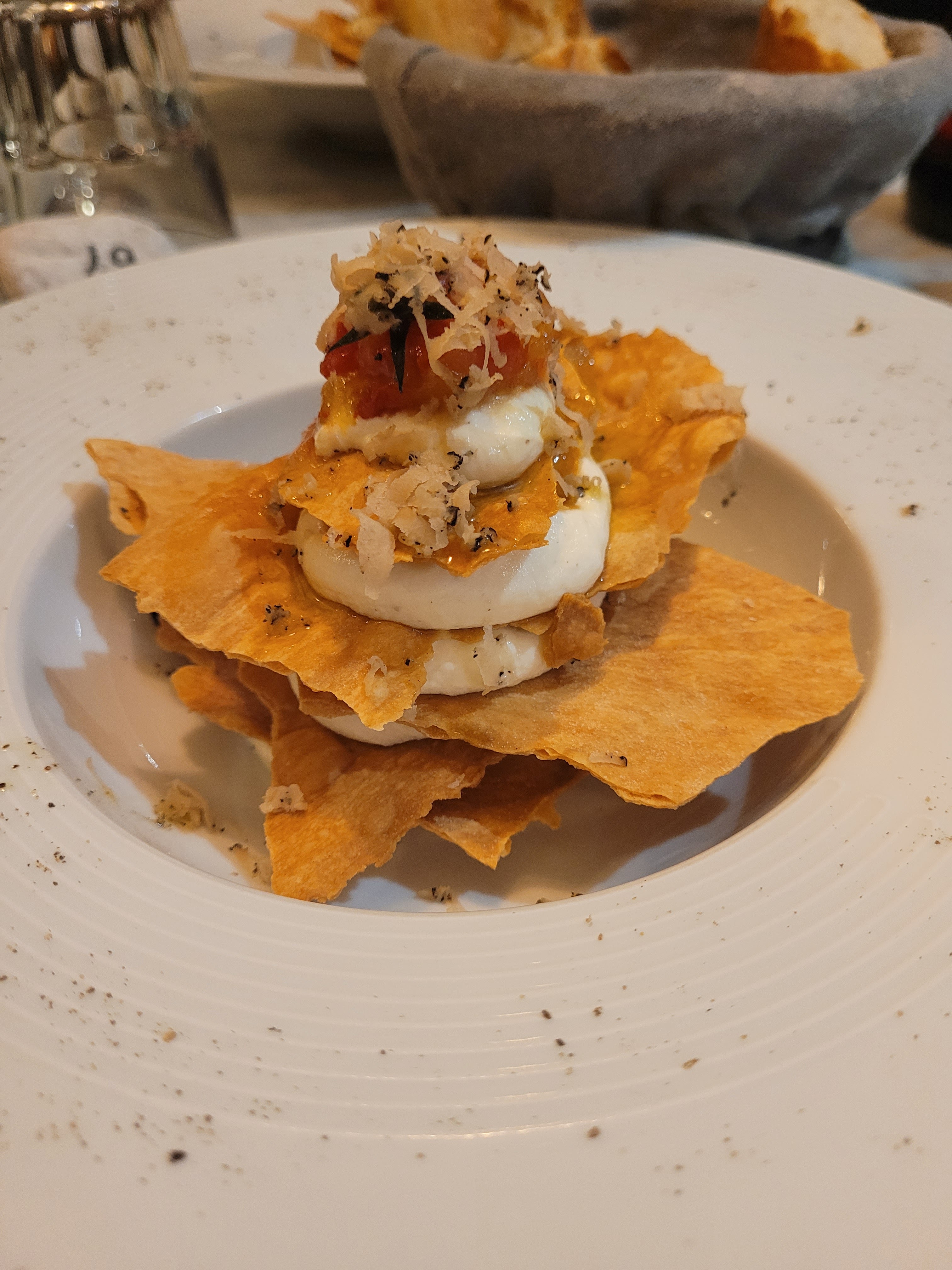 Nous avons dégusté un très bon vin toscan avec du fromage. La Burrata était très bonne et crémeuse.