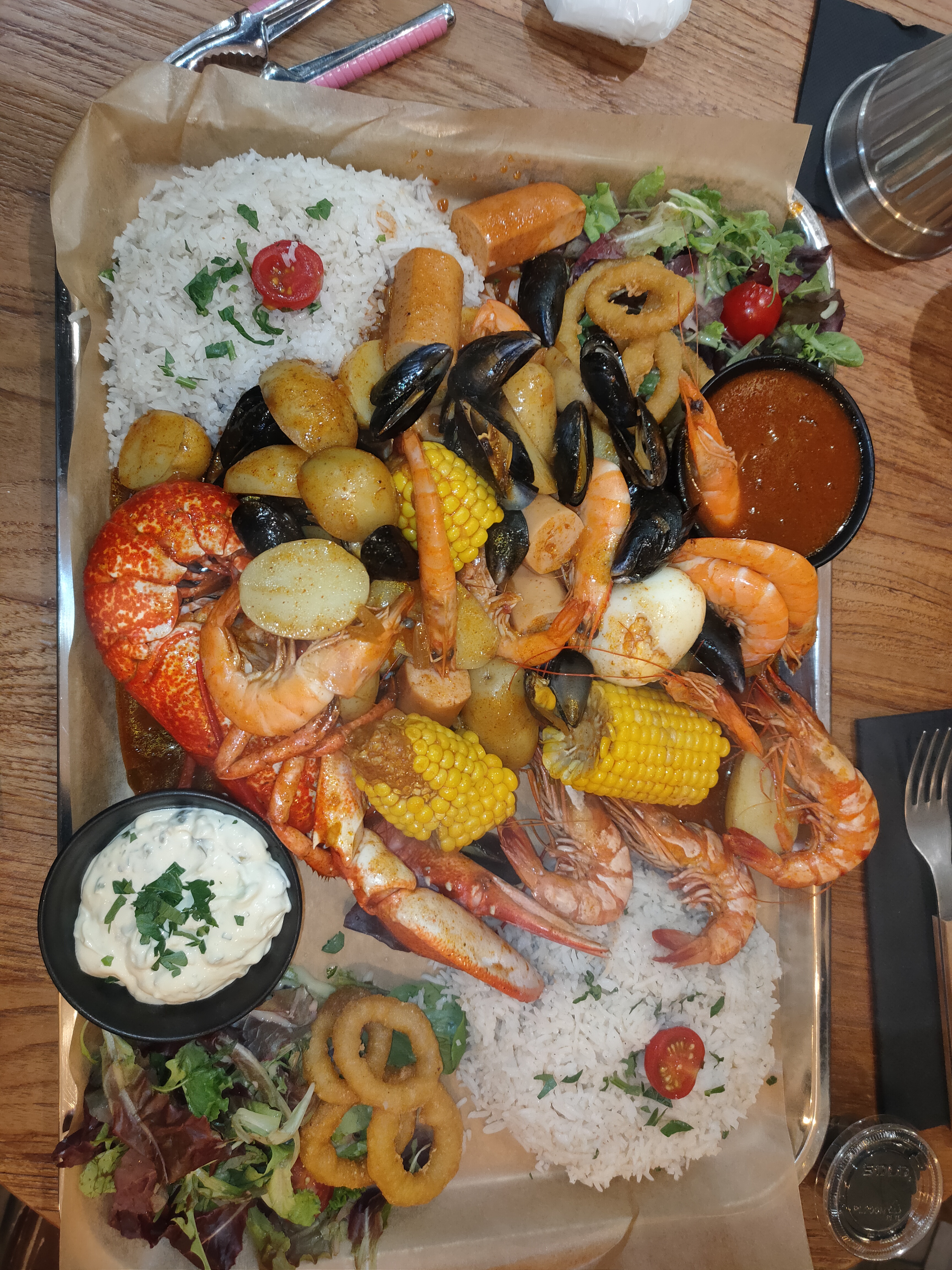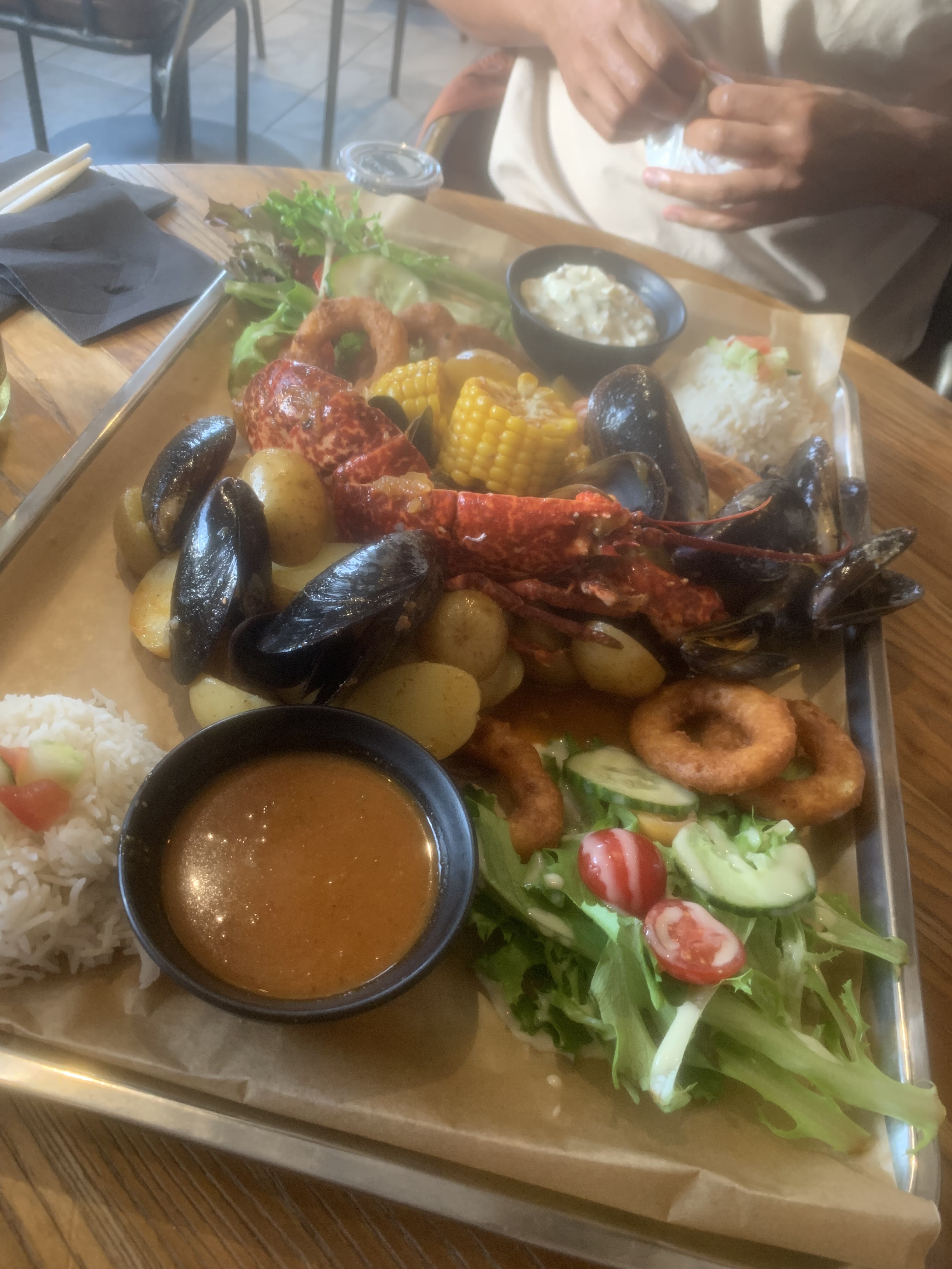 Excellent serveuse au top dans la salle du fond sea food boil gold excellent moule gambas un peut sèche mais pas vraiment grave homard 😍 crevette pomme de terre la sauce 👌🏽je recommande