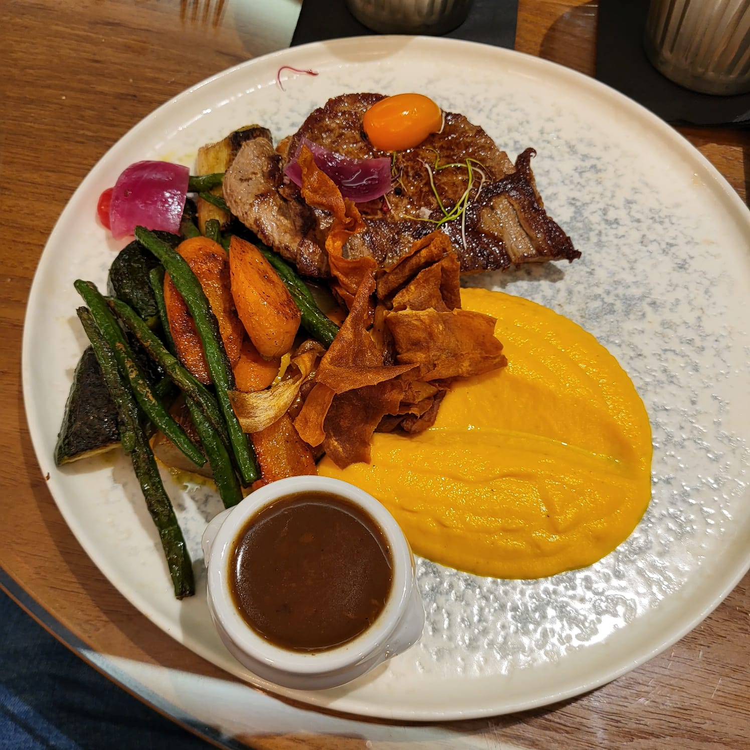 L'entrecôte était bonne avec sa superbe sauce poivre. Frites maisons de bonnes qualités mais la souris d'agneau était pas a ce quoi nous nous attendions car les légumes accompagnant la souris d'agneau étaient fades et goût moyen. Sinon le service était impeccable. Le prix ne justifie pas la qualité des plats. Un peu chère tout de même