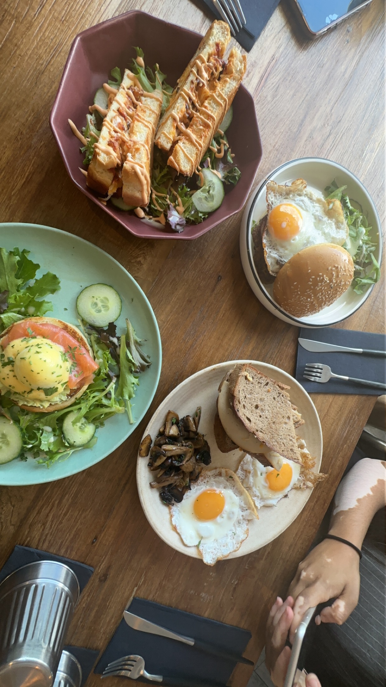 nous sommes venus tester le brunch, le salé est très bon et frais par contre les pancakes sont un peu trop bourratifs. au niveau de l’attente c’est vrai qu’il faut être patient, nous avons attendu 1h avant d’être servis..