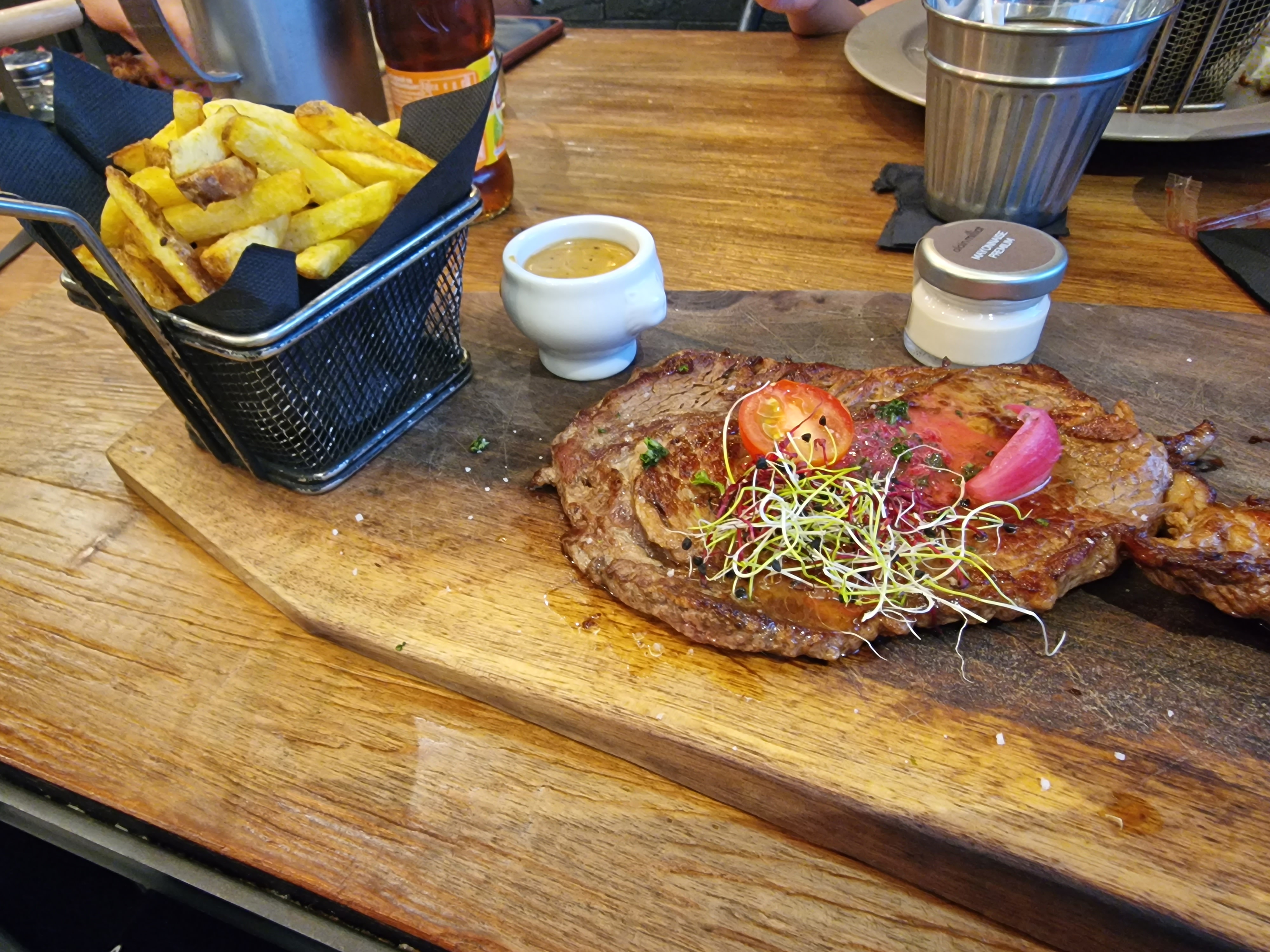 Mon mari et moi pour la rupture du jeune pendant le ramadan : déçu, trop cher pour ce que c’est. Entrecôtes hyper fade, des frites sans sel, Risotto sec Résultat pour 2 plats et 2 boissons :65 €