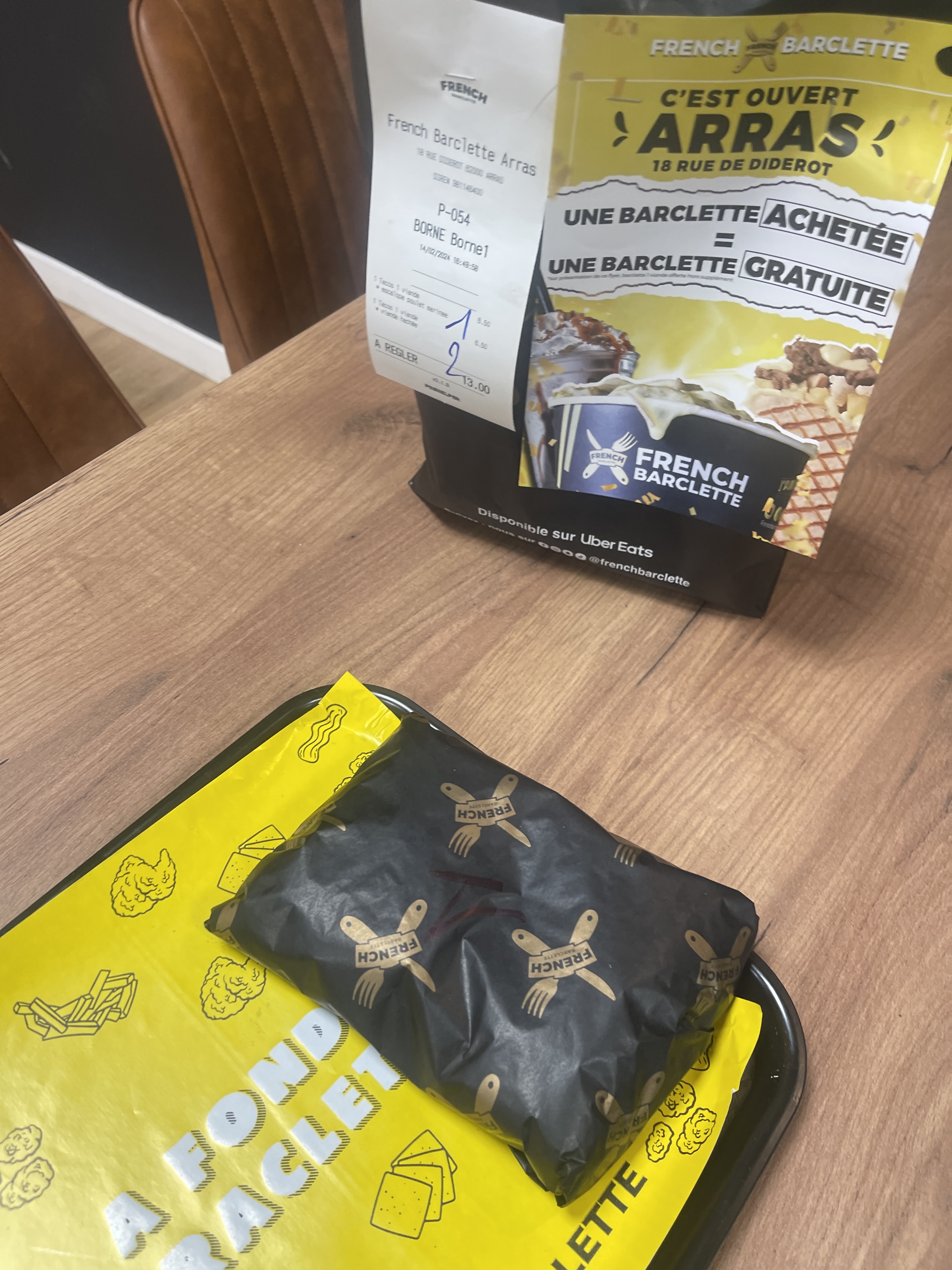 2 Tacos ( un 3 viandes, l'autre 2 viandes), 1 Menu enfant et 2 Milkshakes 42 balles. Je trouve ça exorbitant, le Tacos non présentable on ne peut même pas le prendre en main car il n'est pas fermé. La qualité des produits n'est pas au rdv, dans le triple viande je cherchais les deux sauces inclus biggy et samouraï je pense pouvoir le sentir. Le double viande pour ma femme, je n'ai pas demandé de sauce (car elle ne mange pas de sauce) elle a eu de la sauce poivre donc elle ne l'a pas mangé. La cuisson des frites, il va falloir refaire une formation car immangeable. Les milkshakes le chocobon on cherche encore le goût, mais point positif sur le country. Je suis déçu, car on m'a recommandé ce fastfood et bin pour une première je n'y reviendrai pas. J'adore les Tacos, mais là je trouve que même MacDo c'est meilleur. L'idée est bonne et encore dans la garniture de base des Barclettes je m'attendais à ce qu'on me dise que ce sont des pommes de terre en morceaux et que l'on choisit la garniture, mais nonce sont des frites un peu dommage. Attente environ 30 minutes. Pour ma part je ne conseille pas, mais ça reste mon avis.