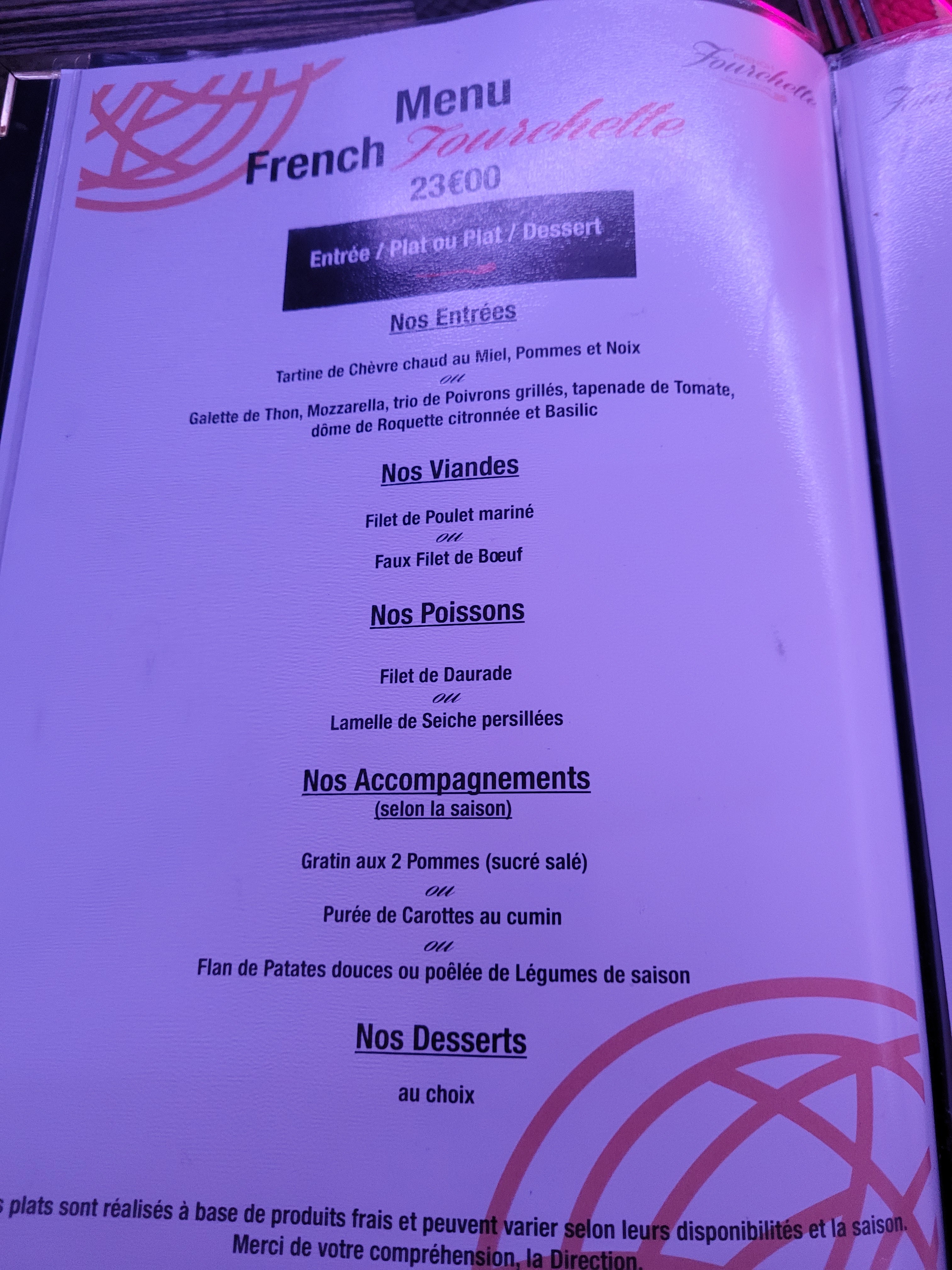 Salam pour ce soir on a testé pour la première fois french fourchette pour ma part grosse déception Pas le choix que deux entrée et deux plat. Trop de bruit musique trop trop forte on ne s'entendaient même pas entre nous. Cuisson de la viande même pas demandé une seul cuisson pour tous. Les légumes avec une odeur de lavande qui était en déco dessus, frite pas maison à ce prix là ils pourraient faire l'effort de faire des frites maison. Pour moi mauvaise expérience.