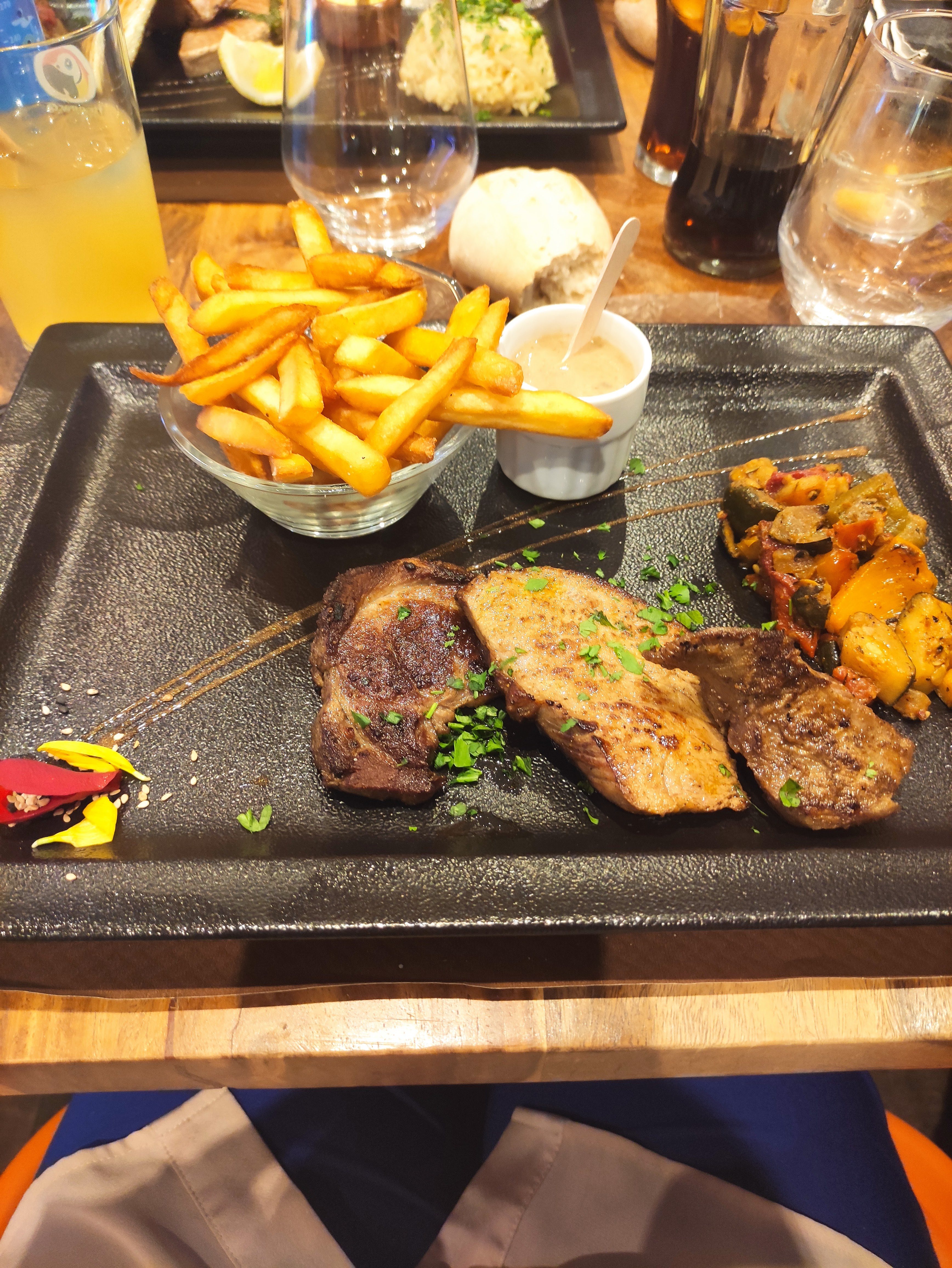 Endroit chaleureux, bon accueil et plats bien présentés. La salade était bonne et très belle. Je penses que c'est la première fois que je mange une aussi bonne viande ! Elle était excellente ! Bien assaisonnée, cuisson parfaite ! 👍 Les accompagnements sont assez simples, pas de choix et pas trop recherchés, c'est dommage.. Mention spéciale pour le cocktail mangue chef, il était succulent !! Nous reviendrons sans hésiter. 👌👌