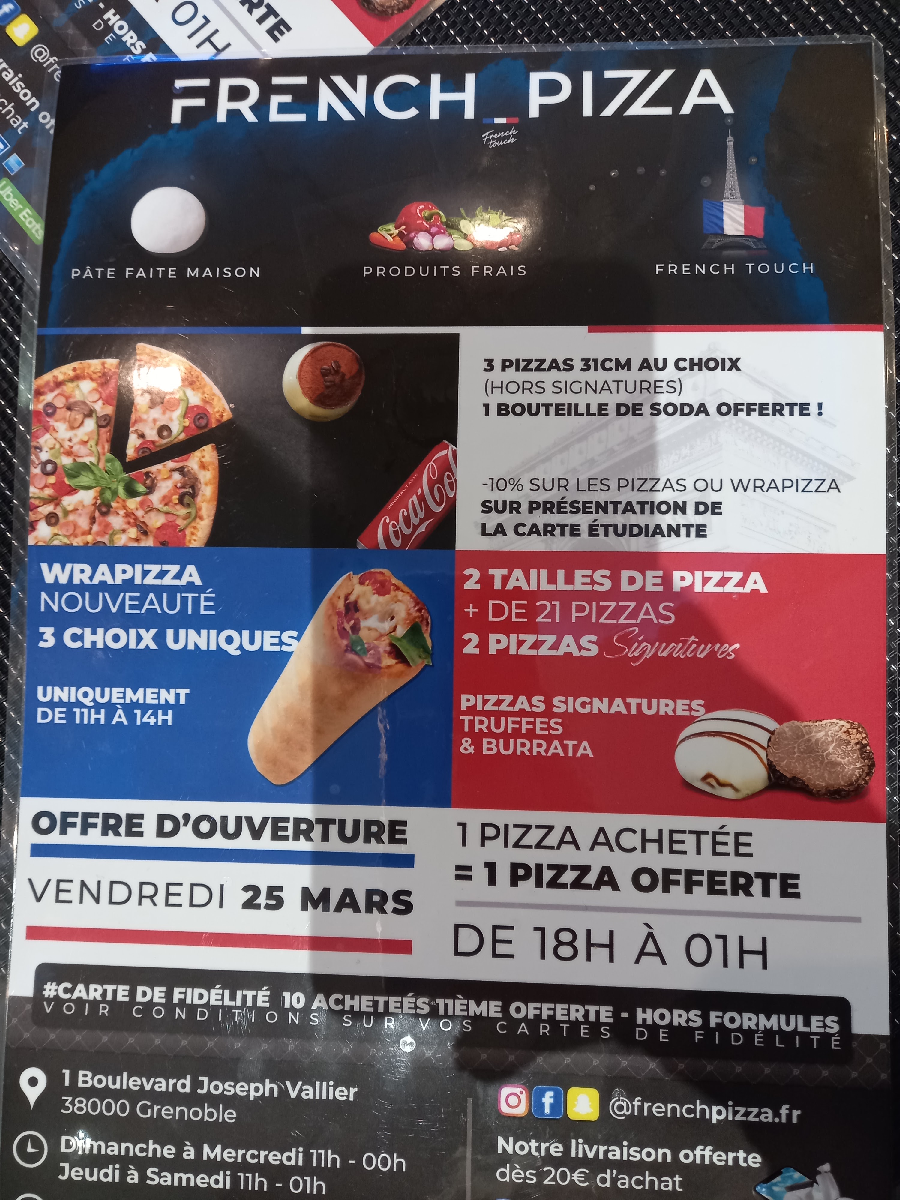 Comme son nom l'indique French Pizza ne propose pas de pizza classique à l'italienne mais des recettes en cohérence avec une ambiance tacos. Néanmoins, j'ai goûté trois parfums : au regard du prix les ingrédients sont de qualité et bien répartis. Indice essentiel : le chorizo n'est pas une vulgaire saucisse épicée qui diffuse son gras en écrasant tous les goûts mais un ingrédient qualitatif qui participe de manière équilibré à la recette. Idem pour la recette au curry : un parfum délicat bien dosé et pas une soupe d'épices grasse. Bon accueil sympa, continuez comme ça, c'est pas mal du tout.