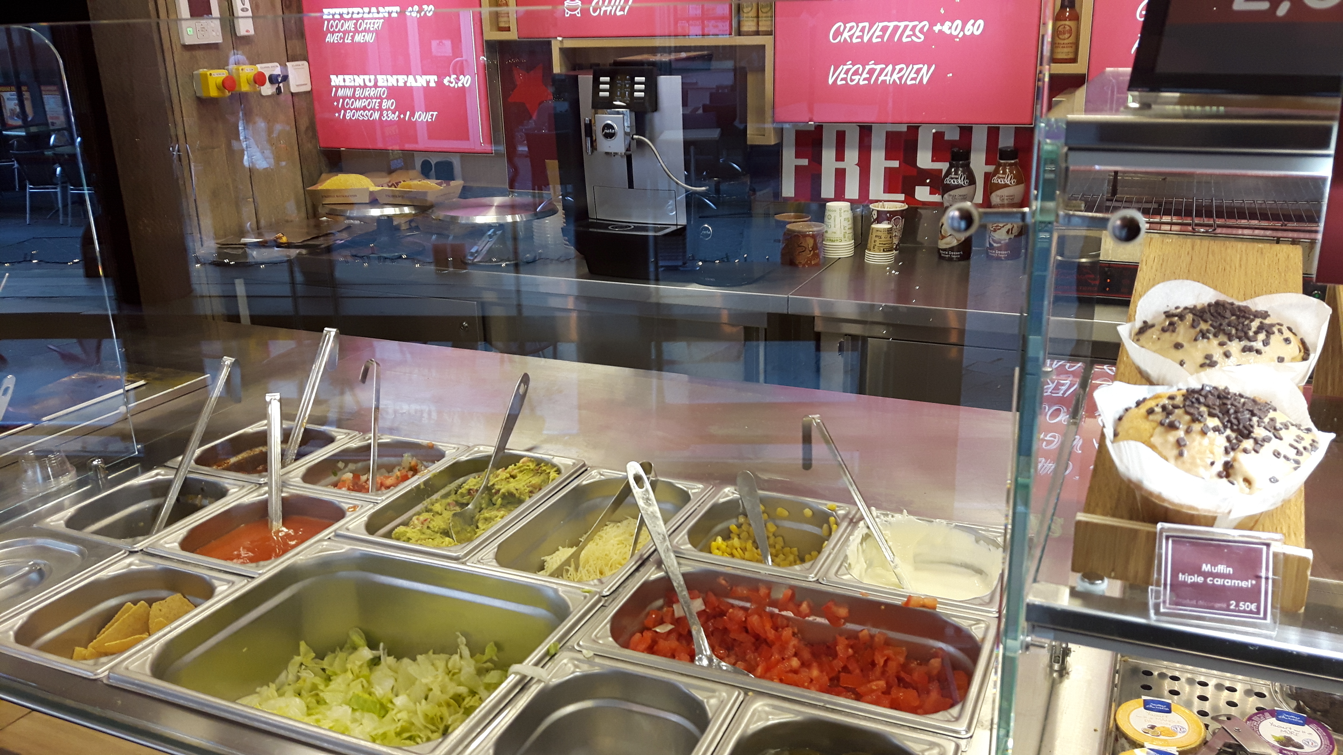 Service très rapide, grande variété d'ingrédients à choisir, décoration intérieure chaleureuse et décontractée, burrito ou autre plat préparés avec des ingrédients frais. Seul bémol, prix légèrement élevé et supplément d'argent nécessaire pour certaines boissons même dans le cas d'un menus : Coca Cola sans supplément mais Dr Peppers +0.60€.