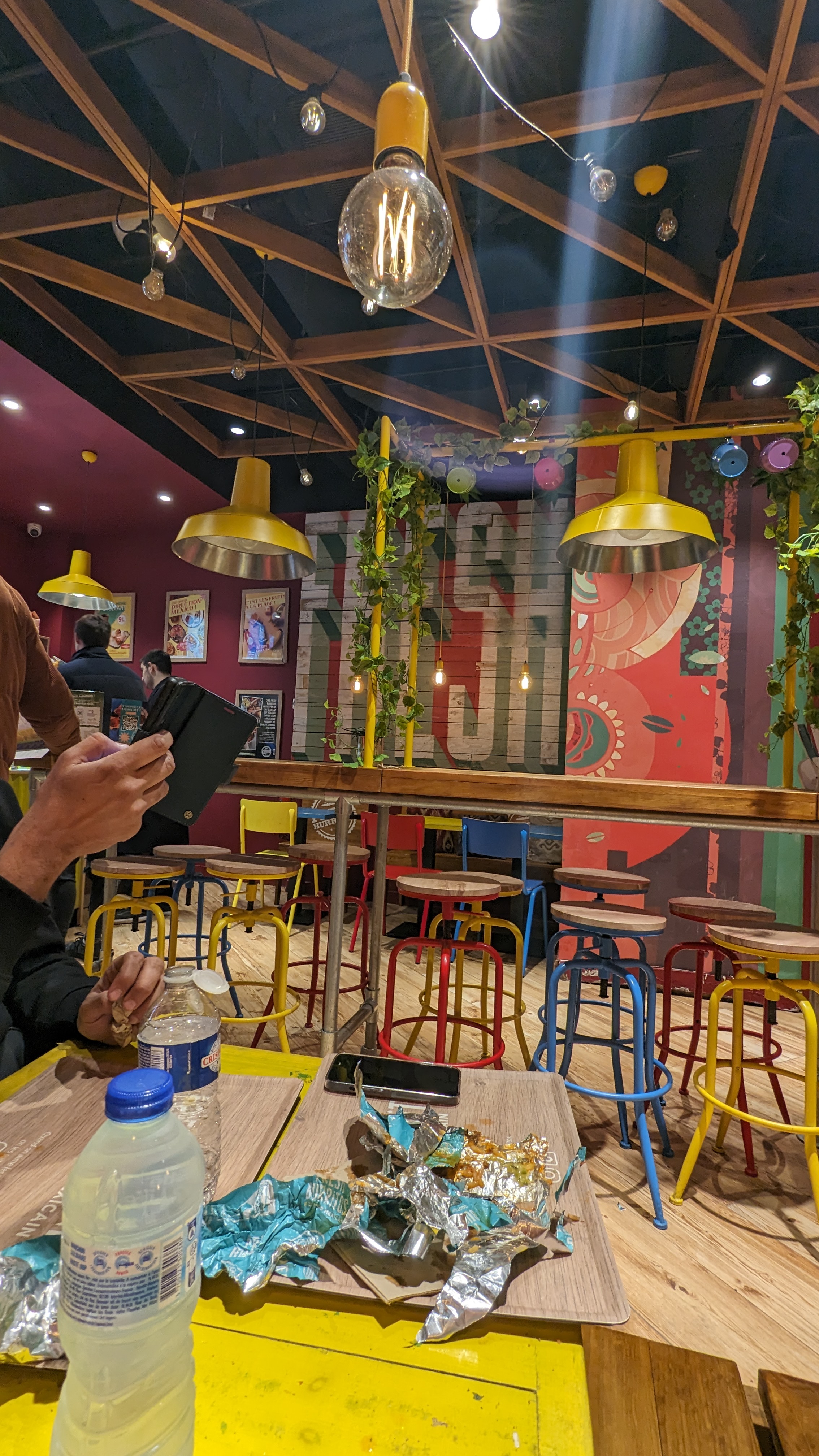 Bon.. on est venus pour la première fois prendre 2 burrito en menu Et je peux vous dire que les 23€ investis pour 2 burritos et 2 boissons qui sont à peine plus gros que 4 bouchées, le papier alu qui colle à la galette, la sauce qui coule avec une seule misérable petite serviette, et bah ça les vaut pas. Les tables collent, les boots pour s’assoir sont serrés comme on en peut plus Fin bref Sans plus Je regrette mes 23€