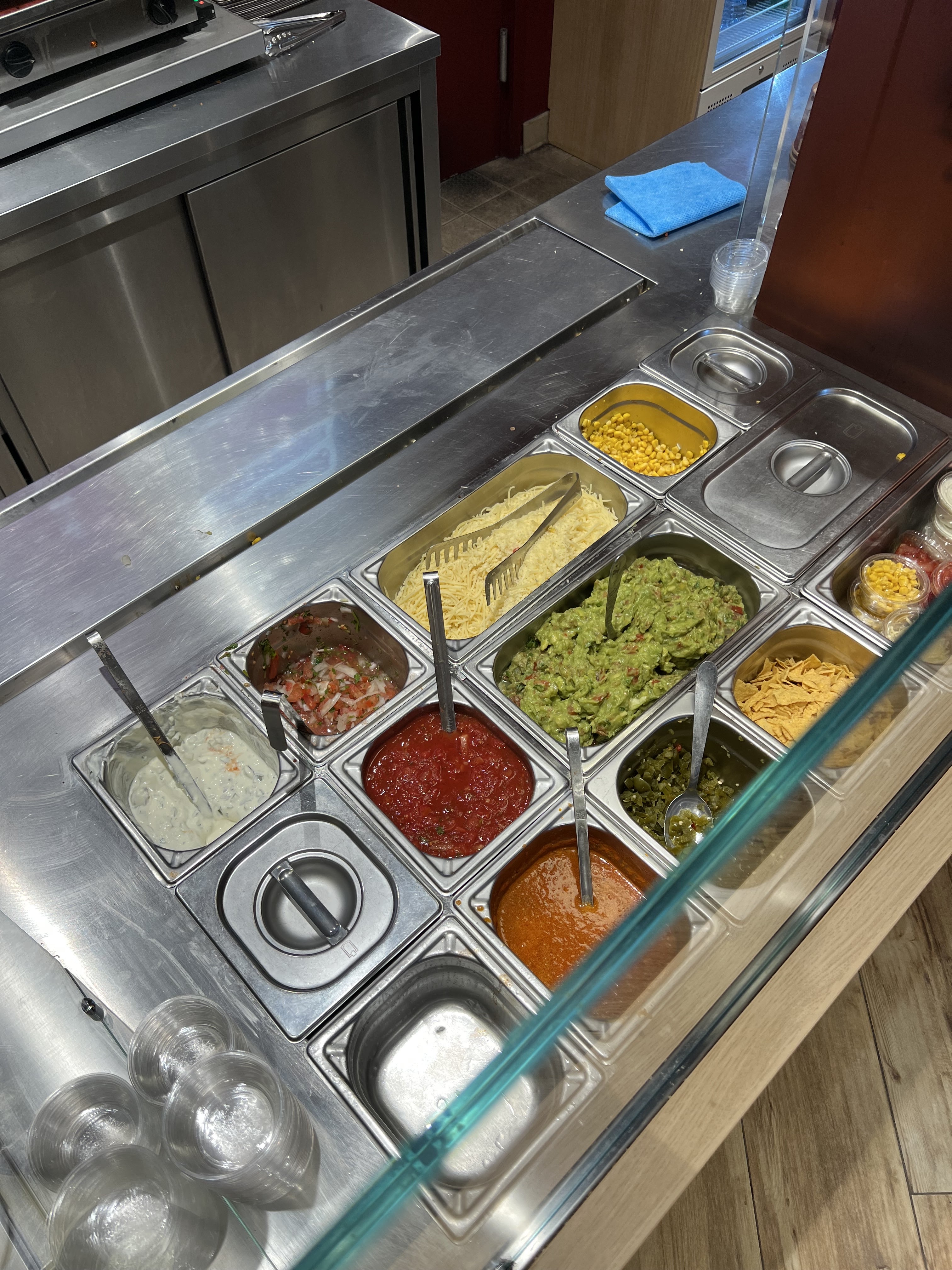 Choix limité , à 12h il n’y avait déjà plus du tout de chili carne. Les burritos sont très petit et très peu garnis. Les tables ne sont pas débarrassées on a dû manger sur une table où il y avait encore des plateaux. On mange également en compagnie des pigeons mais apparement ça ne dérange pas les employés. Je déconseille fortement cet établissement. Je n’y mettrais plus un pied.