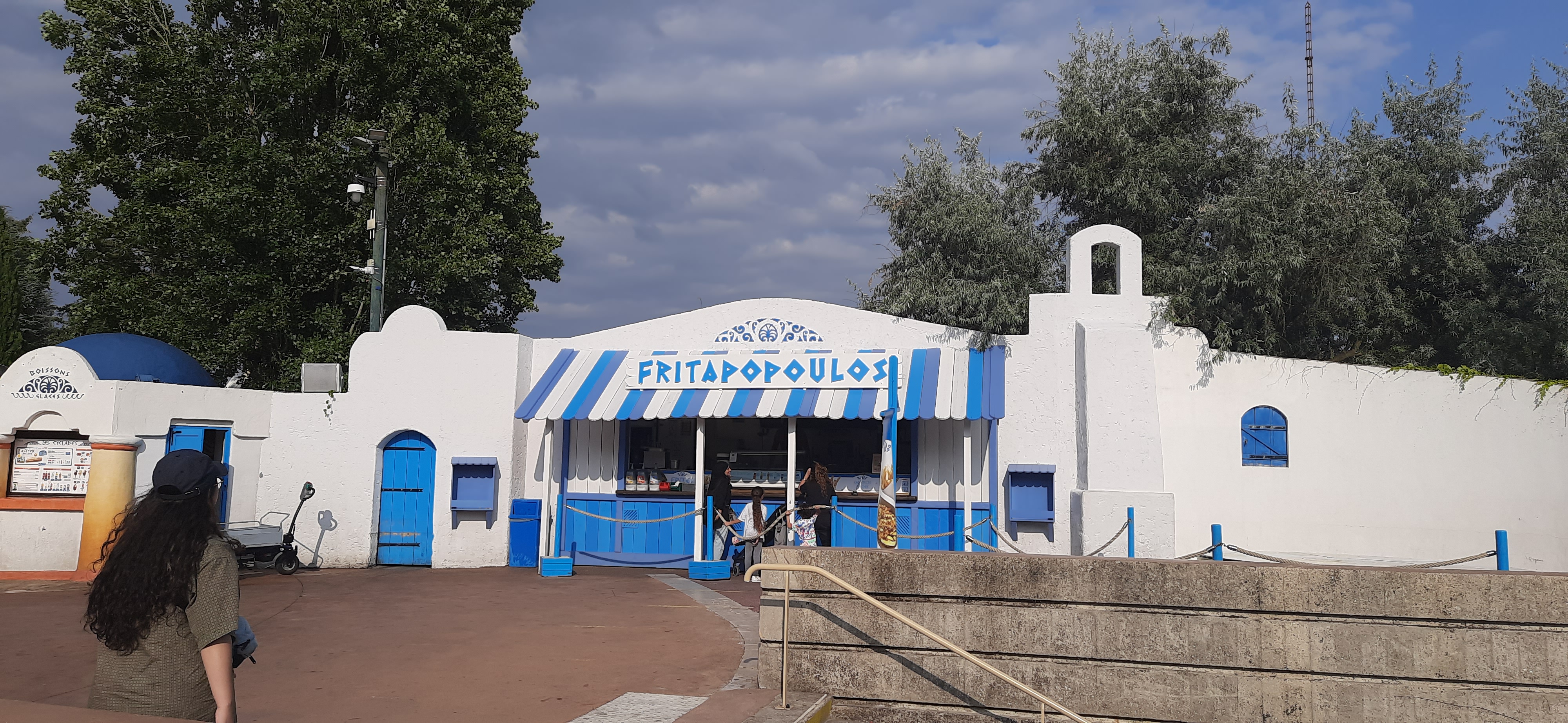 Un bon déjeuner rapide avec une portion de frites de Fritapopoulos. En fait, ils ne vendent que des frites et il y a un choix de boissons. Exactement suffisant car vous obtenez rapidement votre portion de frites bien frites, croustillantes, bien parfumées et pour un prix attractif. Ce sont des frites de Farm Frites, qui garantissent effectivement une bonne qualité si elles sont bien frites. Vous pouvez ajouter la sauce vous-même à l'aide d'un distributeur. Le nom de cet établissement de restauration « Fritapopoulos » est particulièrement drôle et a été inventé par le parc. La branche est conçue de manière réaliste dans un style architectural grec et avec les couleurs blanches et bleues bien connues. Il n'y a pas de bancs avec des tables pour s'asseoir, mais il y a suffisamment de place à proximité pour trouver un siège avec une table ou un endroit au bord de l'étang. Astuce : autant déjeuner chez Fritapopoulos car pourquoi prendriez-vous ailleurs un repas complet bien plus cher alors que vous êtes dans un parc d'attractions ? En famille, vous pouvez facilement économiser le prix d'un billet d'entrée pour votre prochaine visite.