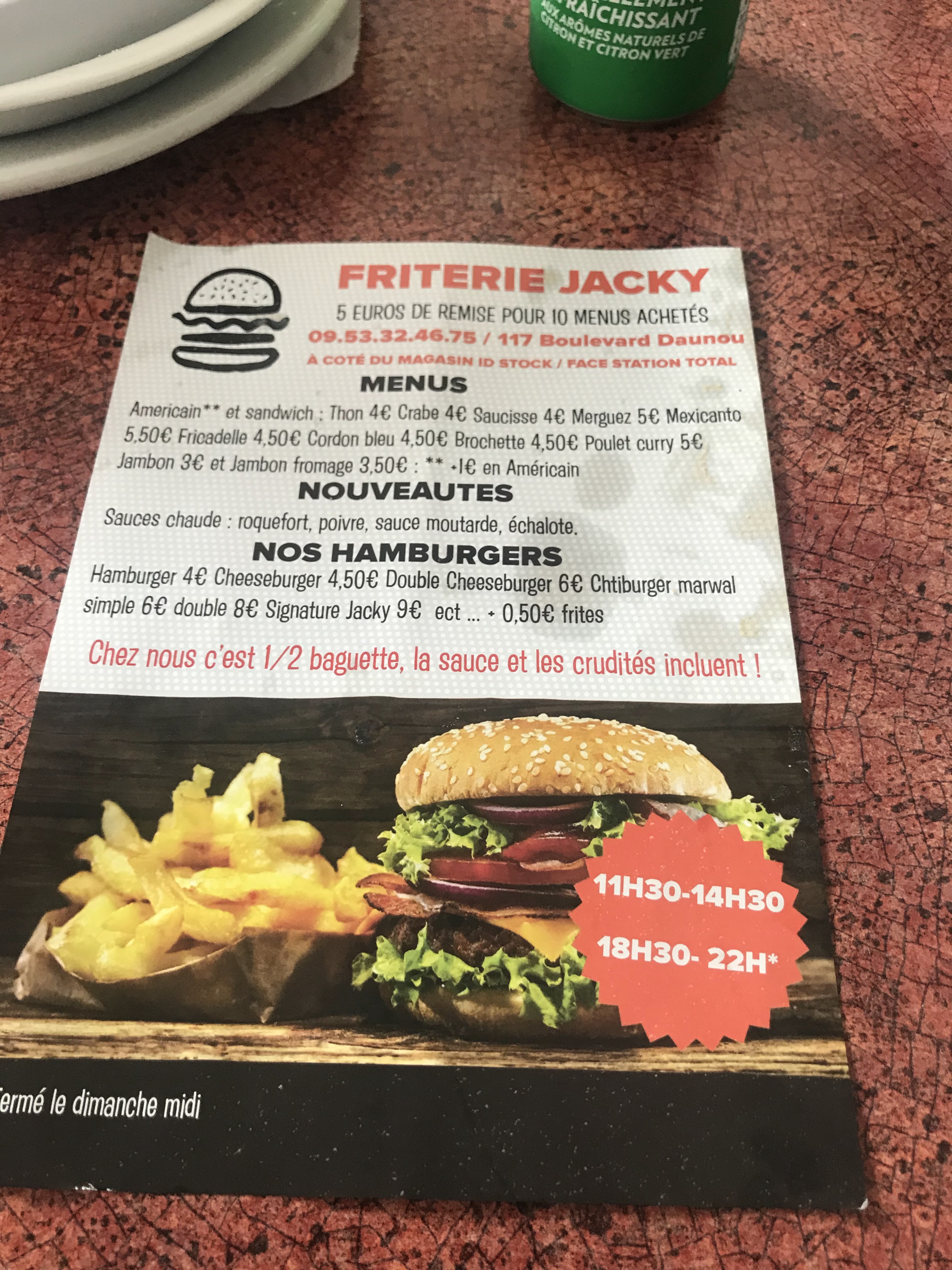 J'ai voulu goûter les frites chez Jackie pour la 1er fois et faire plaisir a ma femme et j'ai été déçu les frites je les ai trouvés pas Bonne du tout pas cuite on aurait dit des frite cuite au micro ondes franchement tres déçu et pour l'hygiène pour ma part pas tres Propre