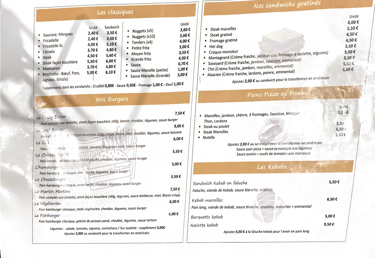 Bon rapport qualité / prix 👍🏻 Personnel courtois et ambiance familiale. Repas bien chaud 🔥 Top pour du dépannage. Petit bémol : Il manque un panneau d’affichage des prix pour les ventes sur place et à emporter (seul un papier A4 plastifié est posé sur le comptoir sans explication des propriétaires, difficile à comprendre le principe pour une première visite).