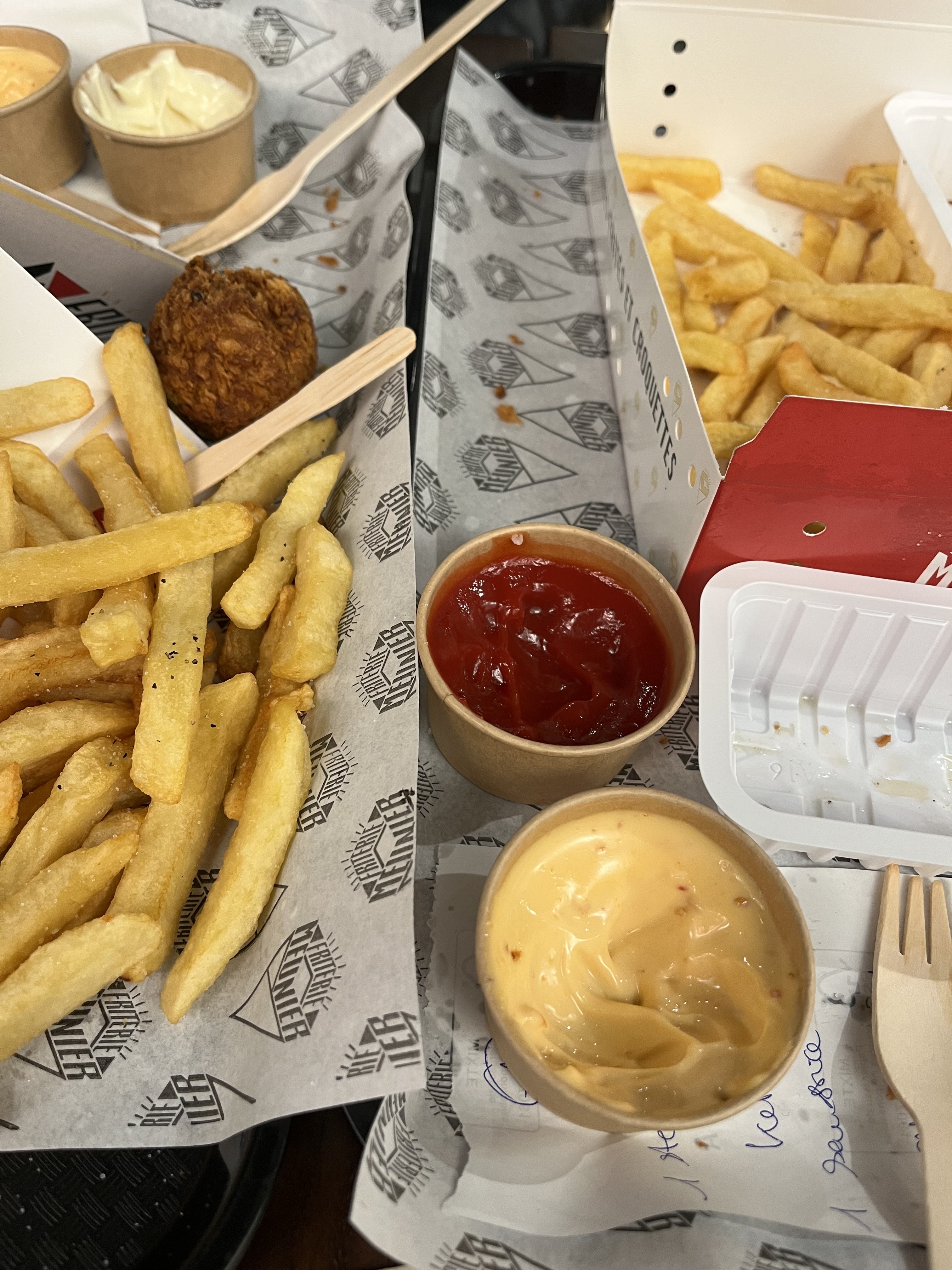 Les frites sont fabuleuses par contre, les fricadelles n'ont rien à voir avec nos traditionnelles fricadelles que nous apprécions tous et toutes. N'habitant plus la région je me faisais un plaisir d'en déguster, je suis très déçue. Sinon, les burgers sont très bons, les croquettes pas tops.