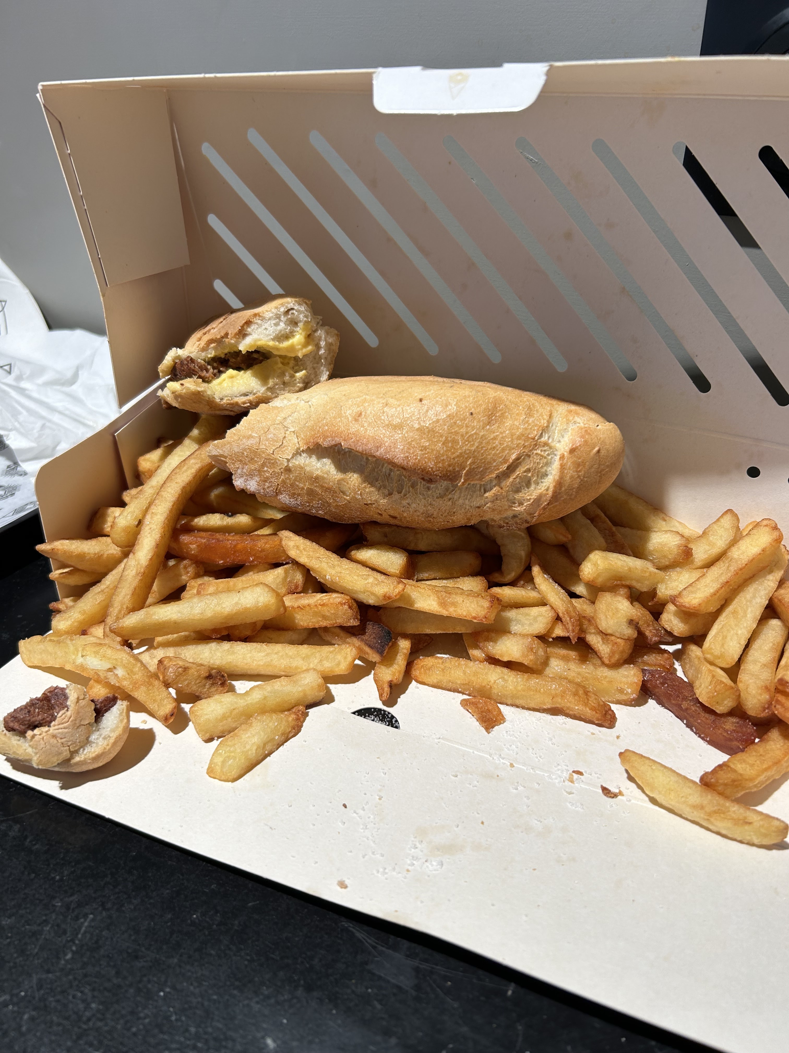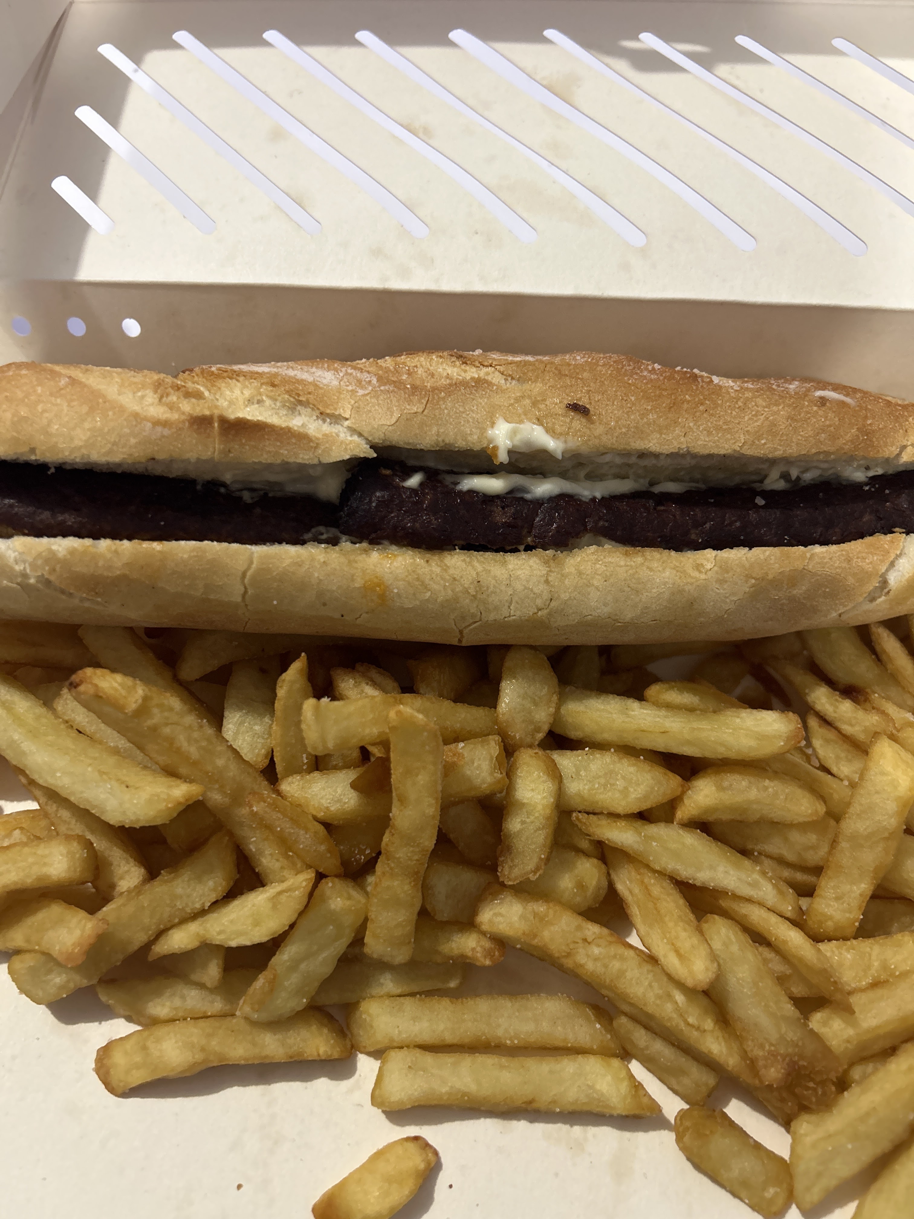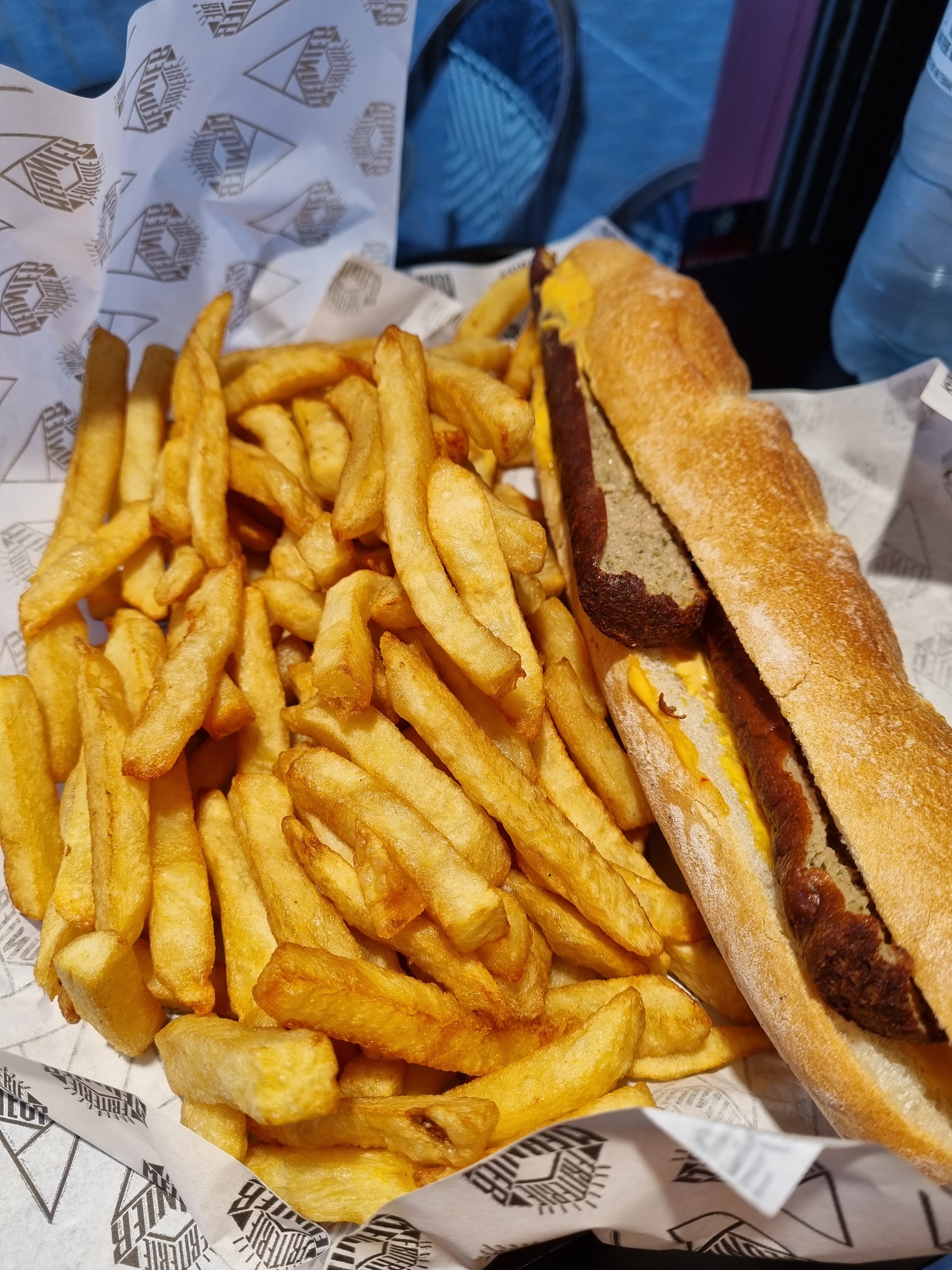 Je m'attendais à mieux au vu du battage qu'on en a fait... Le goût y est MAIS à l'attaque la frite est molle, mal cuite, fort blanche. Trop de sel, beaucoup trop et mal réparti, certaines frites sont salées comme pas possible et d'autres pas du tout. Surpris qu'on soit obligé d'avoir du sel sur les frites, dans une friterie traditionnelle on demande au client. D'autant plus déroutant pour une friterie qui se veut premium... Les gants noirs ne suffisent pas à faire de la bonne bouffe... Le packaging est pléthorique mais ce n'est pas ce que je cherche hélas car le carton se ne mange pas. En post scriptum parce que je viens de commencer le pain, quelle est cette saucisse ? Si je dois manger halal j'aimerais être prévenu.