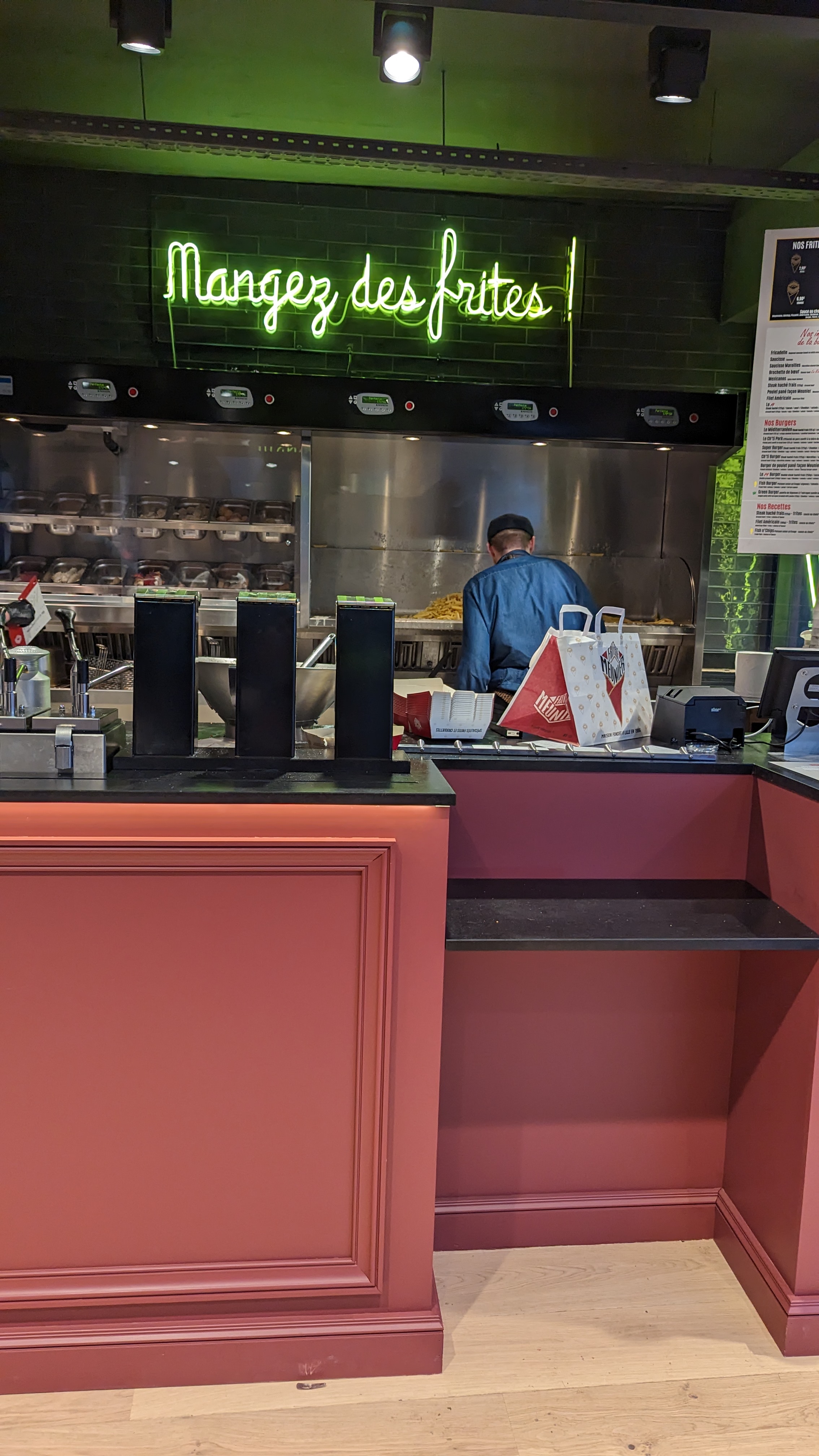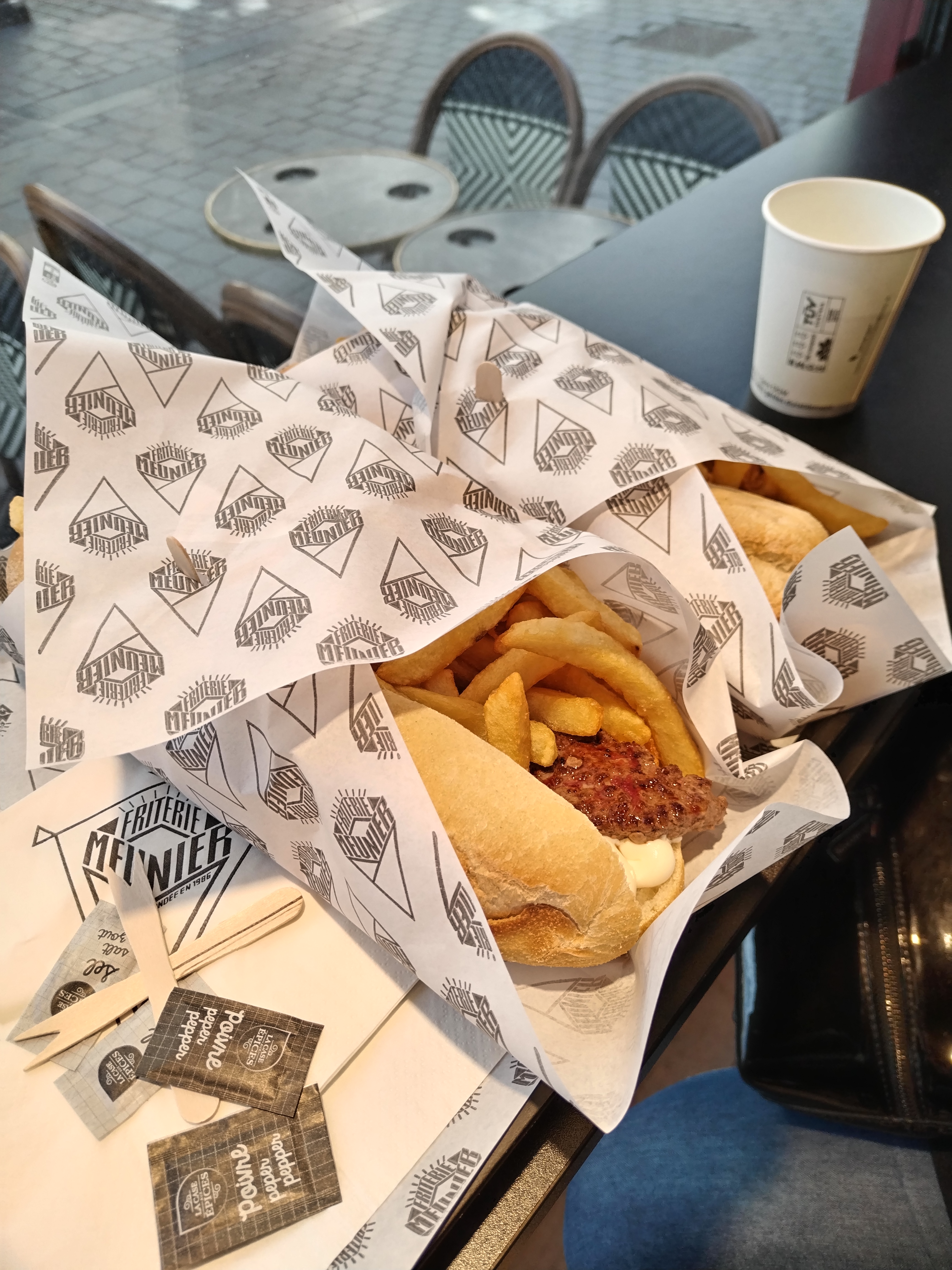Premier point : Menu pas clair du tout ! Dans ma logique et comment sont placés les prix, ça me laisse supposer que le Super Burger, avec frites, me coûtera 9,90€, faux ! On t'annonce 14,30€ ! Pardon ! à ce prix là, on mange des Super Burger dans n'importe quel brasserie de la Place des Héros comme le P'tit Démon, l'Estaminet, le Bureau... Assis, en intérieur ou terrasse, pas 15 minutes dans un carrefour ou un simple coin de table pour enfiler ta commande. @friteriemeunier : Il y a une erreur sur votre menu (du compte Google en l’occurrence), dans nos frites fraîches : PETITE 6.90, c'est pas GRANDE plutôt ? Il y en a peut être d'autres... Second point : L'accueil Alors c'est poli, c'est courtois mais vite fait. Je demande à changer la sauce à l'intérieur de mon burger, l'employé me dit :C'est impossible, c'est comme ça. Je demande à retirer la tomate, l'employé me répond : C'est noté. Heureusement que je suis pas allergique. Troisième point : Le Menu à 14,30€ ! - Le burger : Le pain très bon, salade fraîche et généreuse, steak cuit à la cuisson demandé, sauce bonne, bonne présentation mais, évidemment qu'il y a un mais, un bout de maroilles fondu sur le bas du burger et de la boite. - Les frites : Bonnes en quantité petite, comme noté en petit et en bas sur le menu (sans te proposer une moyenne ou une grande), notons que lors de mon passage, l'huile de cuisson était déjà pas mal fatigué...Pas bon pour les poignées d'amour. - La boisson, 50cl seulement (sauf l'alcool 25cl et 50cl). C'est une friterie tout simplement, je n'y vois aucun concept, ça se donne un style avec des cornets et boîtes en carton... Je préfère, afin de ne pas augmenter ma consommation inutile de carton, ne jamais retourner commande chez Friterie Meunier. Je précise que niveau nourriture c'est top mais concept à revoir et prix un peu trop élevé.