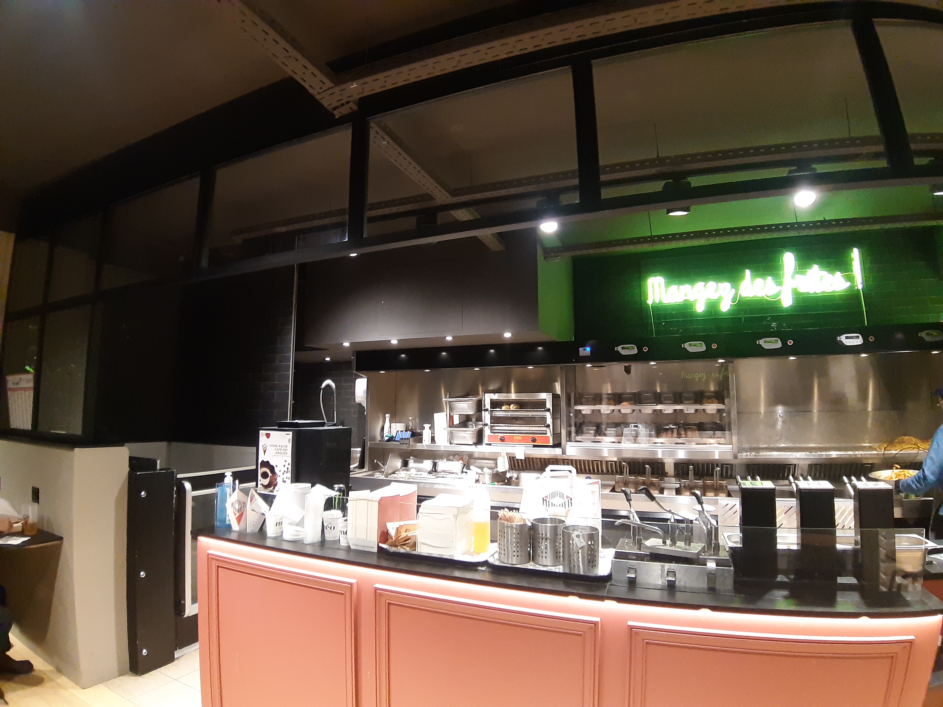 Le lieu est sympa , cependant gros courant d'air insupportable, pas de portes , en hiver j'imagine même pas la fraîcheur , inenvisageable pour moi d'attendre dans un froid glacial. Le monsieur à l'accueil devrait sourire un peu aussi c'est pas plus cher je pense. Et 7e pour trois croquettes je trouve ça un peu abusé aussi. Mais niveau hygiène ça a l'air clean en tout cas.