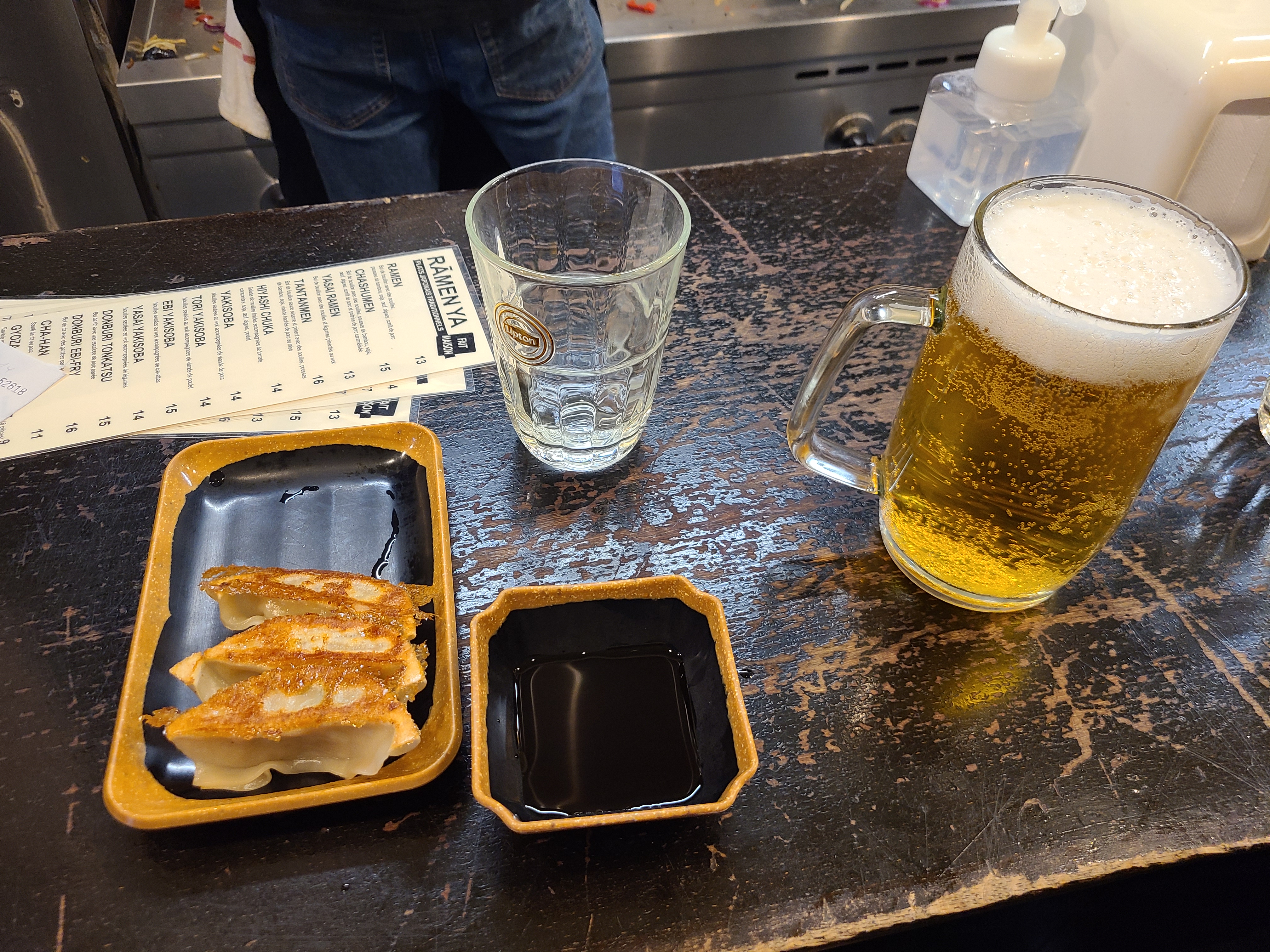 On mange nos soupes / ramen et riz sauté directement au comptoir...assez pittoresque et plutôt convivial. Plat copieux et prix correct Et les gyozas, un delice...