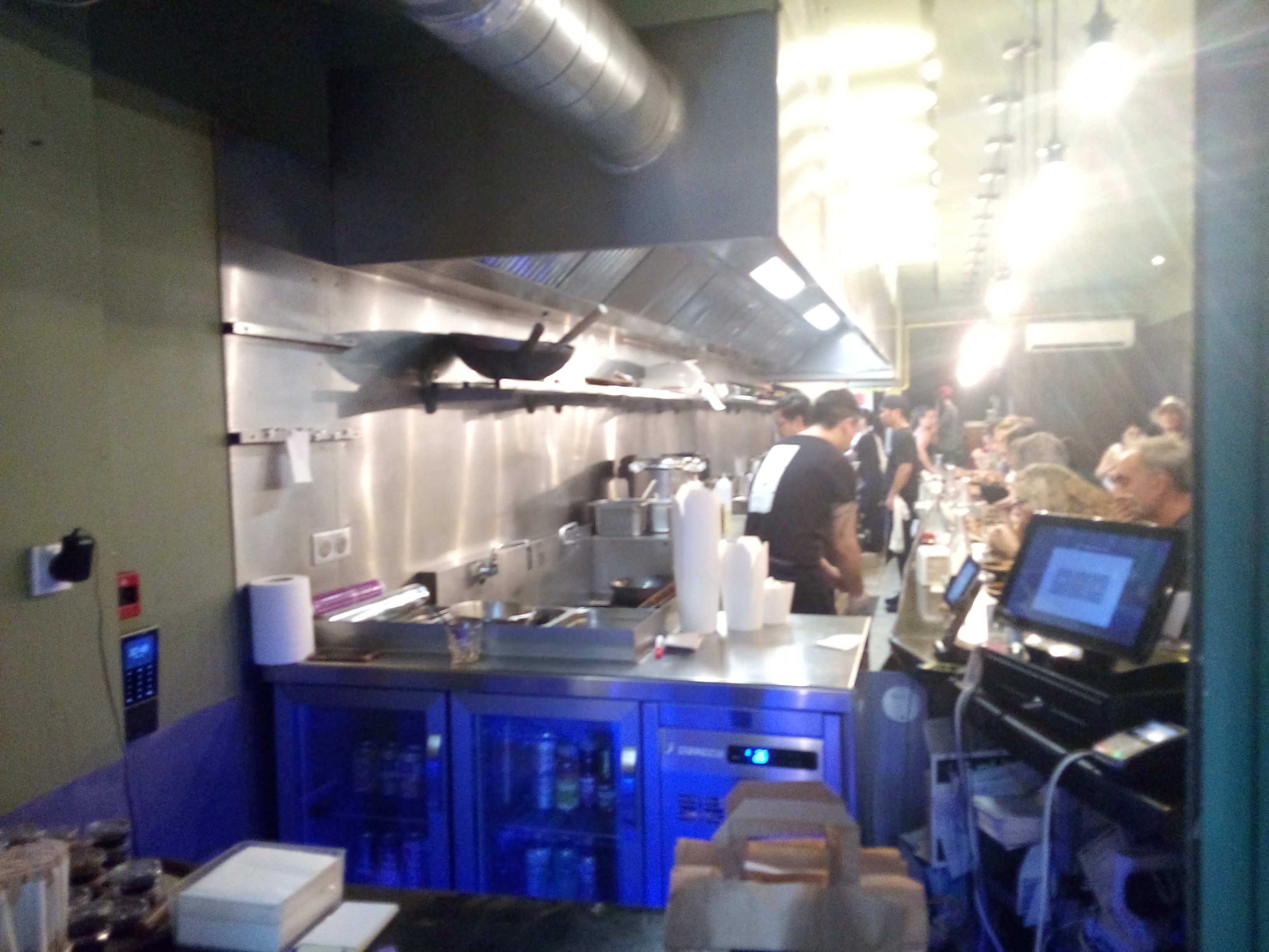 Nous sommes plongés dans leur univers, beaucoup de place derrière le comptoir / cuisine ouverte et on aime tous ce truc non? Les flammes, le bruit des woks et l agitation des cuisiniers, au top ! La carte est courte mais suffisante, les plats sont copieux, ça c est sure mais manque d un petit truc. Les prix sont correcte. Super pour manger un plat rapide sans s éterniser.