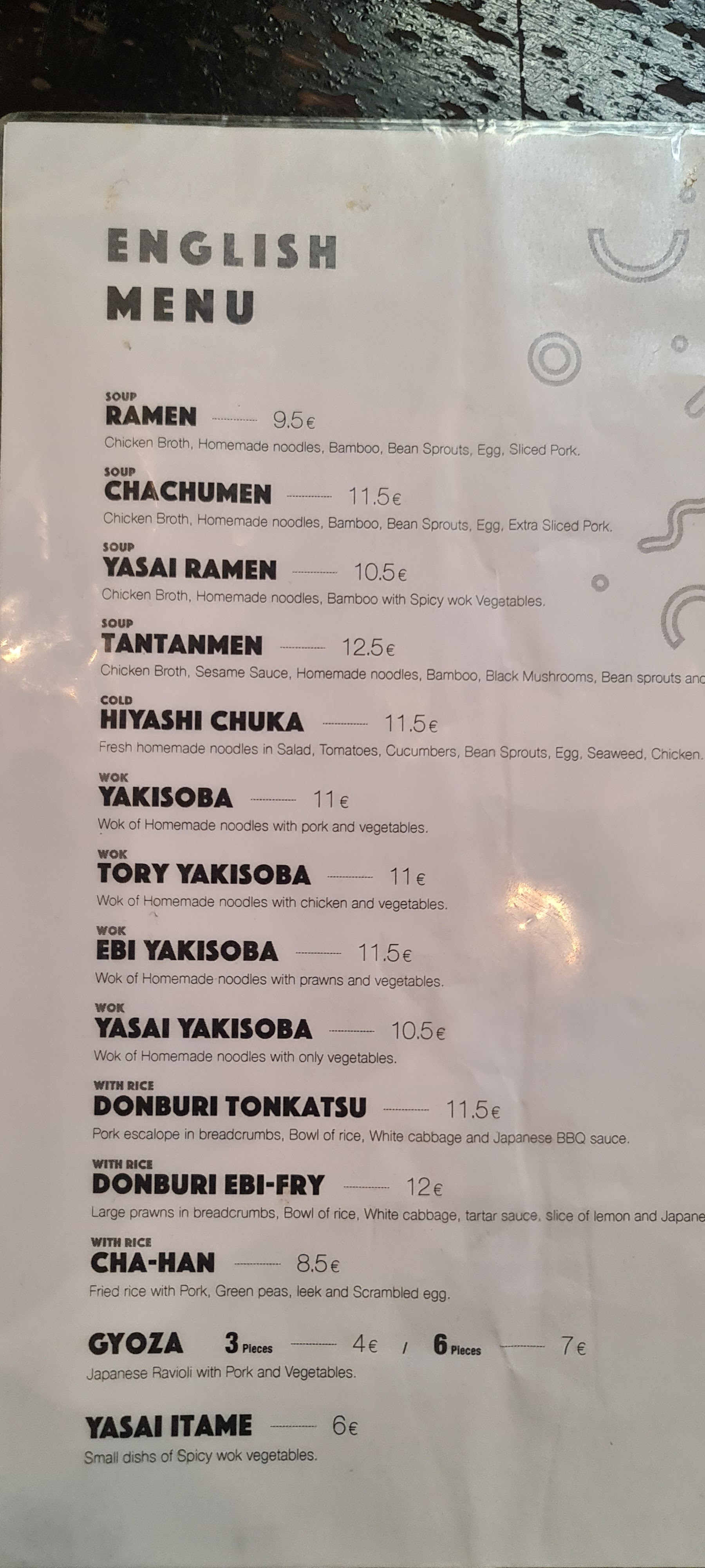 Bon repas, nouille sauté poulet et crevette qui étaient bonne et gyosa également Mais cher je trouve surtout les gyoza franchement 5 euros les 3 c'est trop, quand on sait combien ça coûte au Japon ... Restaurant un peu petit et exigu.