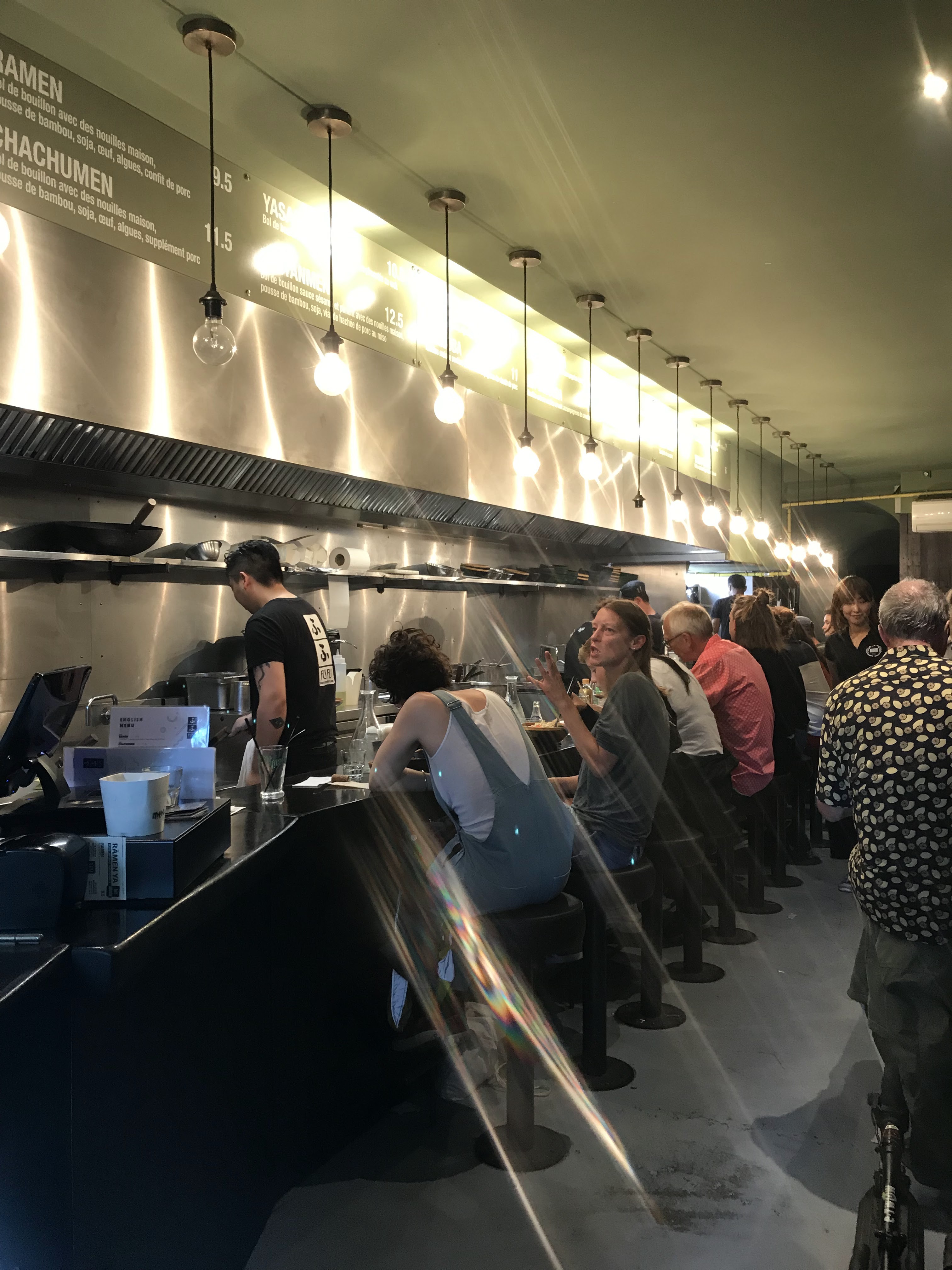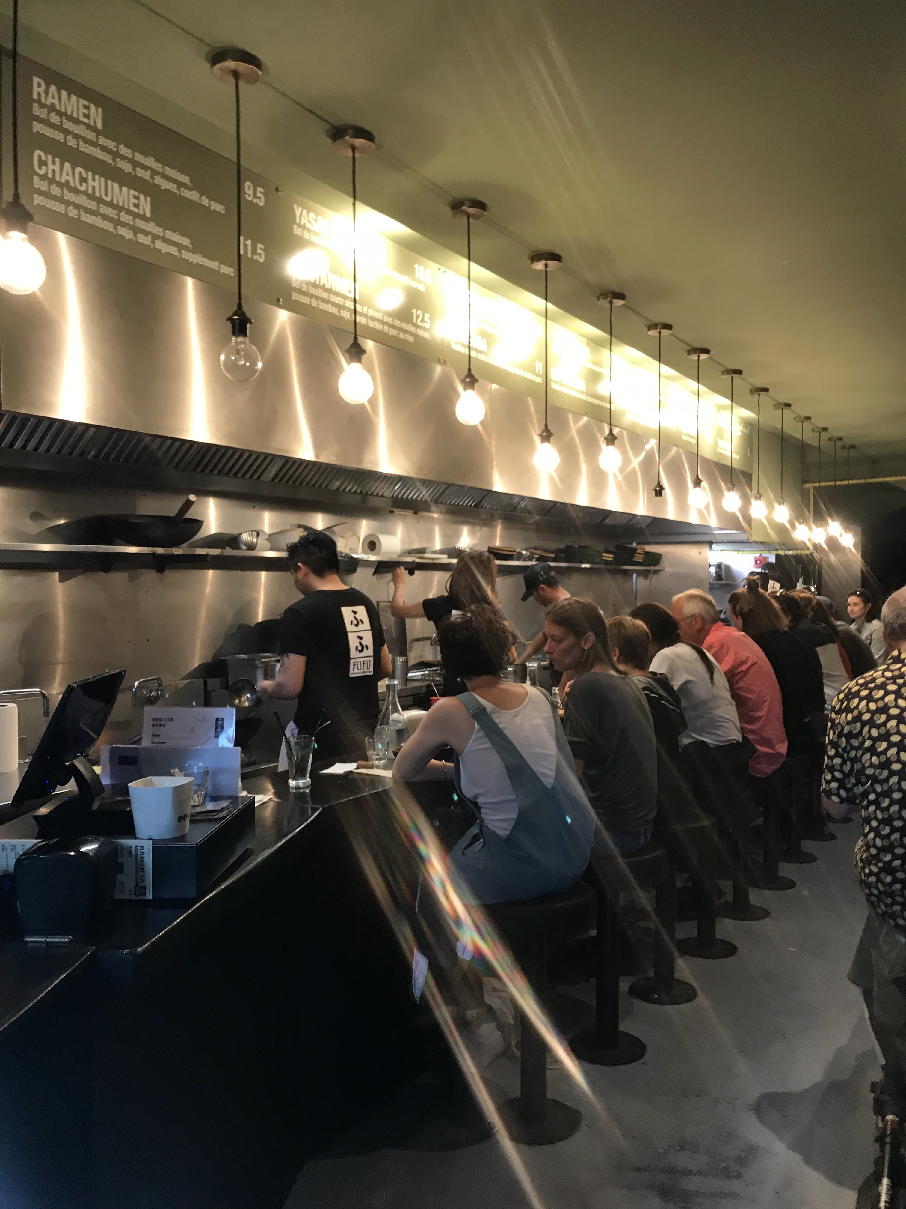 Restaurant de nouilles japonaises à tester, surtout quand il fait froid. Si vous y venez à deux, des tables sont disponibles le long du restaurant (3 tables). Sinon, vous serez installés au bar en fonction de la disponibilité. L’ambiance est conviviale. Les plats sont préparés devant vous par une équipe talentueuse. Les tarifs sont raisonnables tandis que les portions conviennent aux appétits. Seul bémol : la file d’attente. La capacité du restaurant étant très limitée, l’attente à l’extérieur peut parfois être très longue. Nous y avons déjeuné le samedi et dîné le dimanche, comptez 40 minutes d’attente (samedi midi pour 2 personnes) et 55 minutes (dimanche soir 21h pour 03 personnes). Il est toutefois possible de commander à emporter.