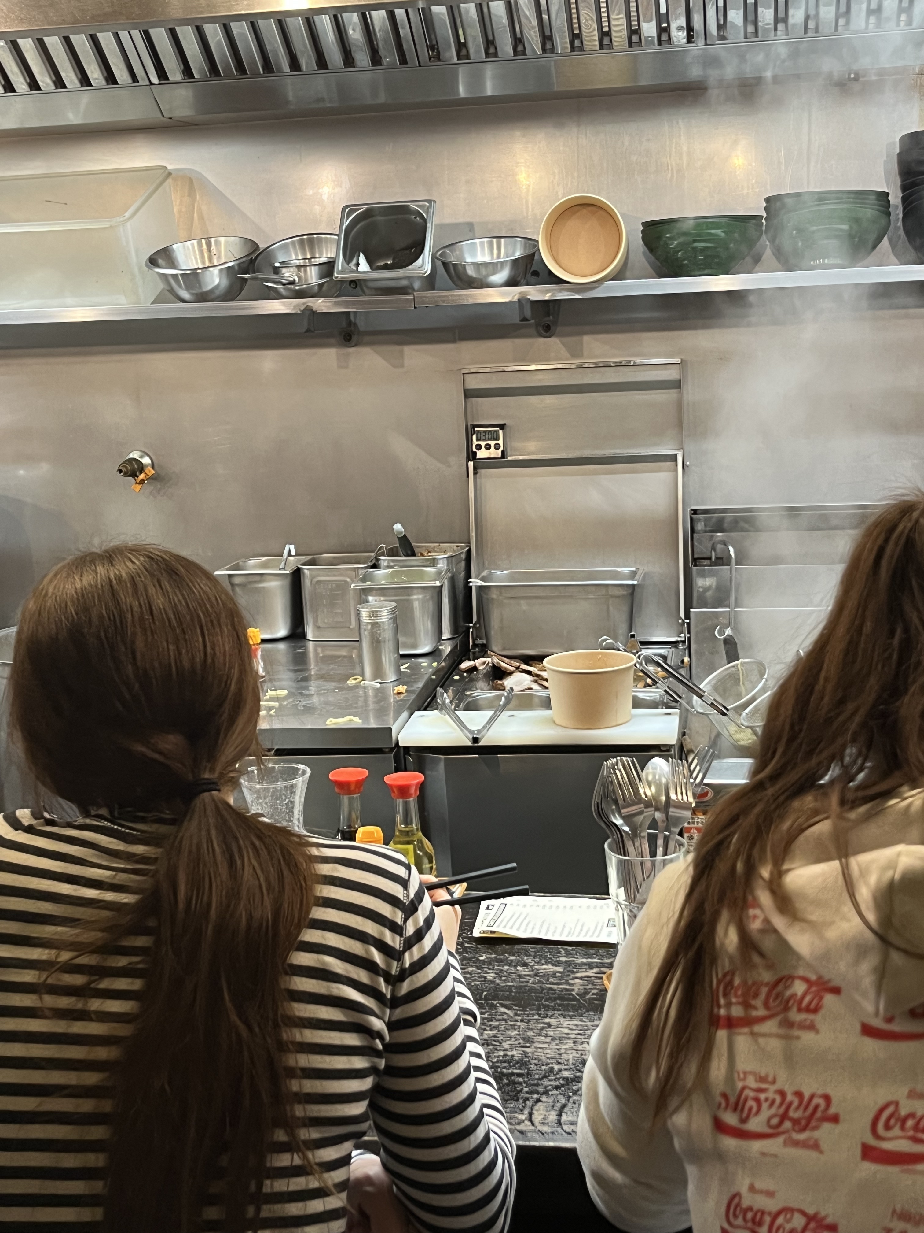 Vue sur les éléments de cuisine absolument dégueulasses les jeunes aux fourneaux jouent entre eux .. aucune attention pour ceux au comptoir qui les regardent...on egoutte les pates par terre, les sauces jaillissent partout...et je ne parle pas de la cuisson des guyosas. A essayer quand il pleut. On n´à qu´à s´assoir sur son imper mouillé.. comment dit on senssas en japonais???
