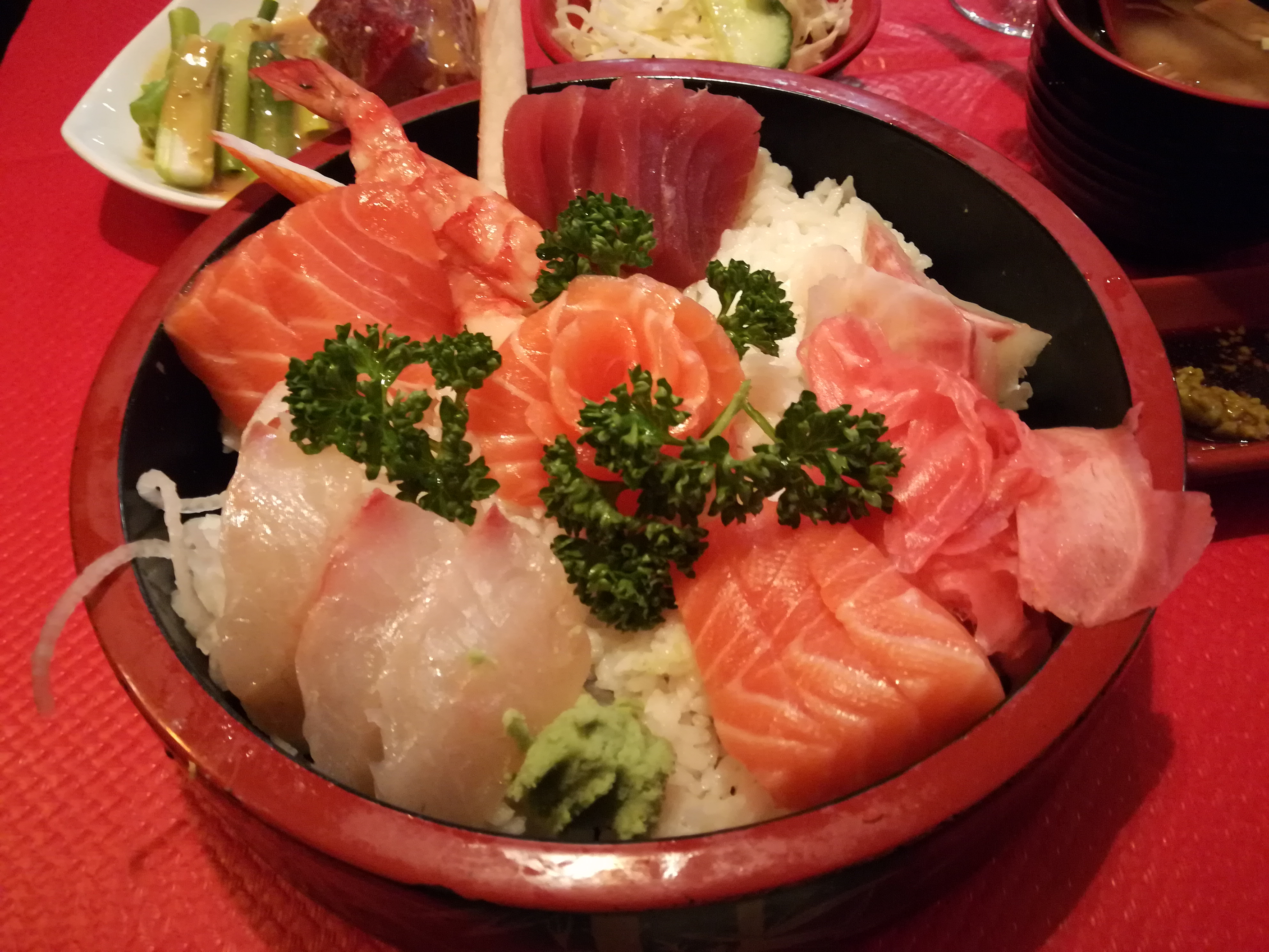 Médiocre, riz compact et collant, tranches de saumon grossièrement coupée pour un chirachi. Instruction de commande non respectées. Maki neige énorme avec trop de riz, collant et sans goût. Je ne recommande pas.