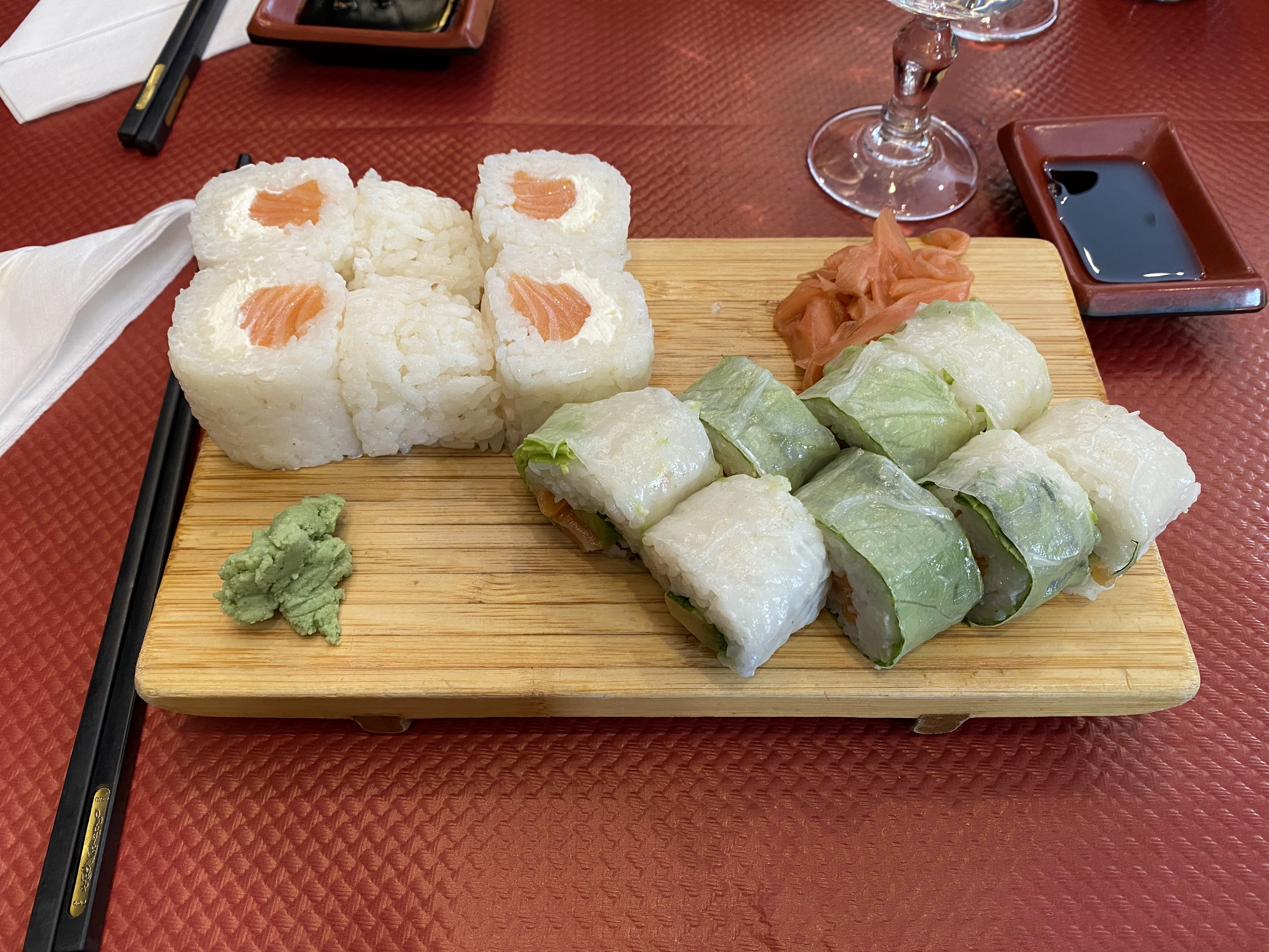 Bon rapport qualité-prix. Nous avons dîné sur place et avons également commandé en livraison. Tant la livraison que le service étaient très rapides. Cependant, il y a très peu d'ingrédients supplémentaires : il n'y a pas assez de wasabi et de gingembre pour une personne, alors que la commande était pour deux personnes.