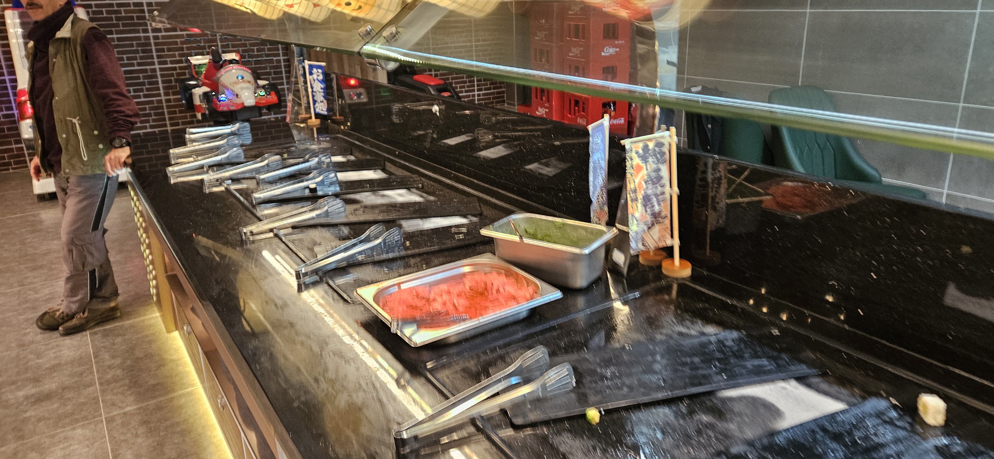 Bon petit moment !!! La nourriture est sympa !! Dépaysement assuré !! Les boissons arrivent via le petit robot !! Hihi !! Le personnel retire rapidement les assiettes utilisées !! C'est agréable !! Si on veut manger pour presque 26 euros il faut être solide !! Peut être le prix un peut fort !! Conseillé de temps en temps !!! Merci pour ce moment