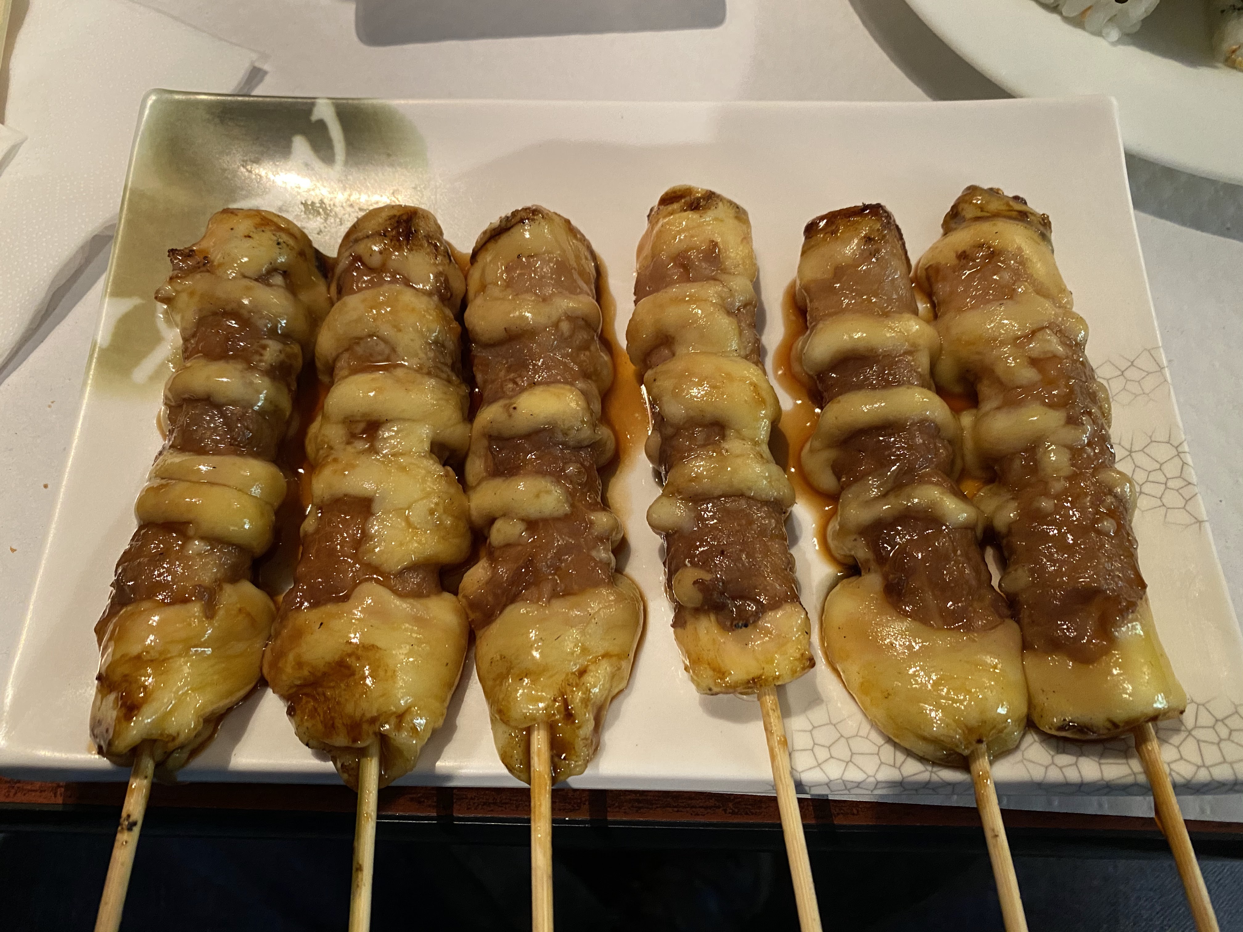 Oui j’aime quand c’est bon, beau et copieux. J’avoue j’étais seul pour ce superbe bateau pour deux…mais alors qu’est-ce c’était excellent : des sashimis fondants, des makis bien roulés et équilibrés et des sushis généreux. Sans oublier la soupe, la salade de choux et les 6 brochettes. La formule pour 36,90€, vraiment excellent rapport qualité prix, j’y retournerai