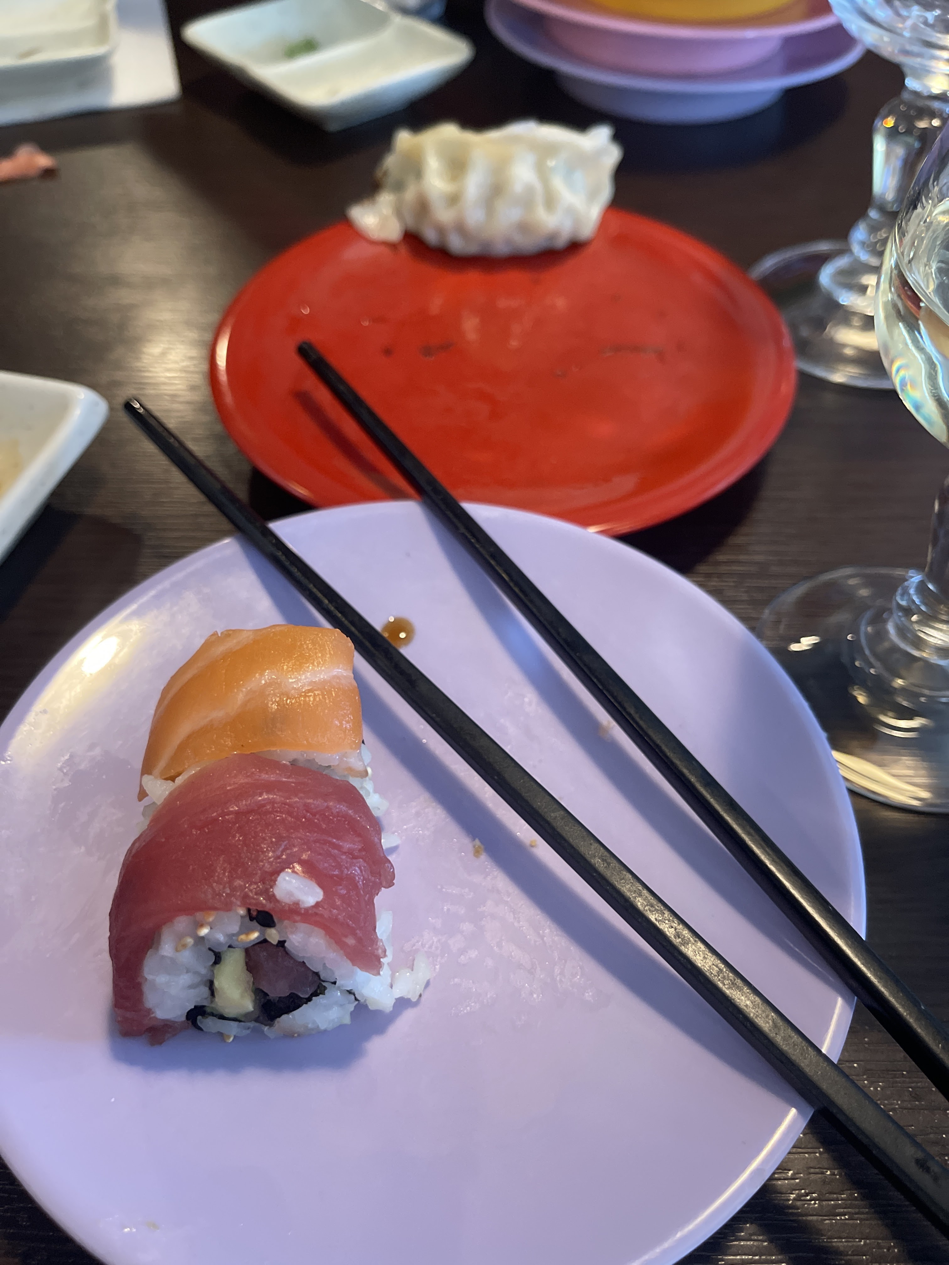 Concept sympathique cependant, moins pratique que les restaurants à volonté où l'on peut commander ce que l'on veut puisqu'il faut attendre que ça arrive sur le plateau et croiser les doigts pour que personne ne le prenne si l'on n'est pas au début du tapis