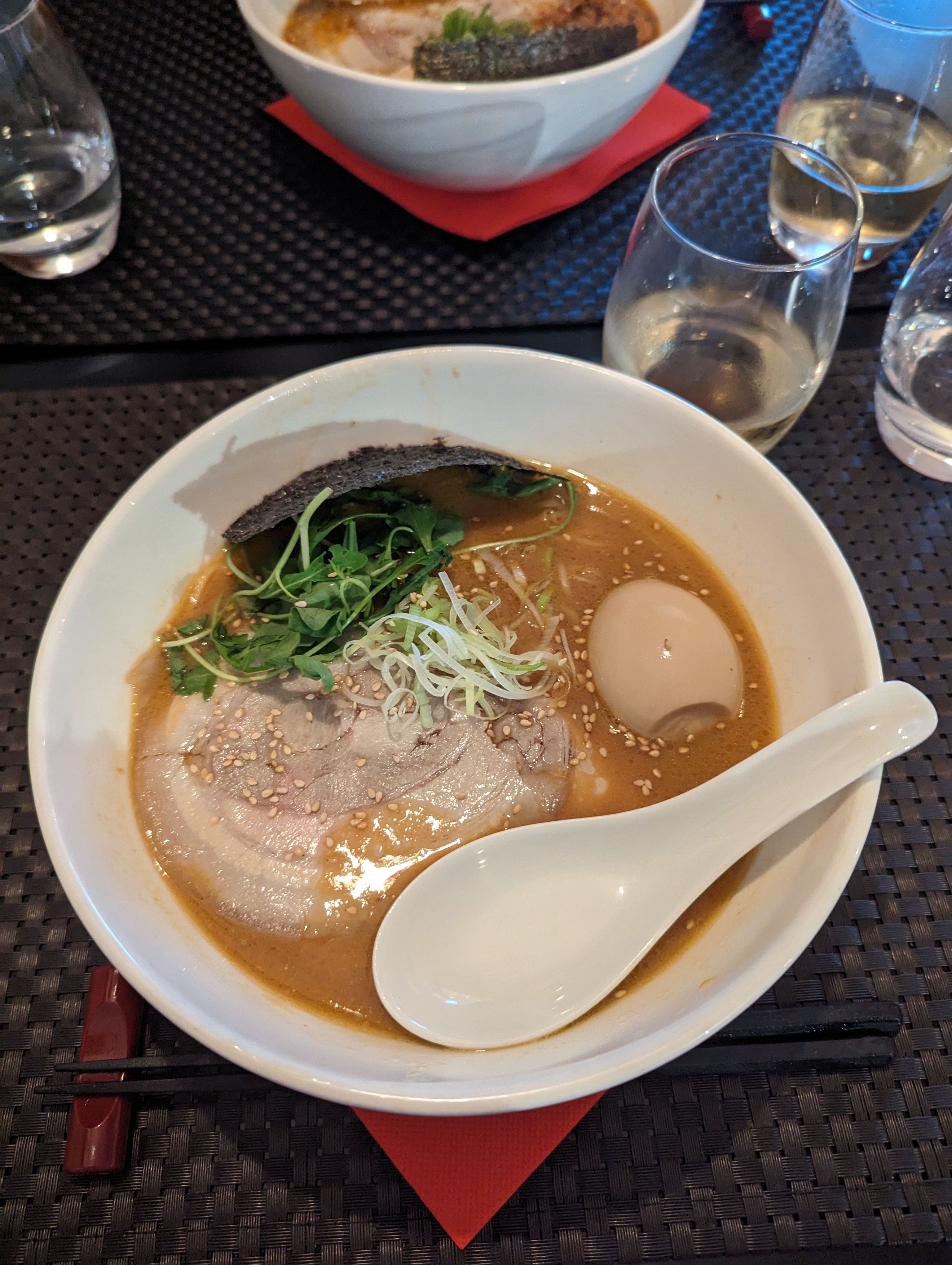Des vraies ramen tonkotsu (bouillon réduit de porc) à Lyon ! Un goût puissant mais équilibré, des nouilles qui arrivent al dente (à manger vite!) Et une garniture généreuse.