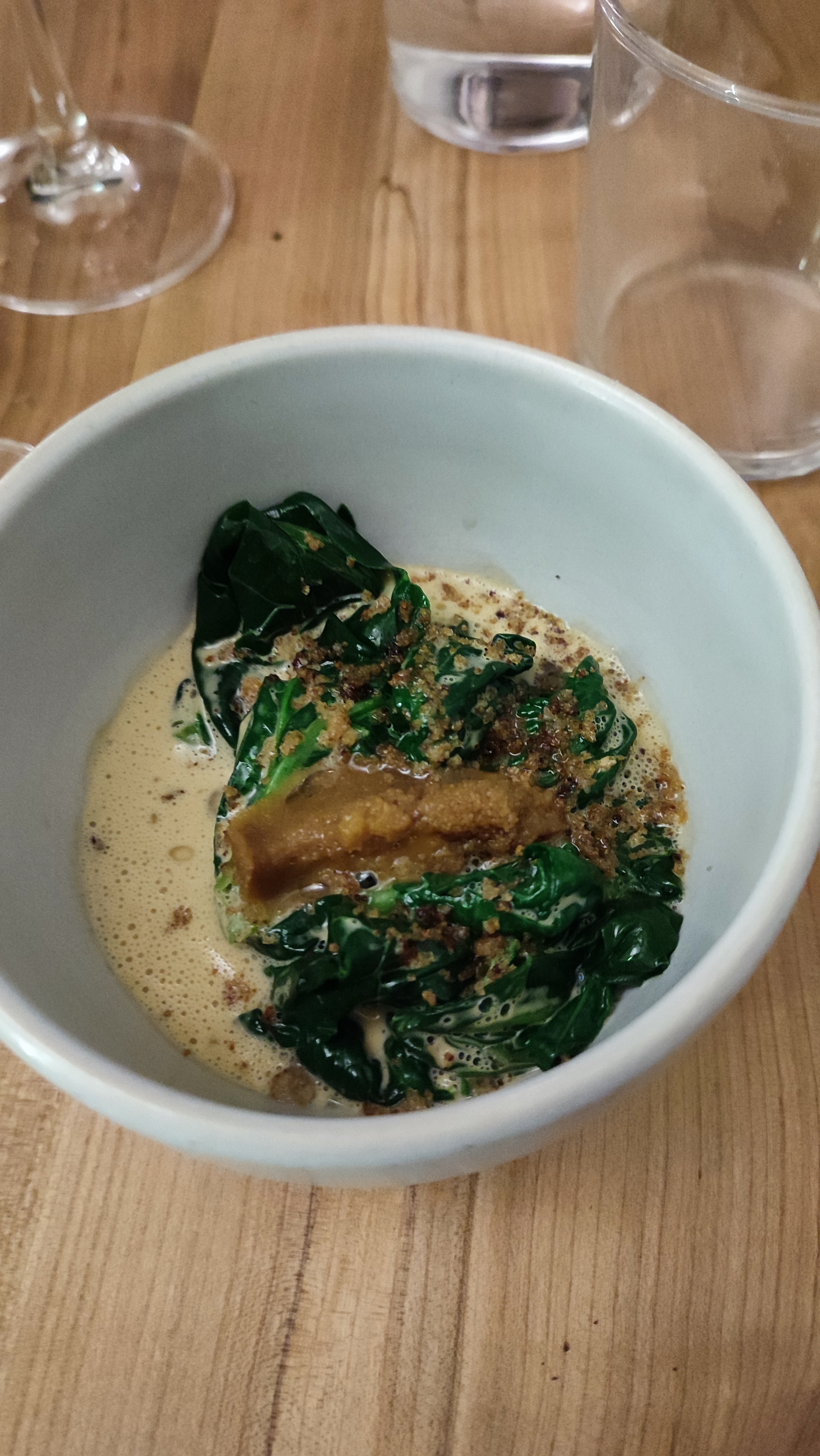 À quoi bon ouvrir ce restaurant le midi pour proposer cela ? Alléchés par la promesse d’une cuisine conceptuelle, savoureuse et moderne, quelle ne fut pas notre surprise lorsque nos assiettes (entrées + plat) sont arrivées. Quantité, qualité des « plats » et vins, assaisonnement, …une déception totale. « L’épinard, émulsion oursins et croûtons à l’ail », une bien belle formule pour décrire une salade d’épinard, sans recherche ni surprise. En plat, derrière le « thon mi cuit, graine de moutarde », se cachait en réalité un sashimi (deux fines tranches crues) aussi fade que la salade verte servie en accompagnement. Tellement déçus que nous sommes partis avant le dessert afin d’aller nous réconforter dans notre pâtisserie préférée. Difficile d’accepter cela dans le pays de la gastronomie.