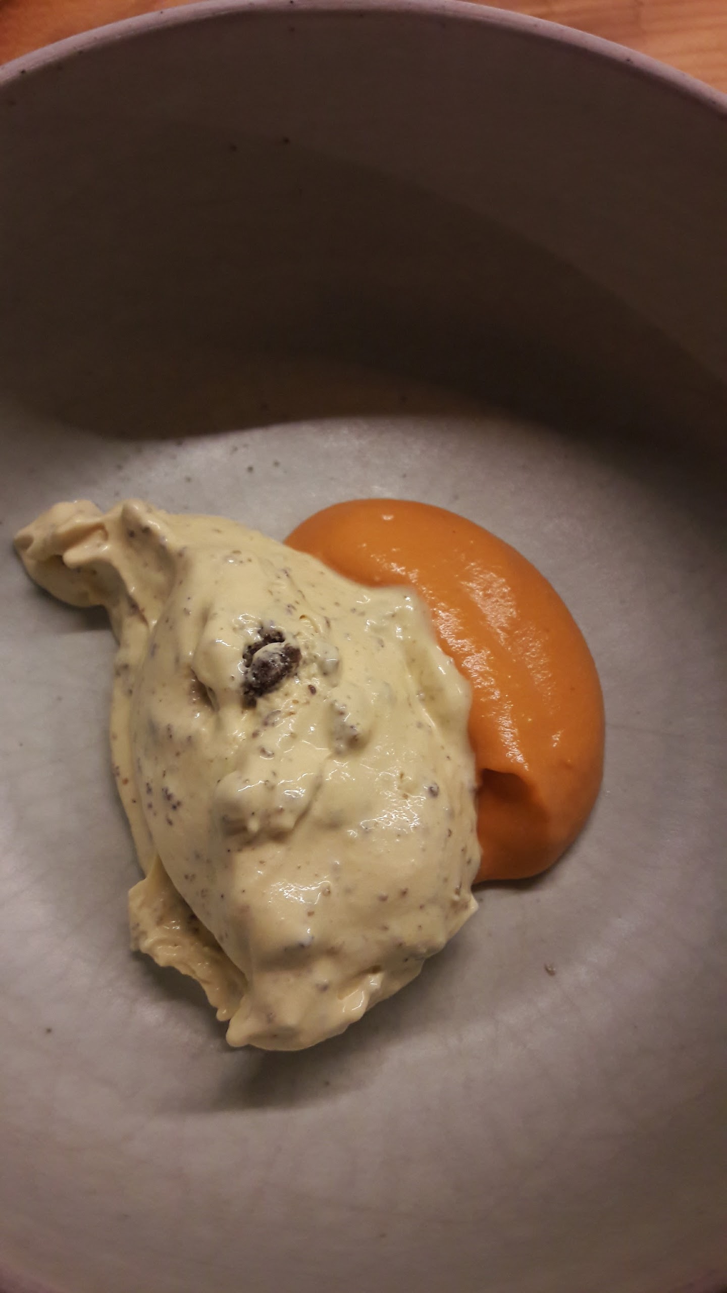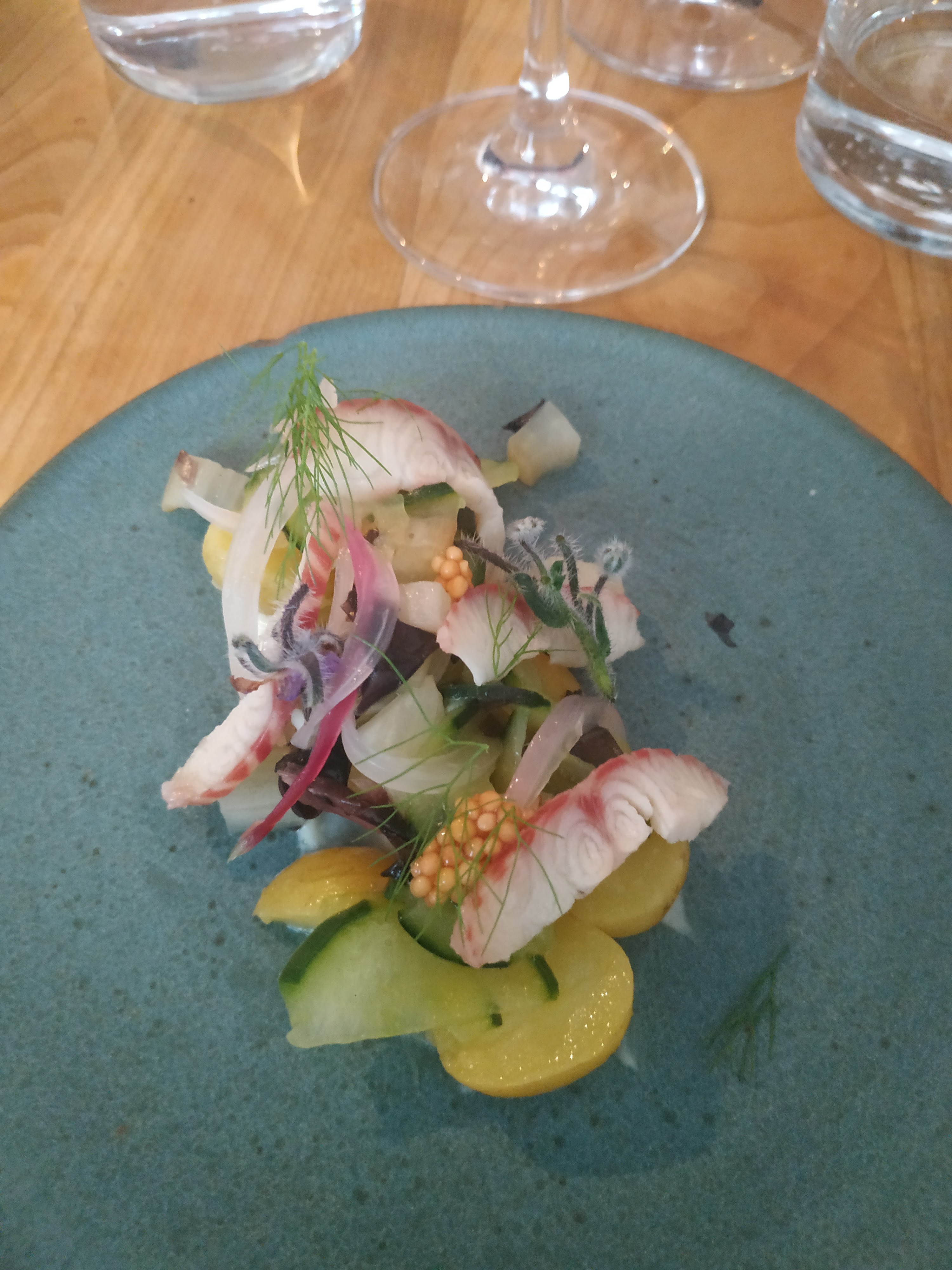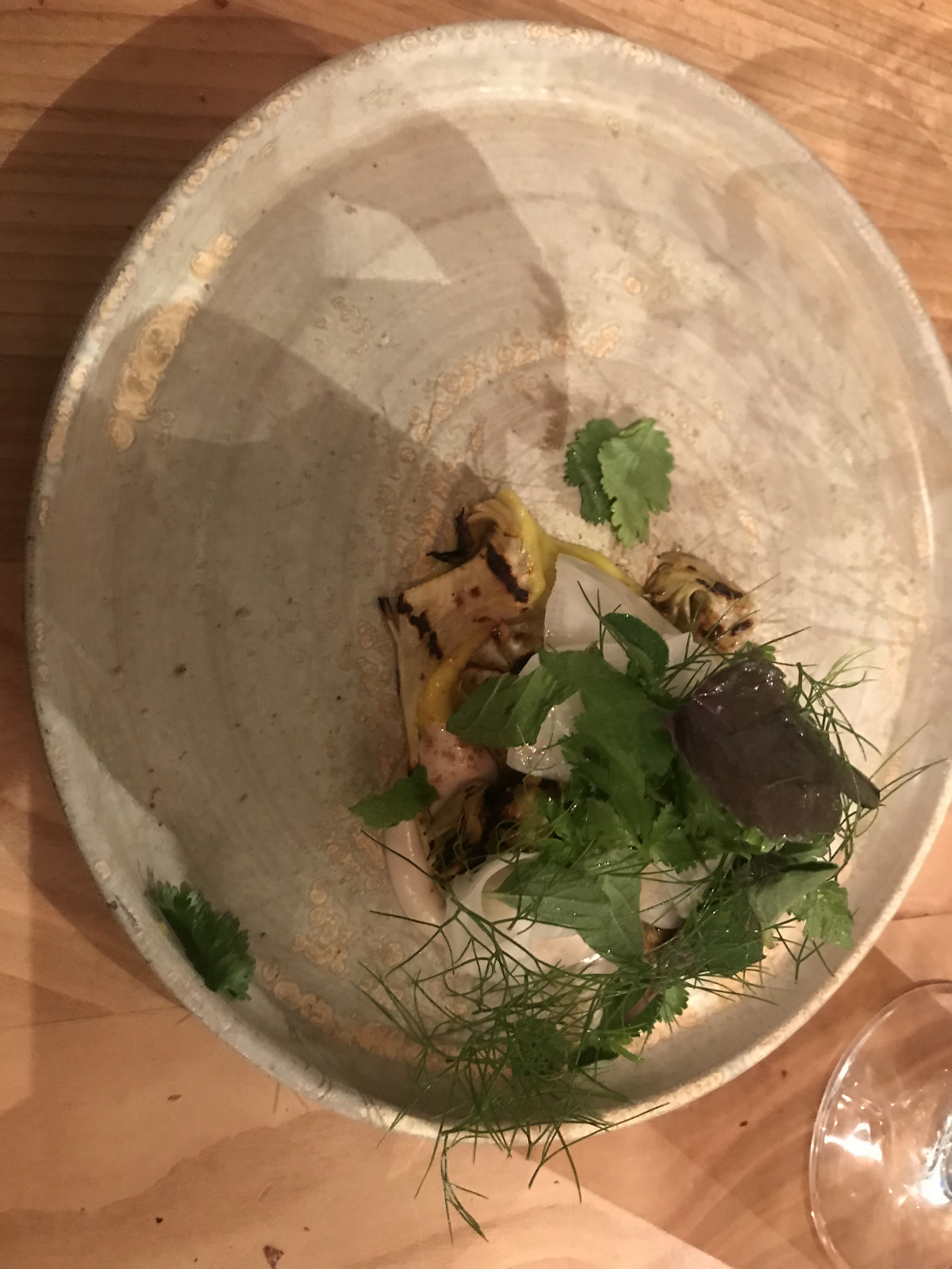 Deux heures à tables c’est un pur bonheur quand ce qu’il y a dans l’assiette et dans le verre est bon. Ce soir là un chef américain aux manettes dans la cuisine ouverte qui envoi des assiettes justes dans lesquelles le produit est roi. Accord met/vins parfait et parfois hors des accords vus et revus et le tout dans une veine nature ! Mention spéciale pour le service également.