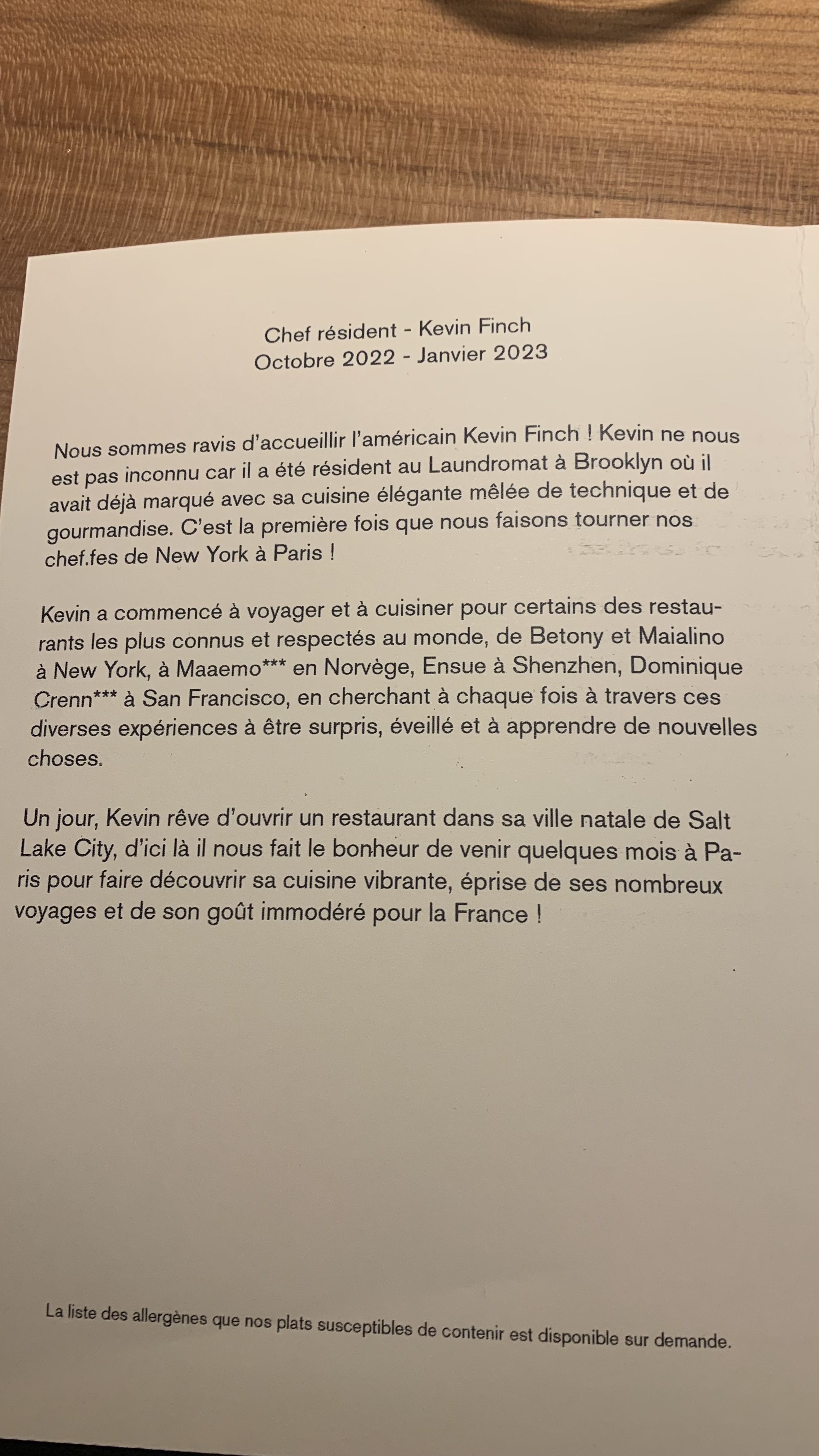 Nous aimons beaucoup ce restaurant. Nous ne savons pas a l'avance ce que nous pourrons y manger. Nous aimons y être surpris. Les chefs changent chaque trimestre ou semestre (pas certaine de la durée exacte). Par contre réservation 15 jours en avance pour le dîner pas le déjeuner.