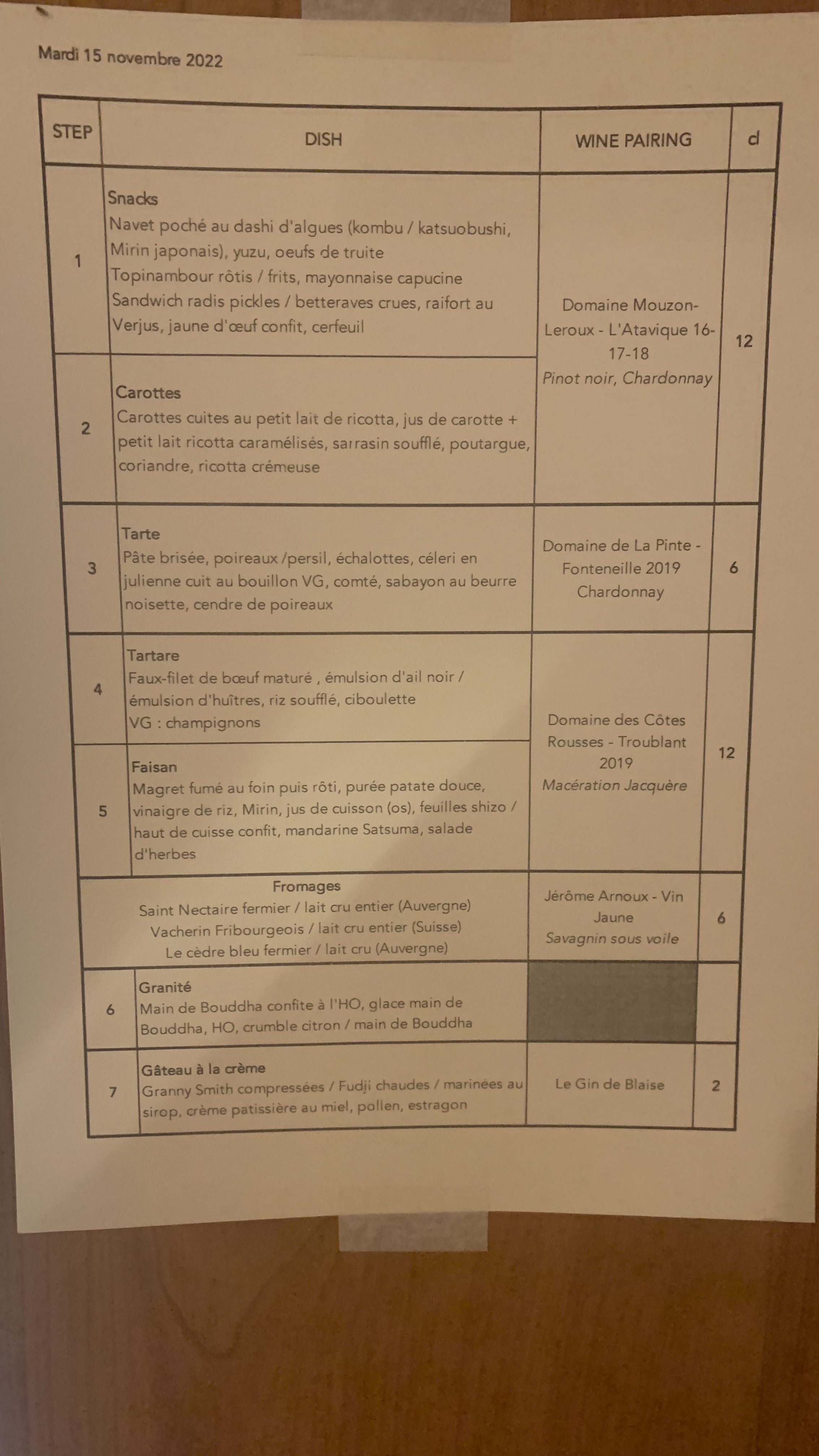 Nous avons passé un doux moment, menu en 7 plats avec vins en accord, un délice tout simplement ! Des plats savoureux et originaux !