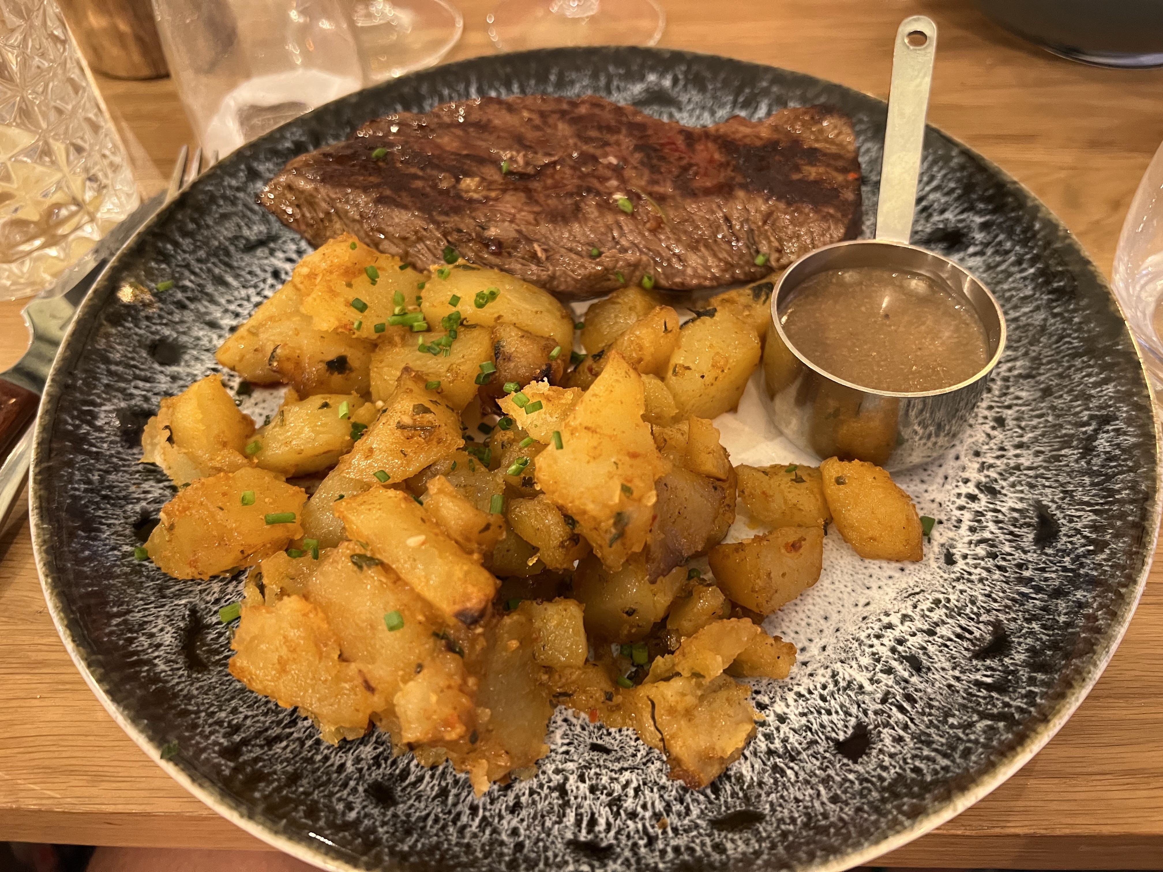 Le restaurant est confortable et dispose d'une ambiance/personnel agréable. Il se trouve juste en face de notre hôtel. Nous avons commandé des viandes (à mon goût - je viens de Porto Rico), les viandes étaient de bon goût mais pas mes préférées. Les pommes de terre au romarin et la salade étaient très savoureuses. Un peu cher.