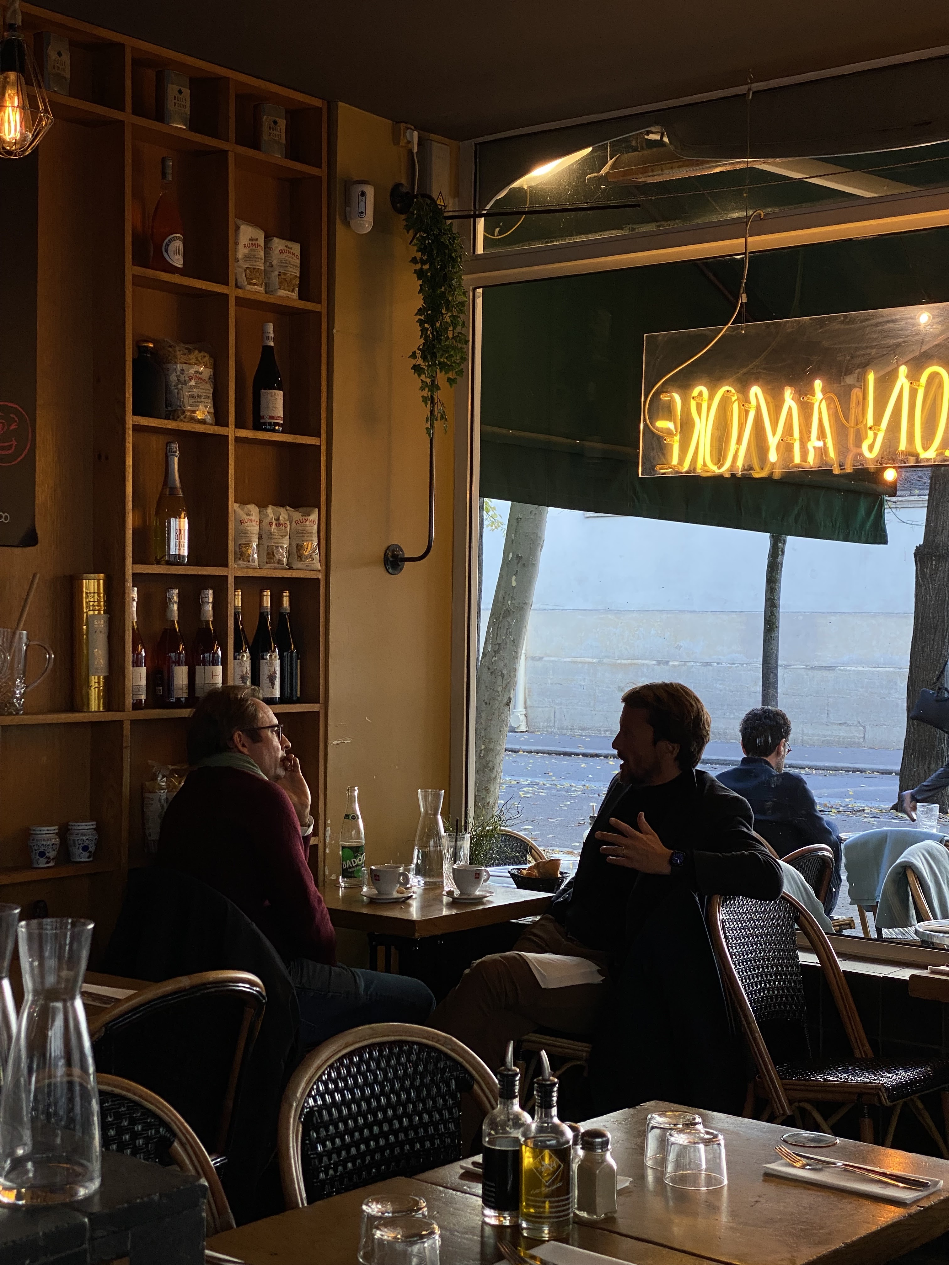On commande deux mojitos, le serveur revient pour nous dire qu’ils n’ont plus de rhum un dimanche à 18h30. Finalement on commande une bière et un spritz, le serveur revient avec deux bières. Il nous avait dit que c’était la happy hour et finalement au moment de payer ce n’était plus l’happy hour