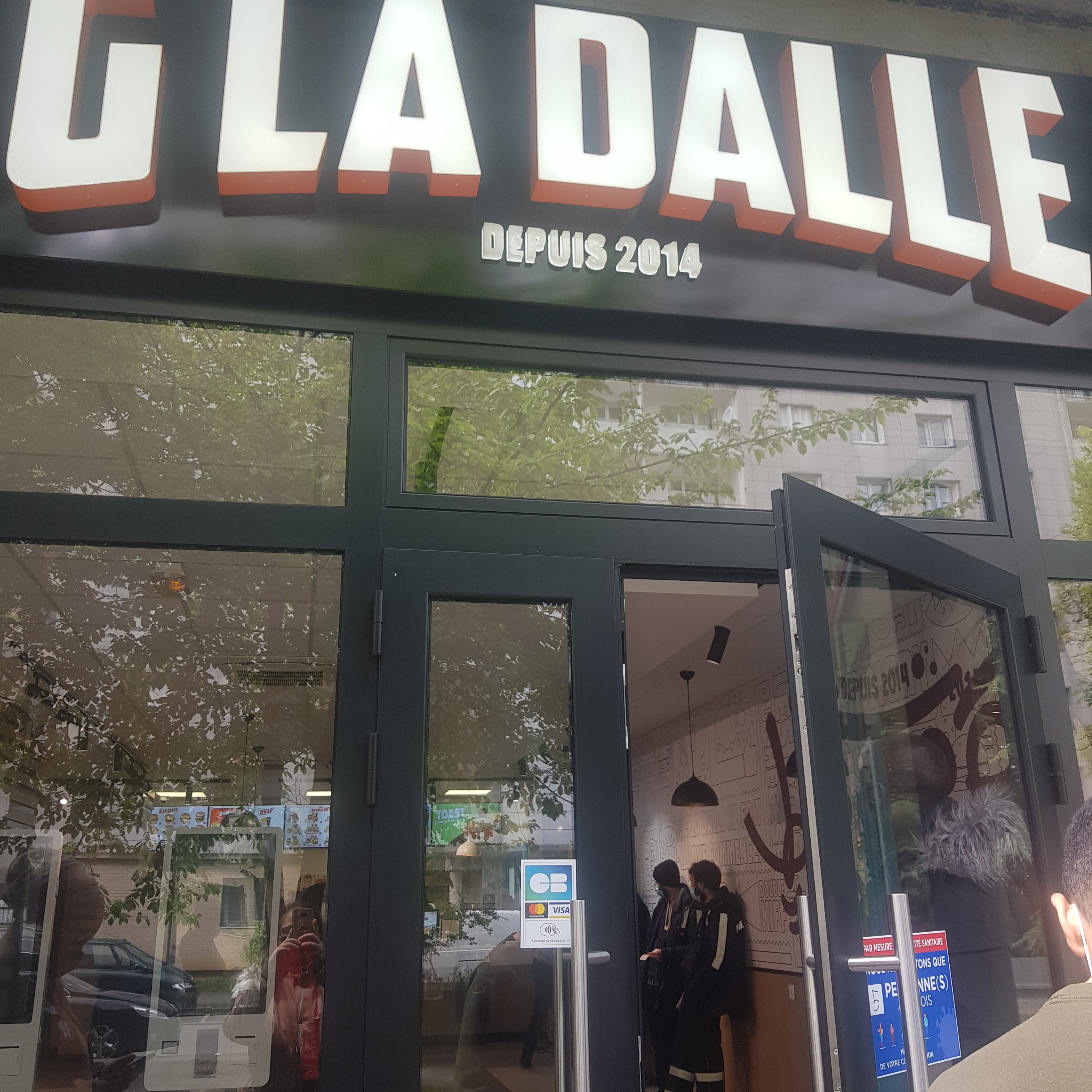 G La Dalle au top. Les burgers sont très bon. Les frites et les sauce sont servi en bonne quantité. Leurs tiramisu Oreo sont excellent. Rapport qualité-prix raisonnable. J'ai jamais eu un problème de commande quand je prend G La Dalle par Uber Eat ou sur place. À l'intérieur c'est ni trop grand ni trop petit. Je recommande ! Dommage qu'il n'y a pas de parking.