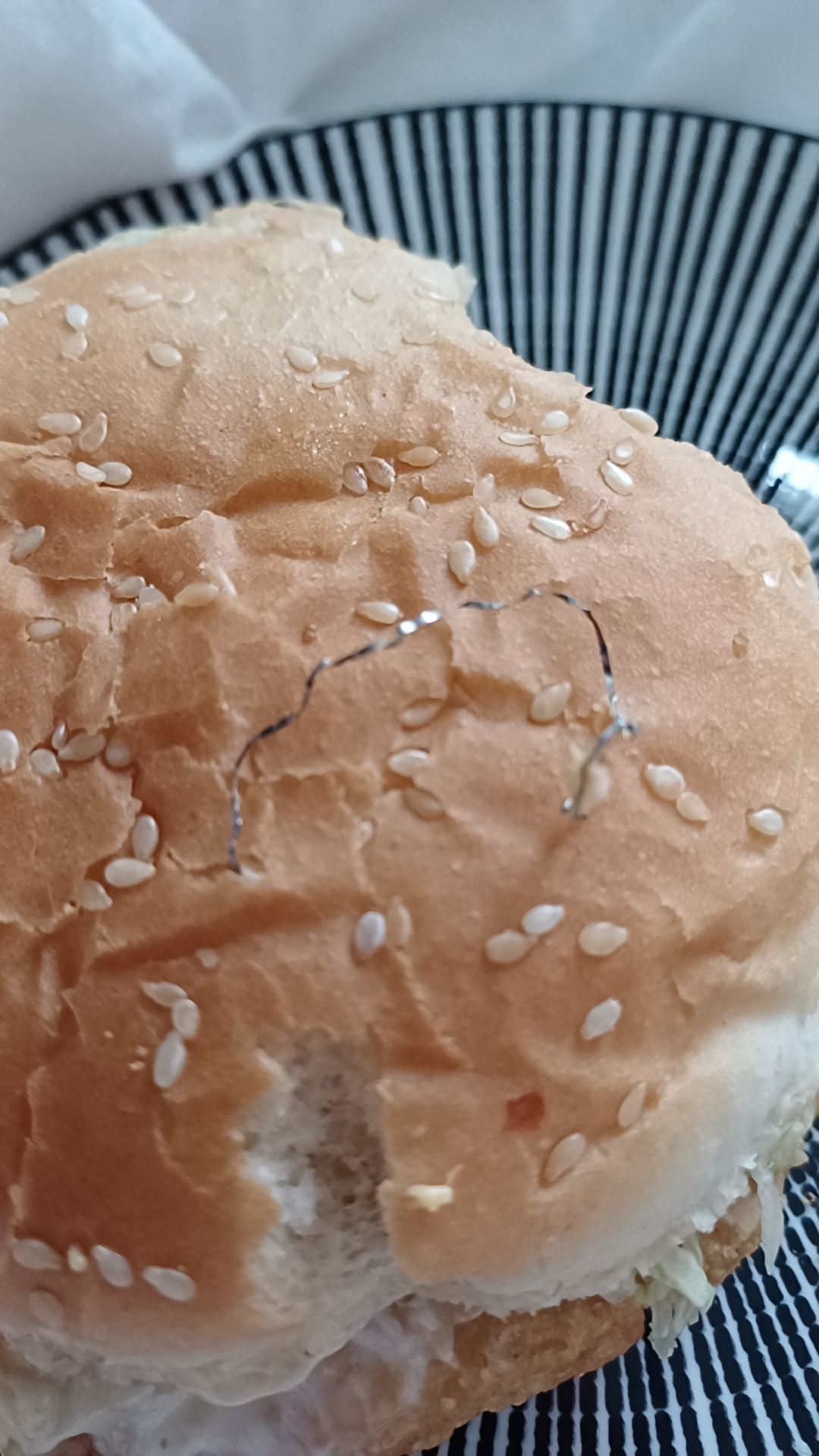 HYGIENE DÉPLORABLE, UN BOUT D'ALUMINIUM QUI RESSEMBLE A UN FIL A EPONGE A GRATTER, A ETE RETROUVÉ DANS LE BURGER DE MON FILS. JE SUIS TRES ENERVÉE