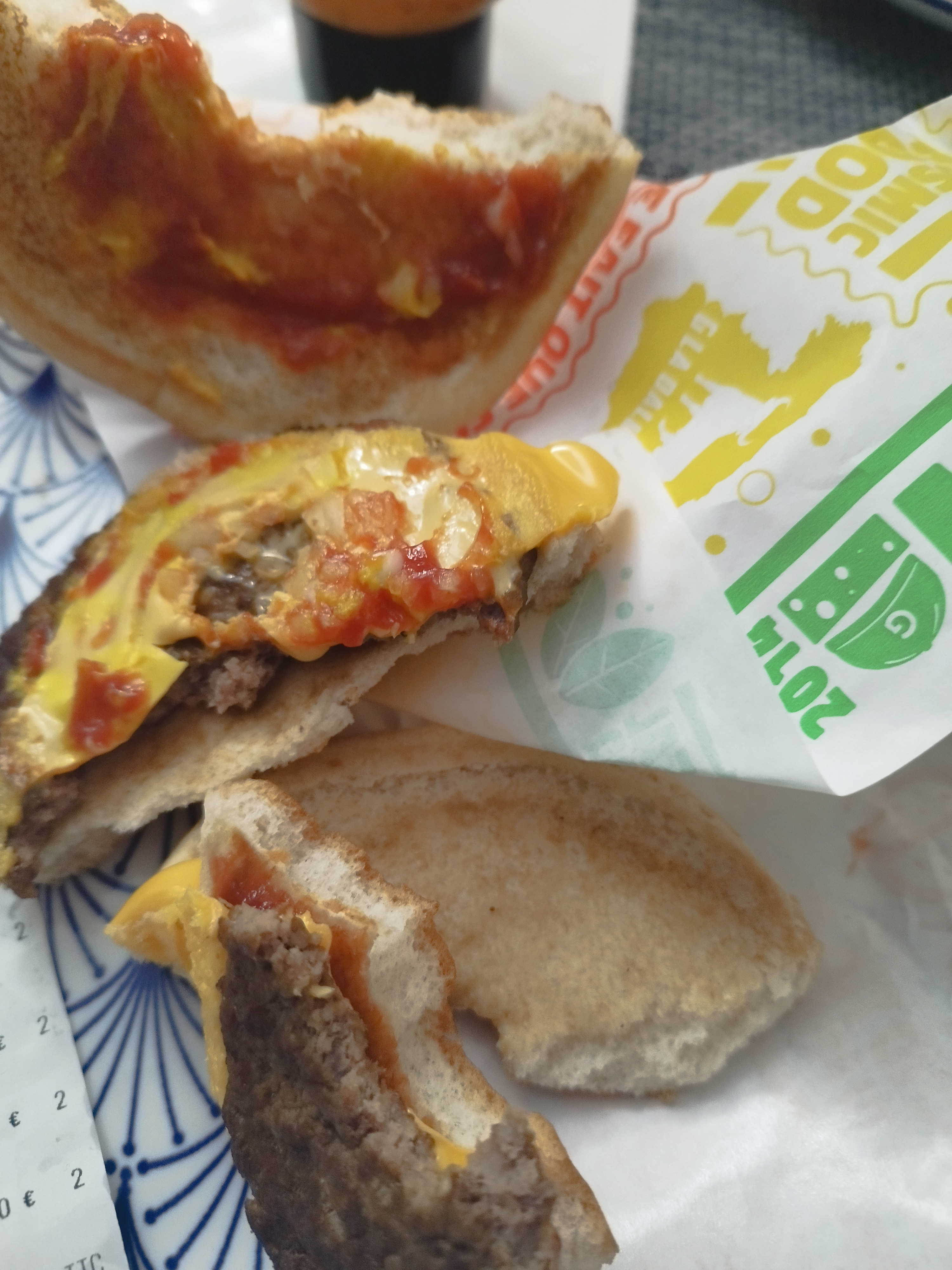 Hamburger bourré+++ de sauce sans aucun goût, fade. J’ai mangé deux fois c’est toujours aussi dégoûtant. Plus jamais je mangerai chez eux. J’avais mal au ventre toute la nuit!!! C’est du pain industriel avec un tonne de sauce!! Bonne sauce!