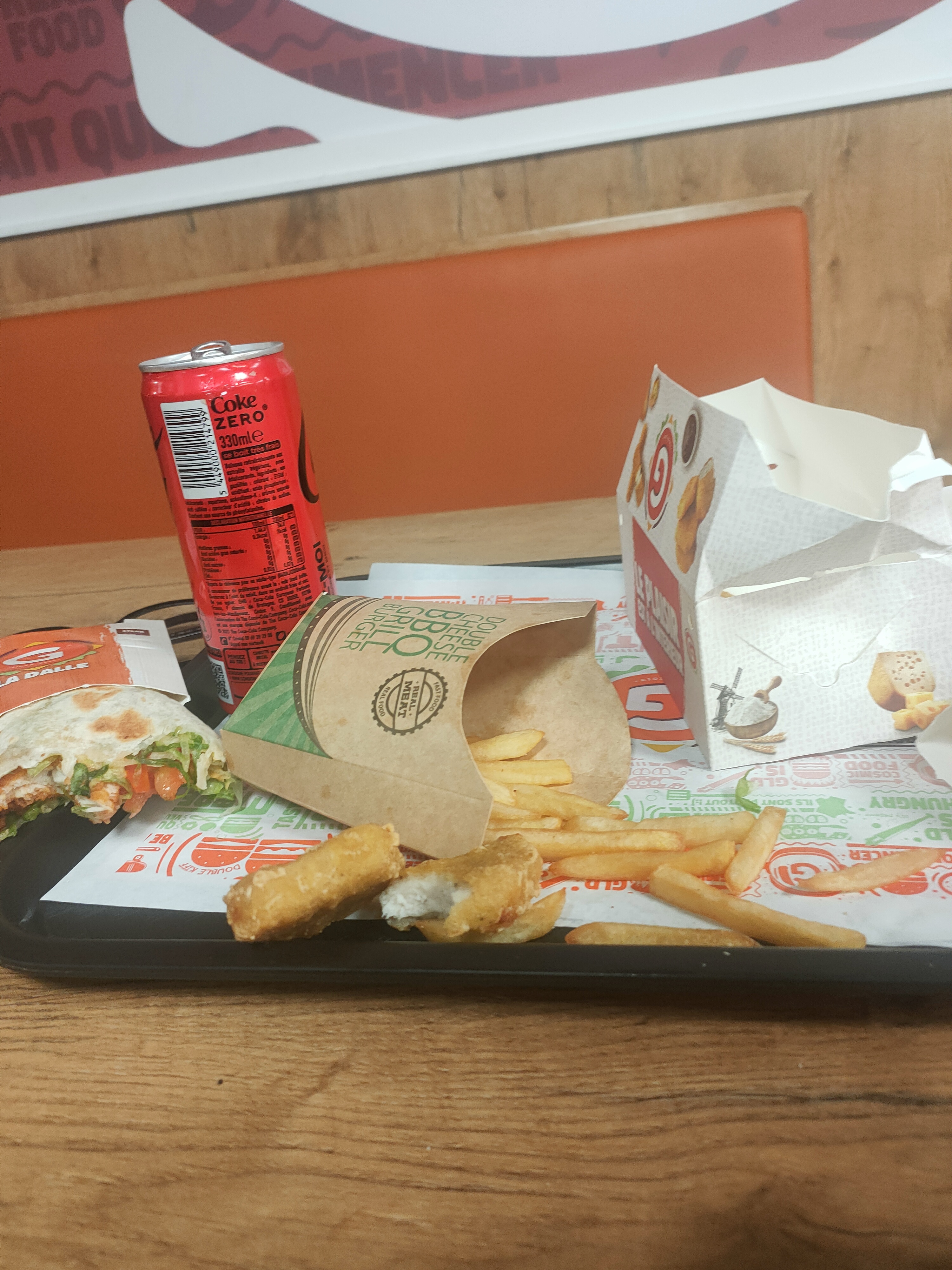 L’expérience culinaire n’était pas extraordinaire mais cela reste un fast food équivalent à Quick mac do ou Burger King . J’ai mis 5 étoiles car on a malencontreusement jeté avec le plateau l’appareil dentaire de ma nièce … Enzo un jeune employé nous a non seulement sorti la grande poubelle à l’extérieur mais il nous a aussi aidé à le retrouver en fouillant toute la poubelle (nous avons passé 20 bonnes minutes). Il a refusé qu’on lui donne une pourboire pour cela et je tenais donc à mettre 5 étoiles et a encore le remercier a travers ce commentaire.
